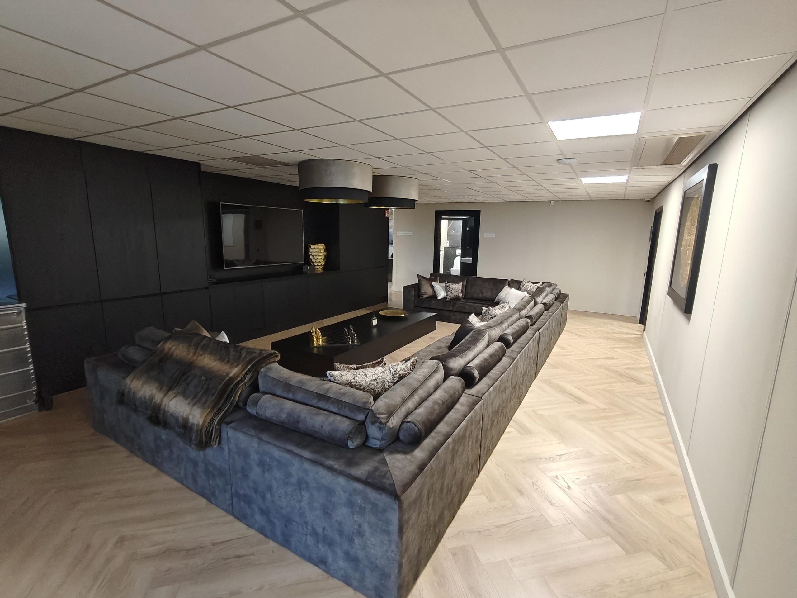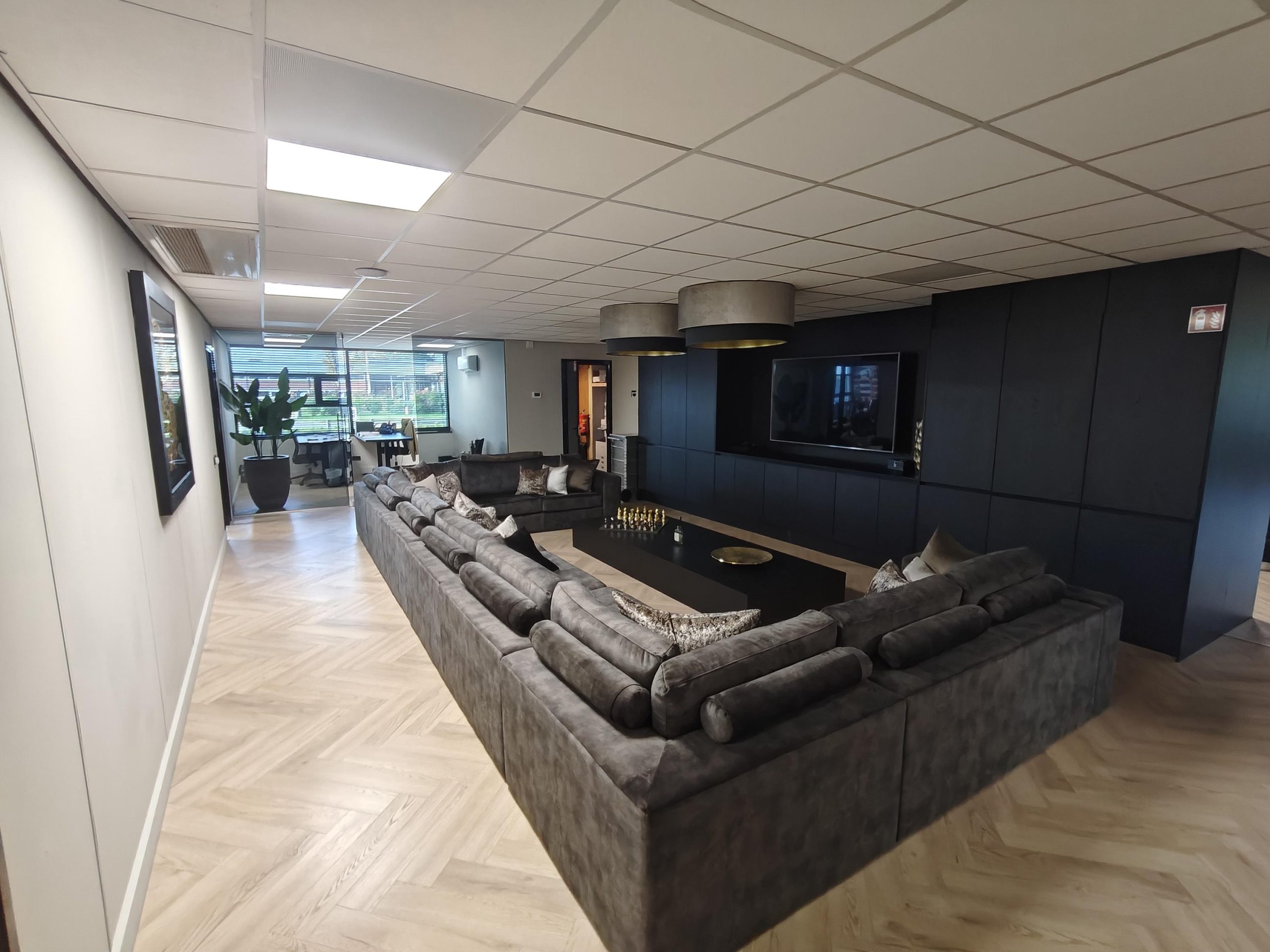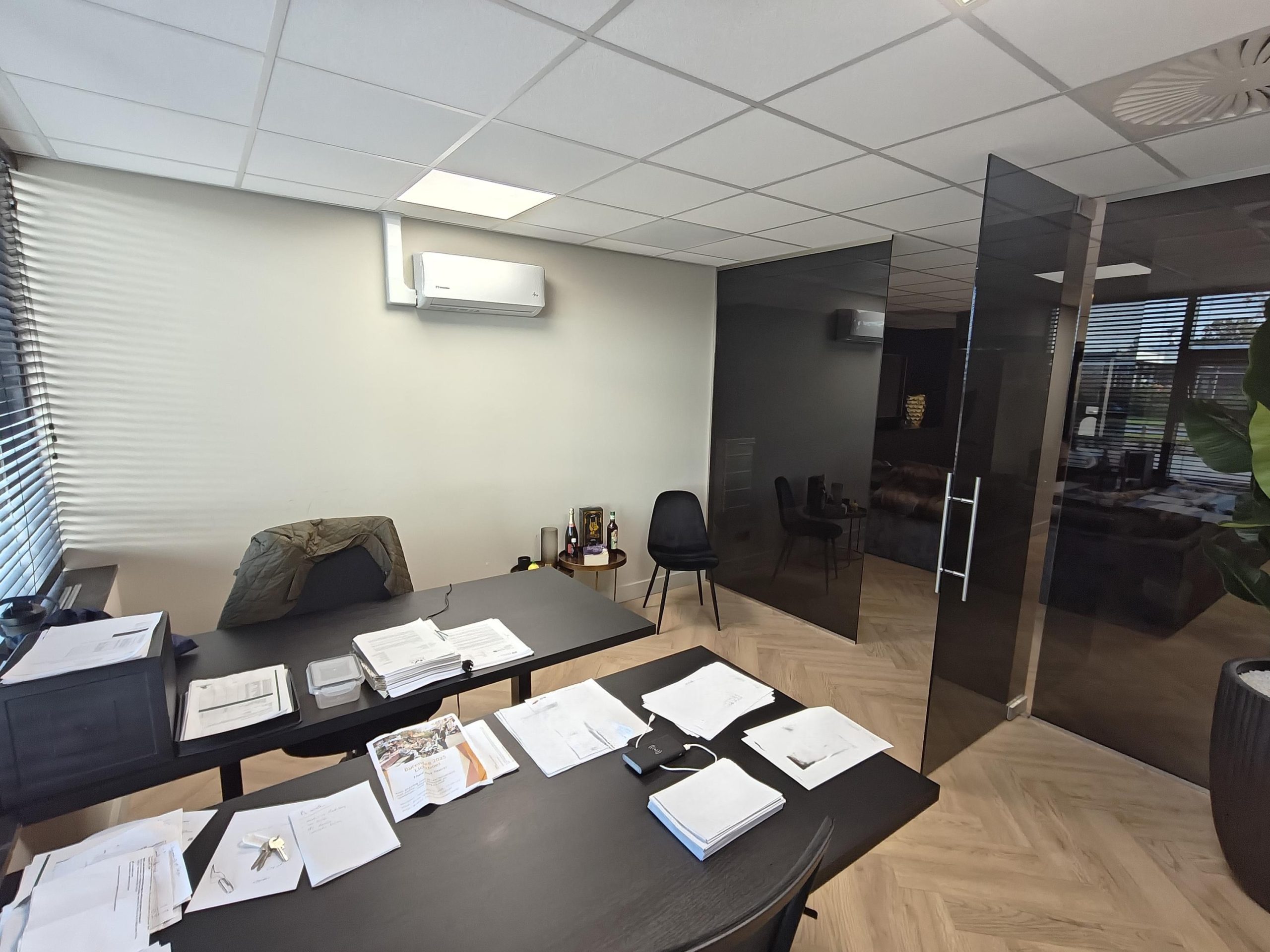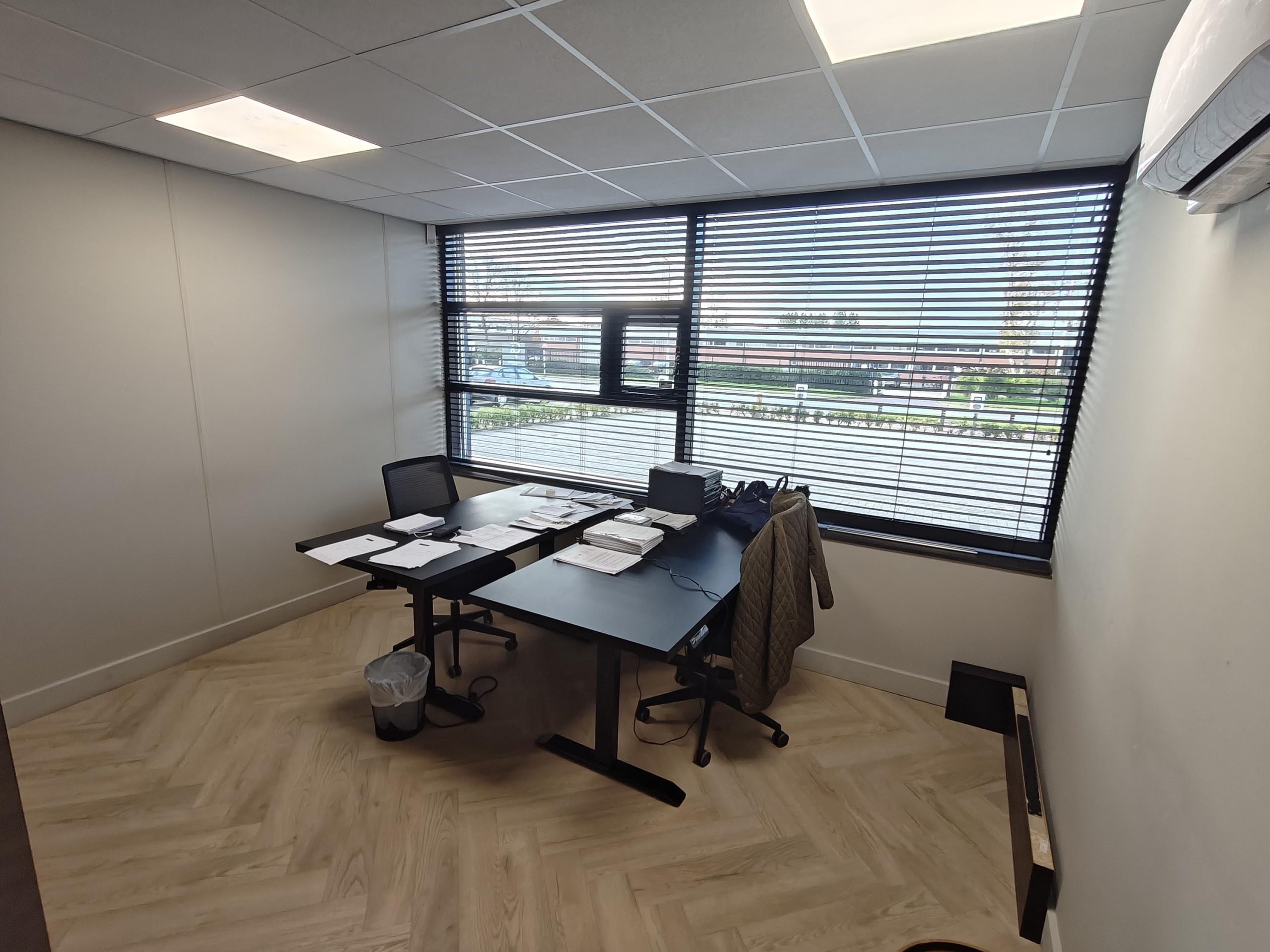 Visgraatvloer, systeemplafond met ledverlichting, pantry met koelkast, airco, zonwering en sanitaire voorzieningen.
