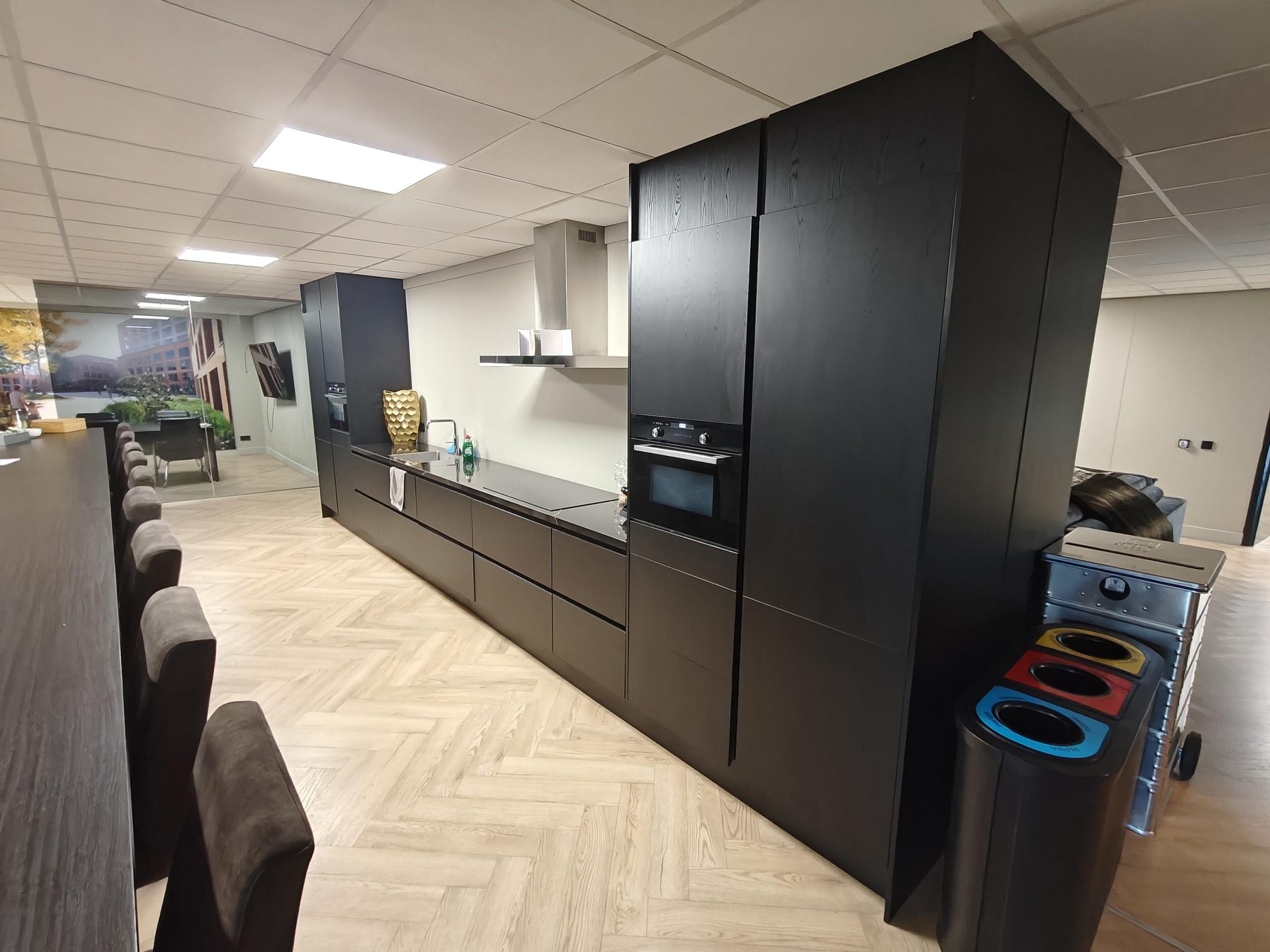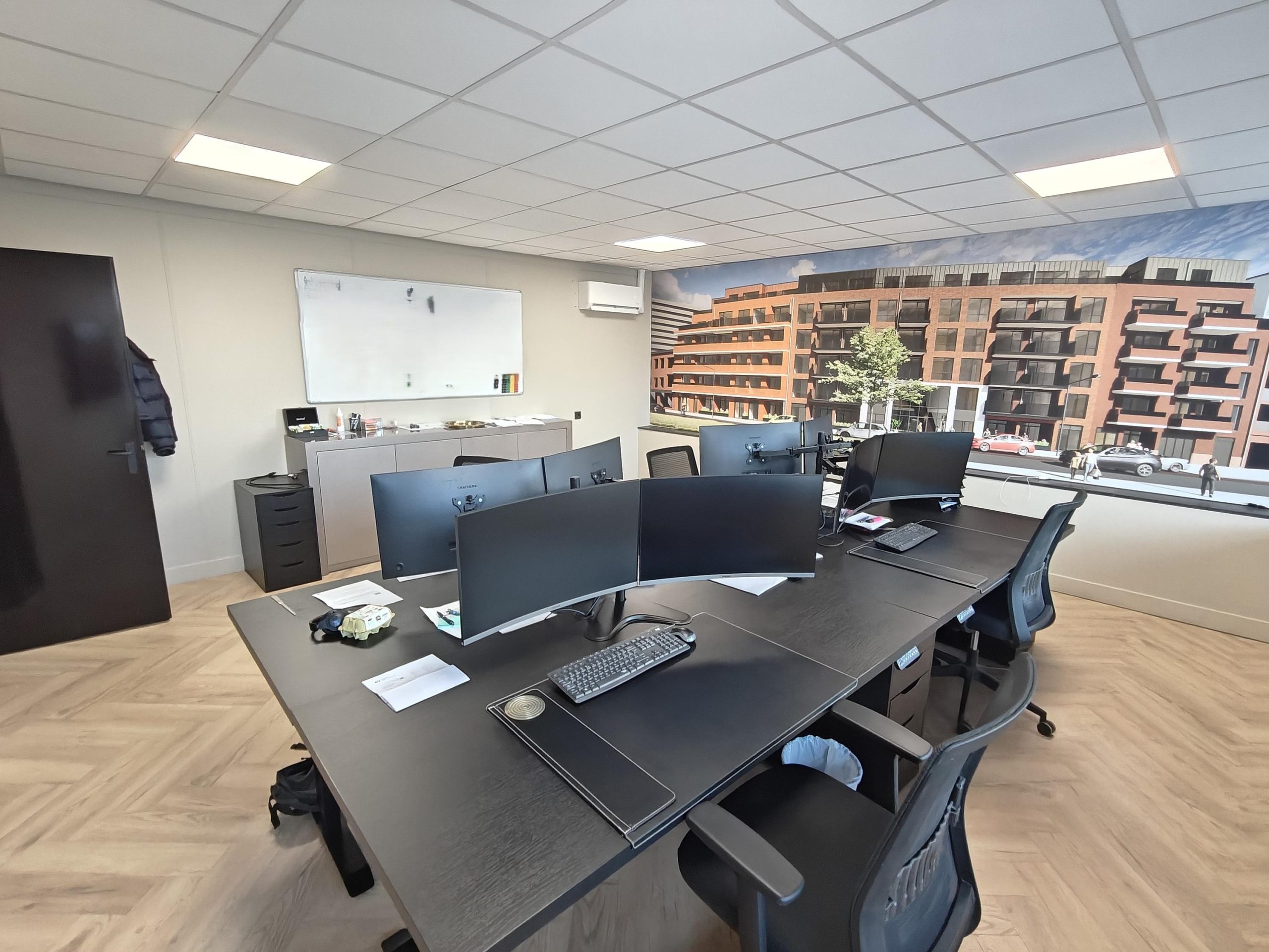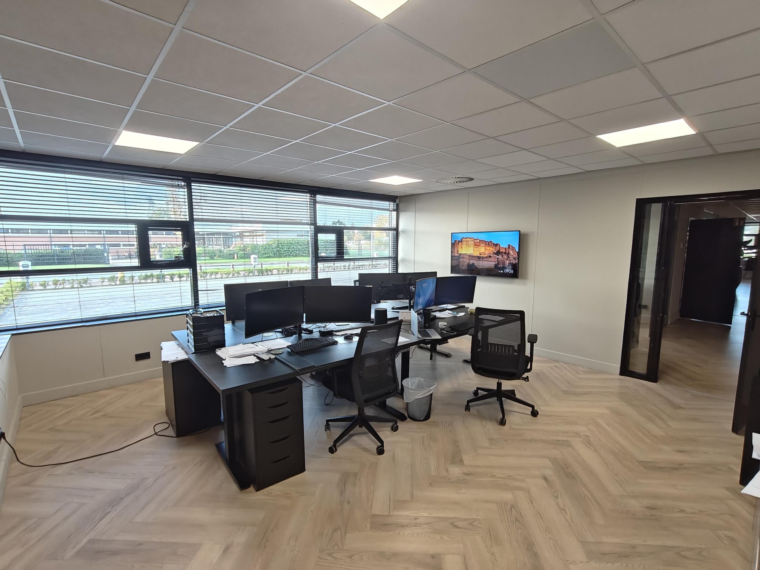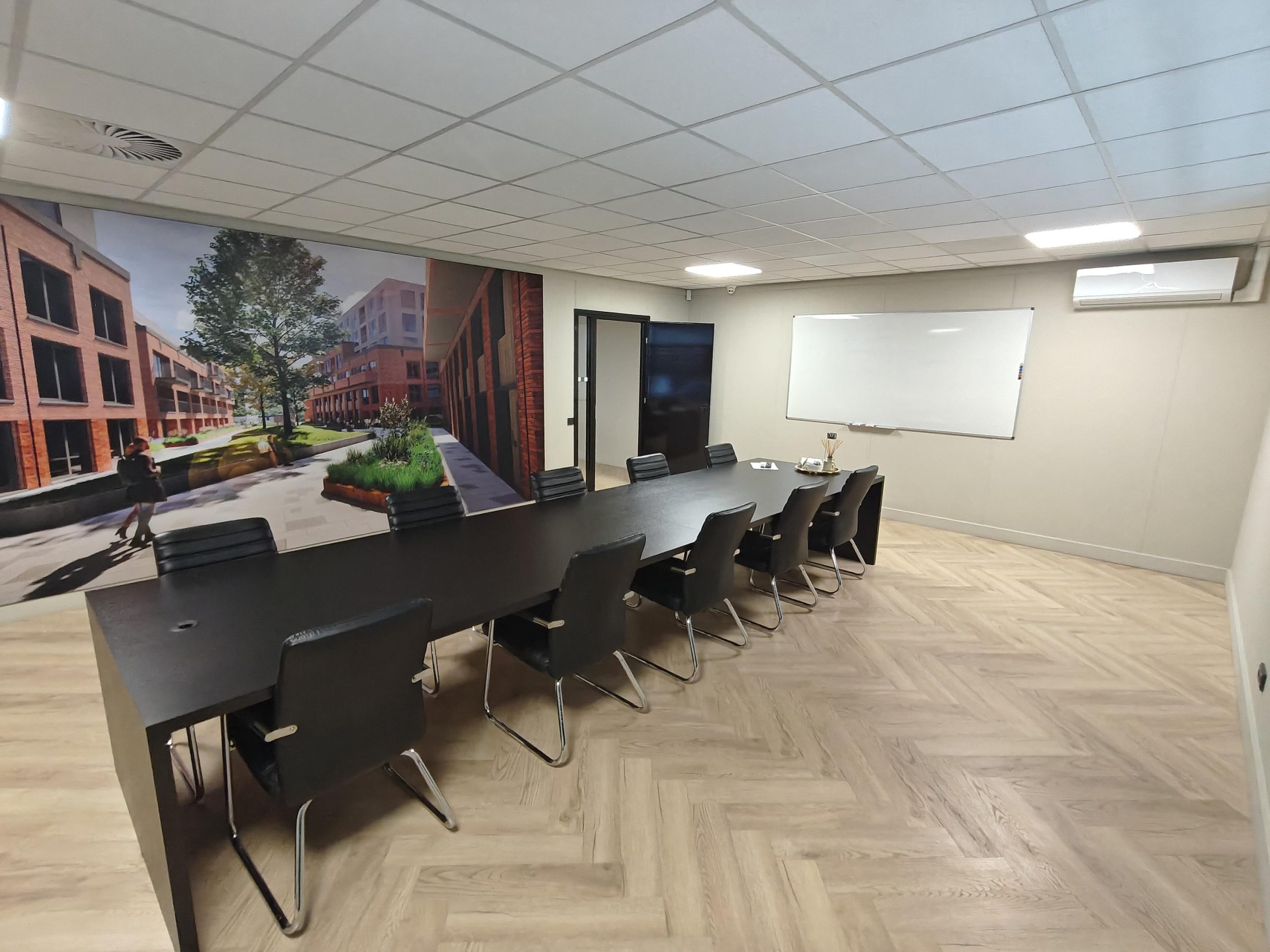 Visgraatvloer, systeemplafond met ledverlichting, pantry met koelkast, airco, zonwering en sanitaire voorzieningen.