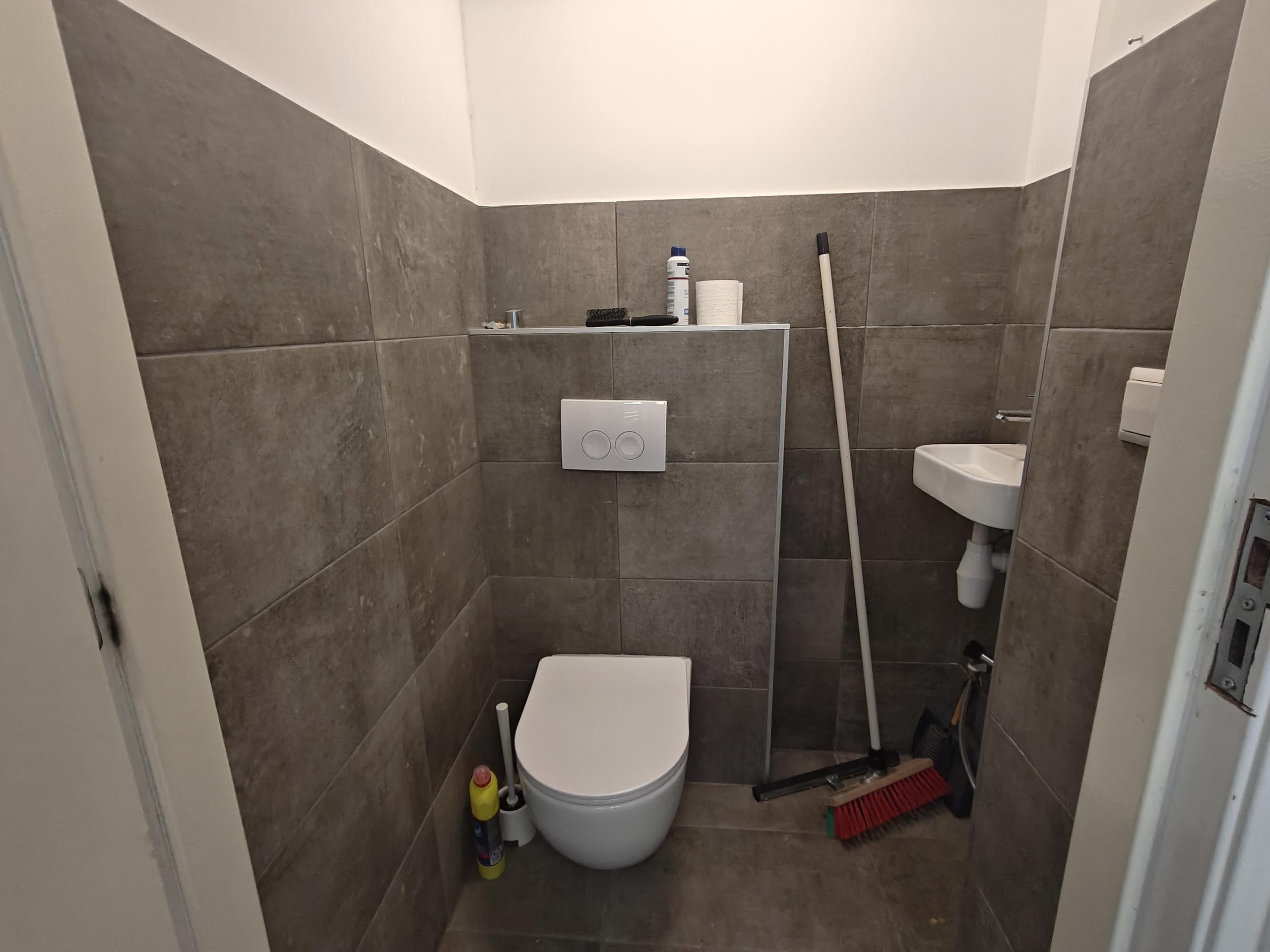 Laminaatvloer, stroompunten, pantry, airco en een toilet met fontein.