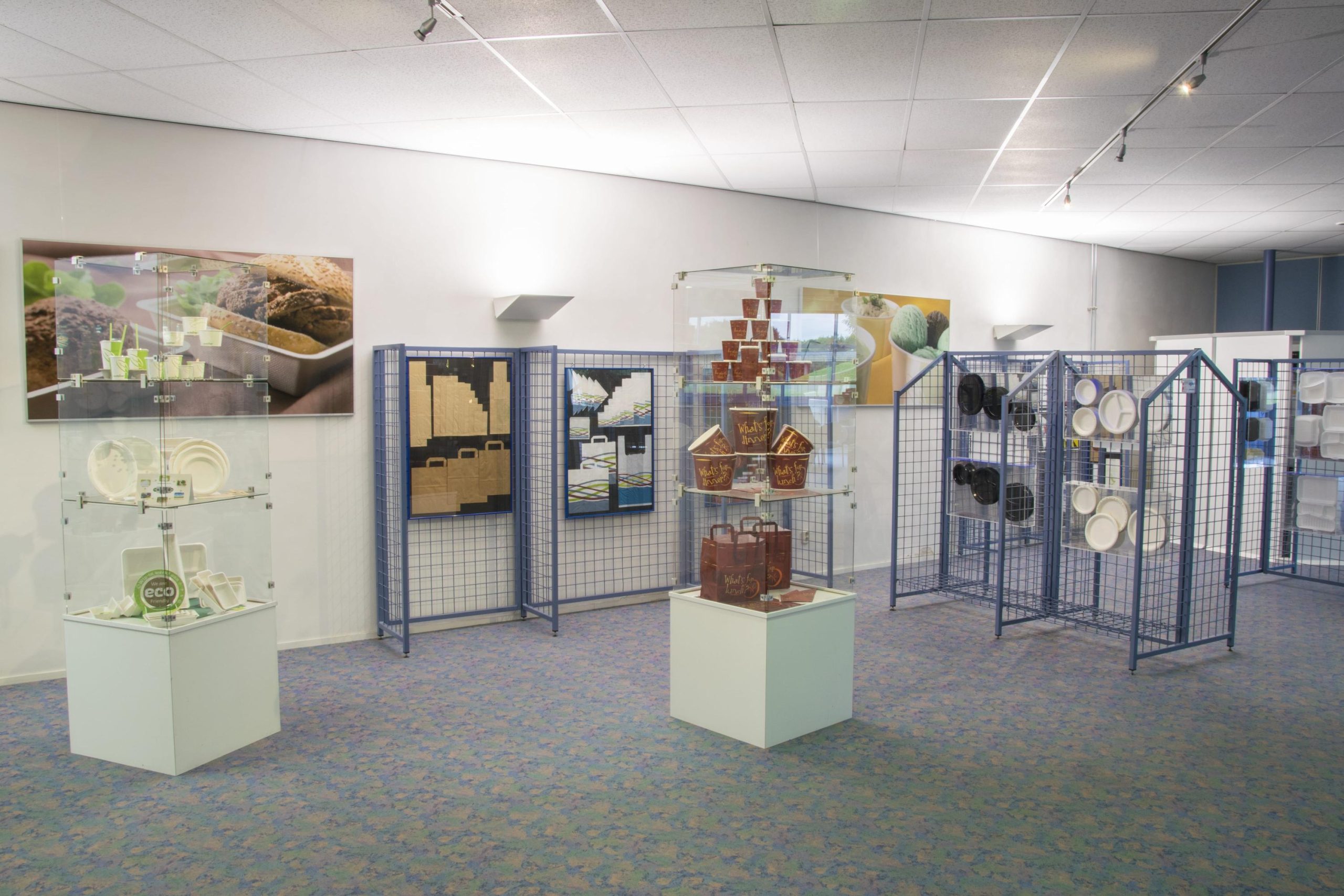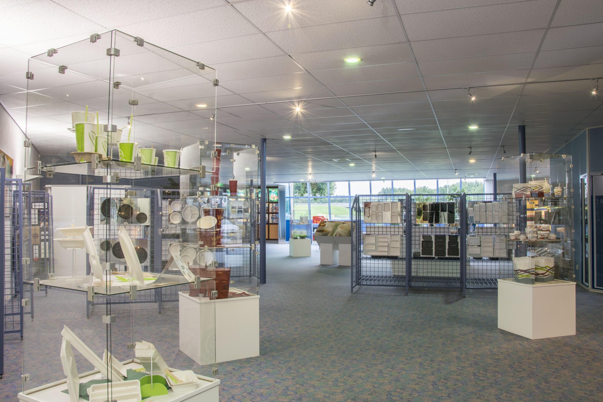 Kantoor / showroom: Systeemplafond met spotjes, stroompunten, vloerbedekking, pantry en sanitaire voorzieningen.