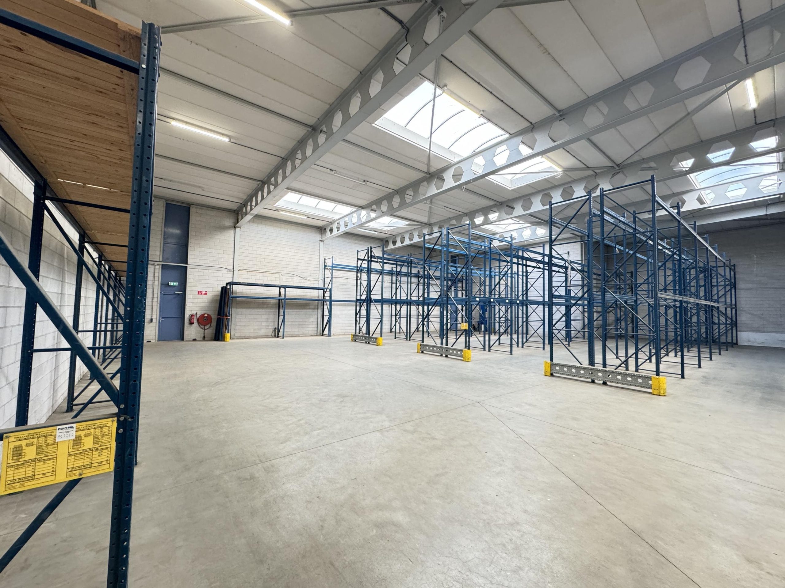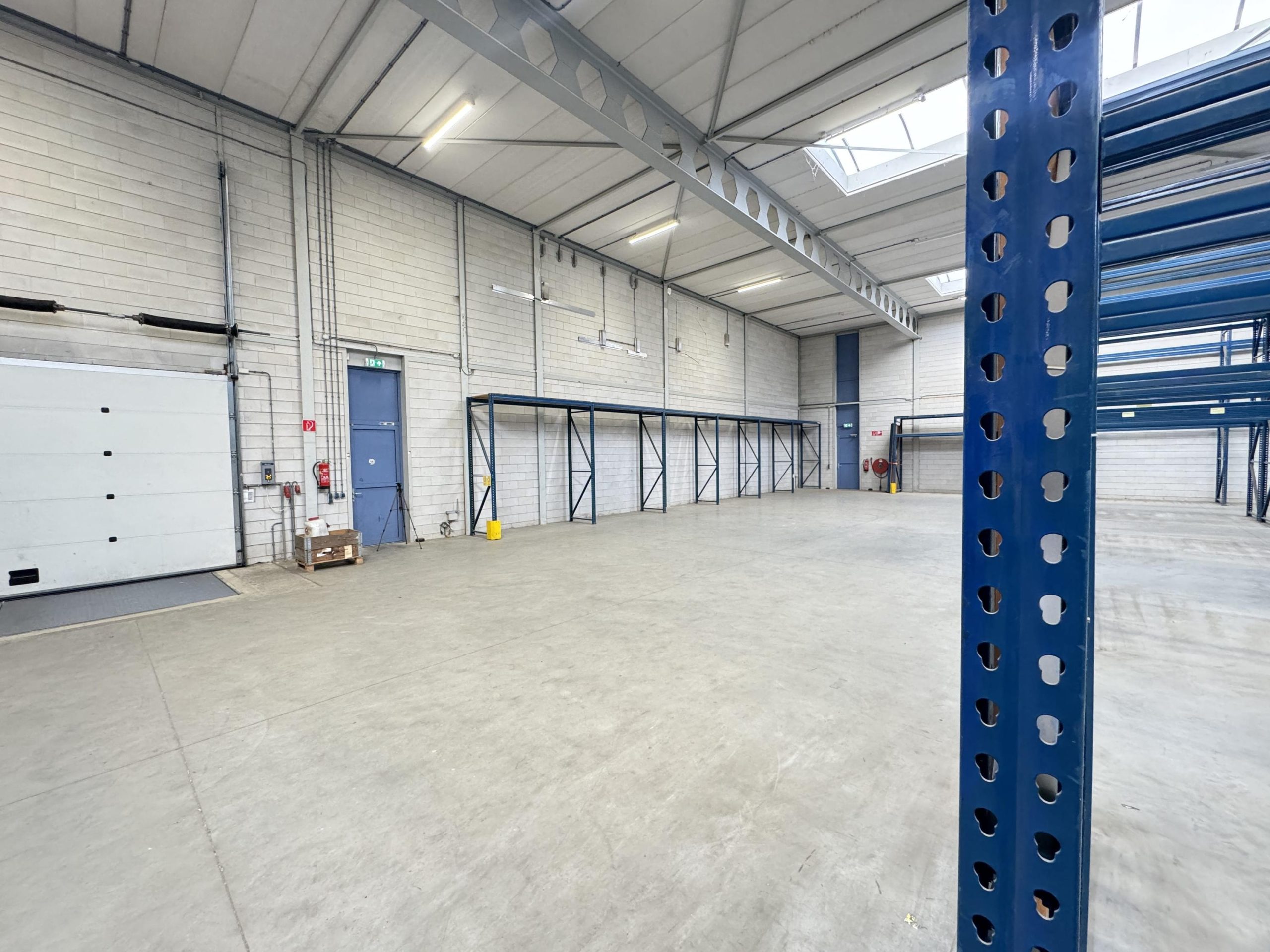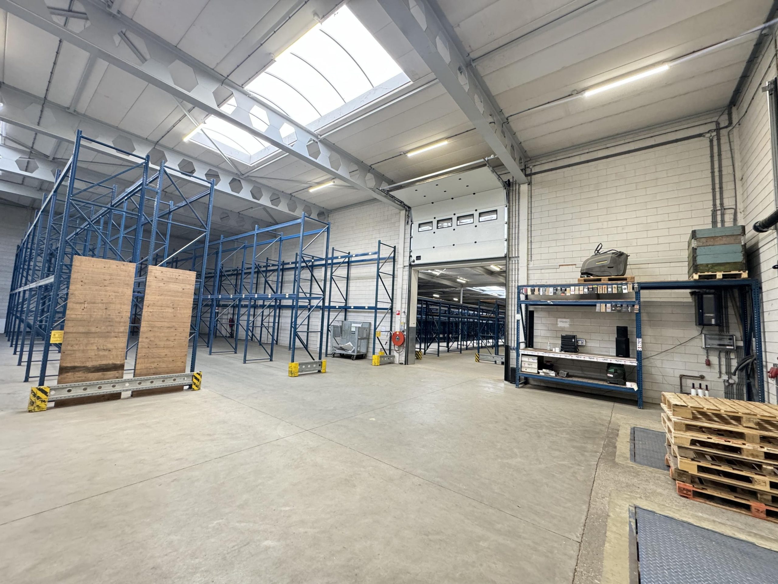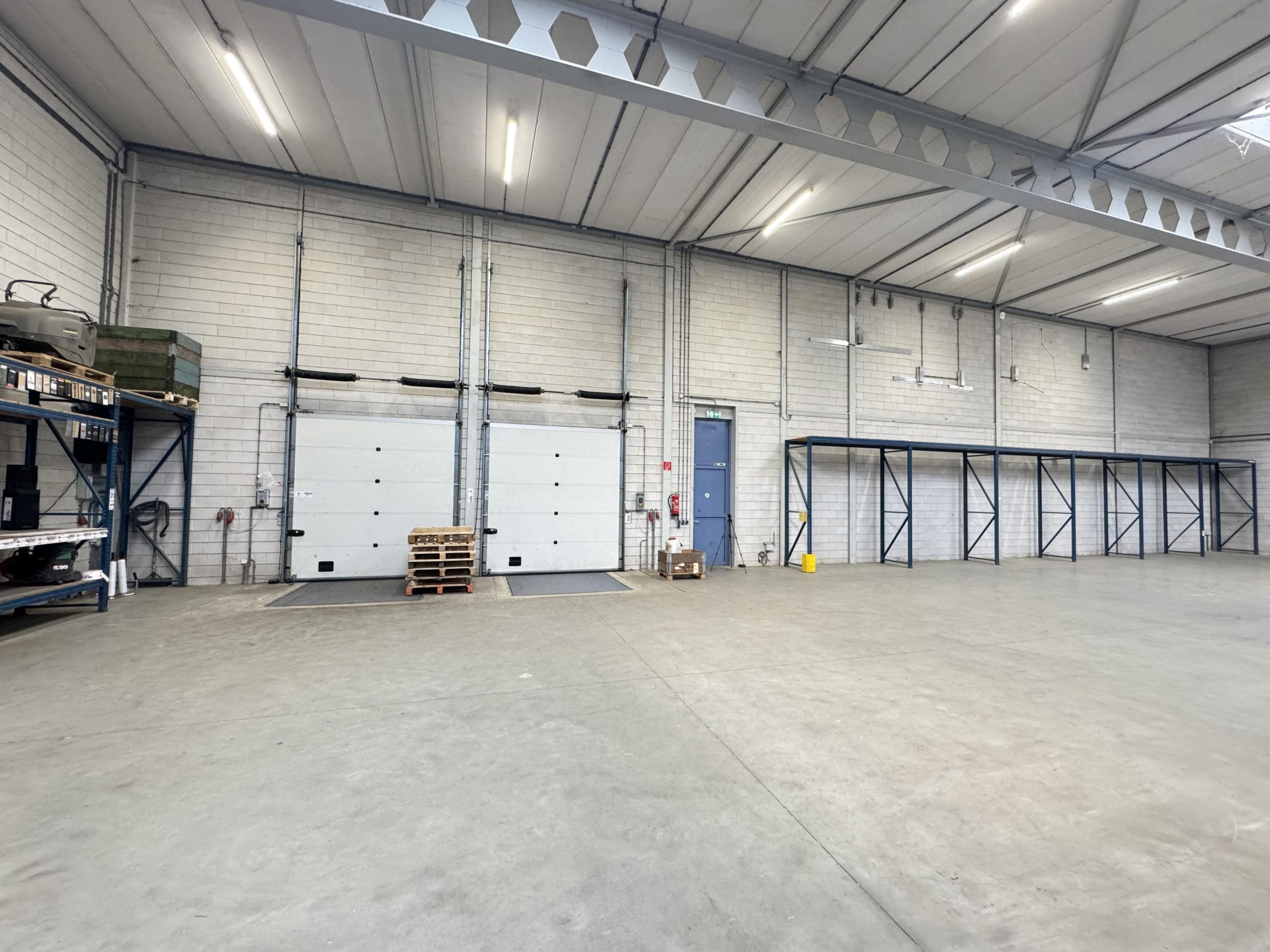 Bedrijfsruimte: Twee overheaddeuren, twee loading docks, gevlinderde betonvloer, energiezuinige lichtstraten die zijn voorzien van sensoren, krachtstroom en brandblussers.