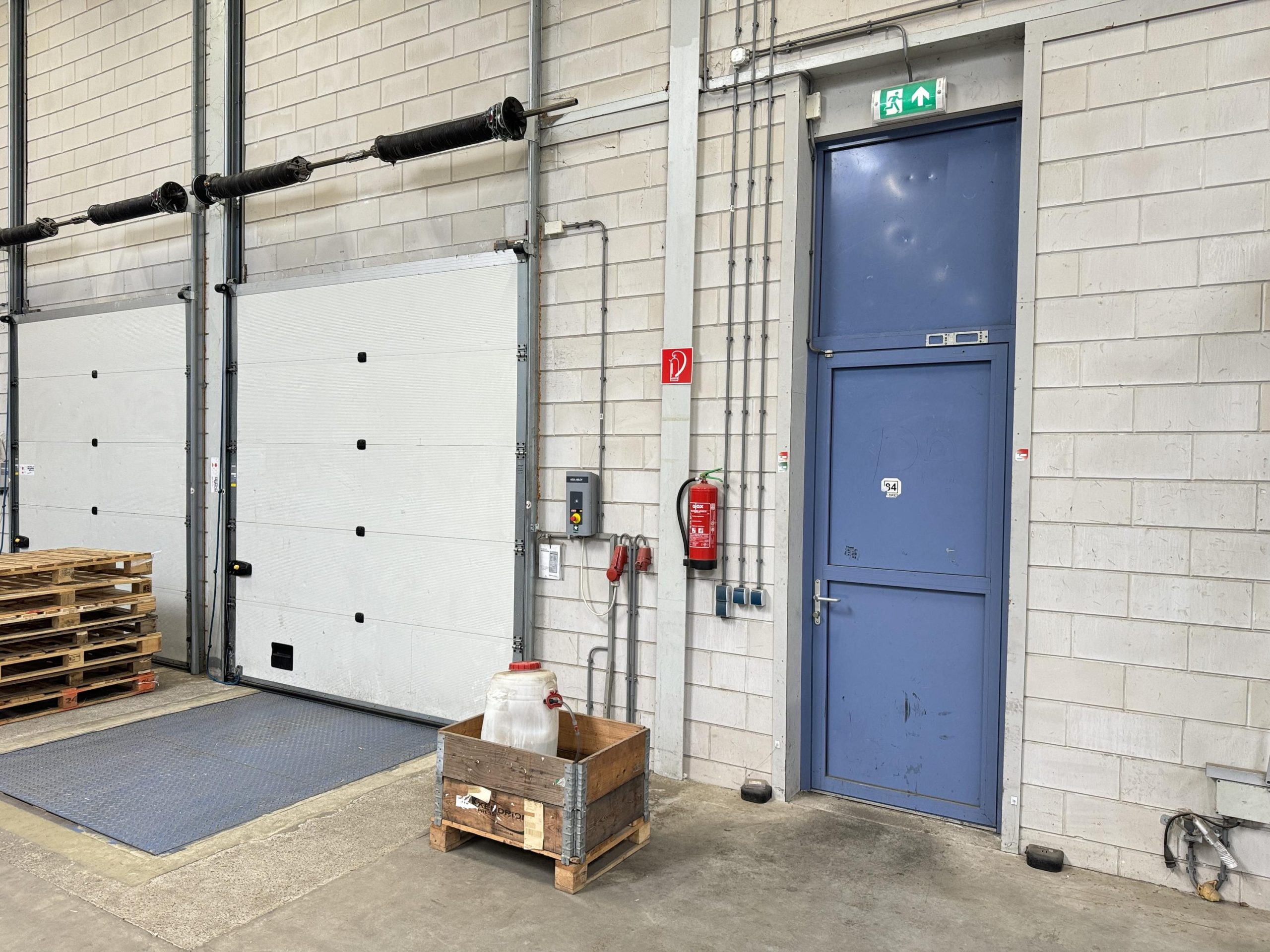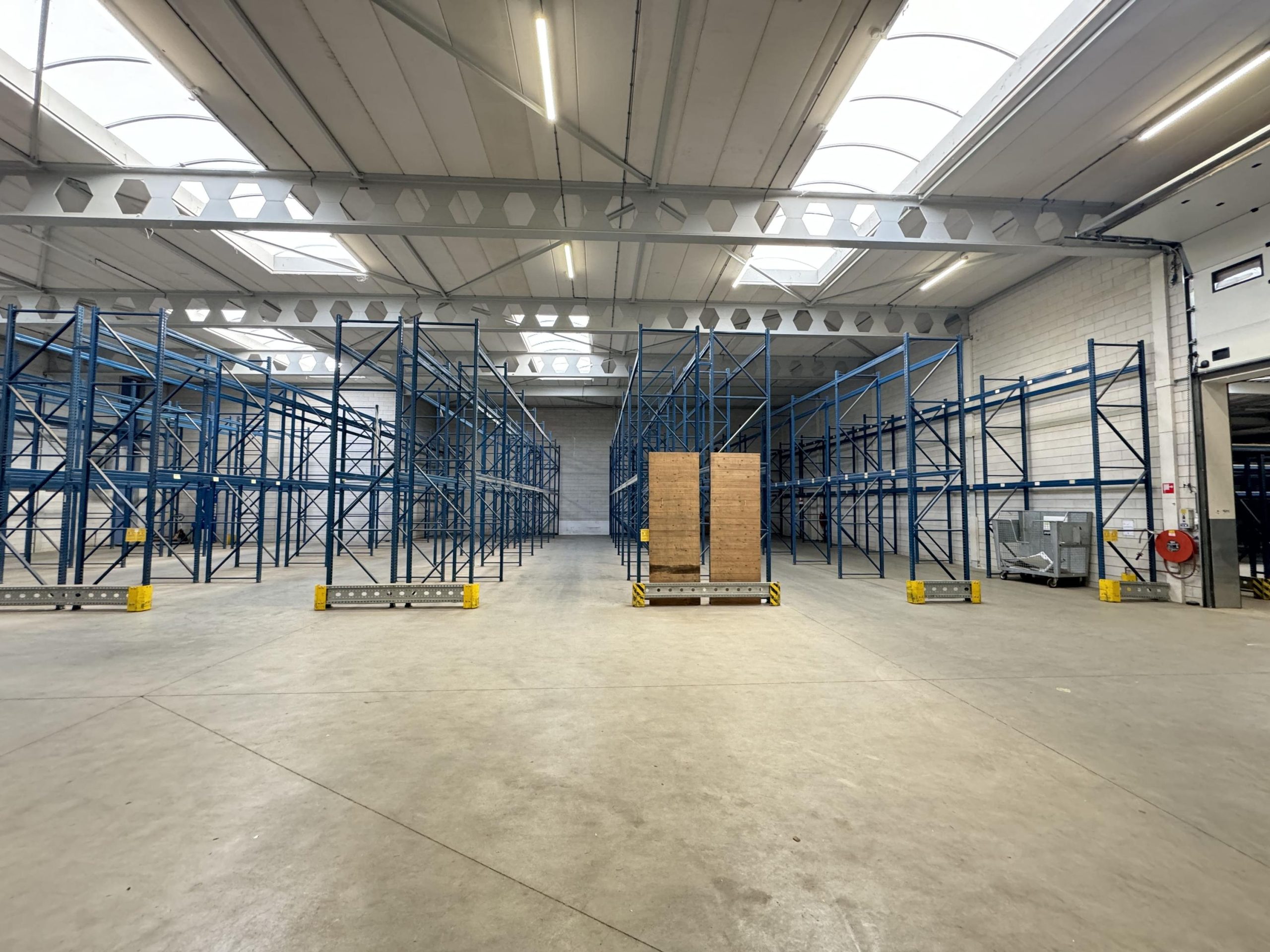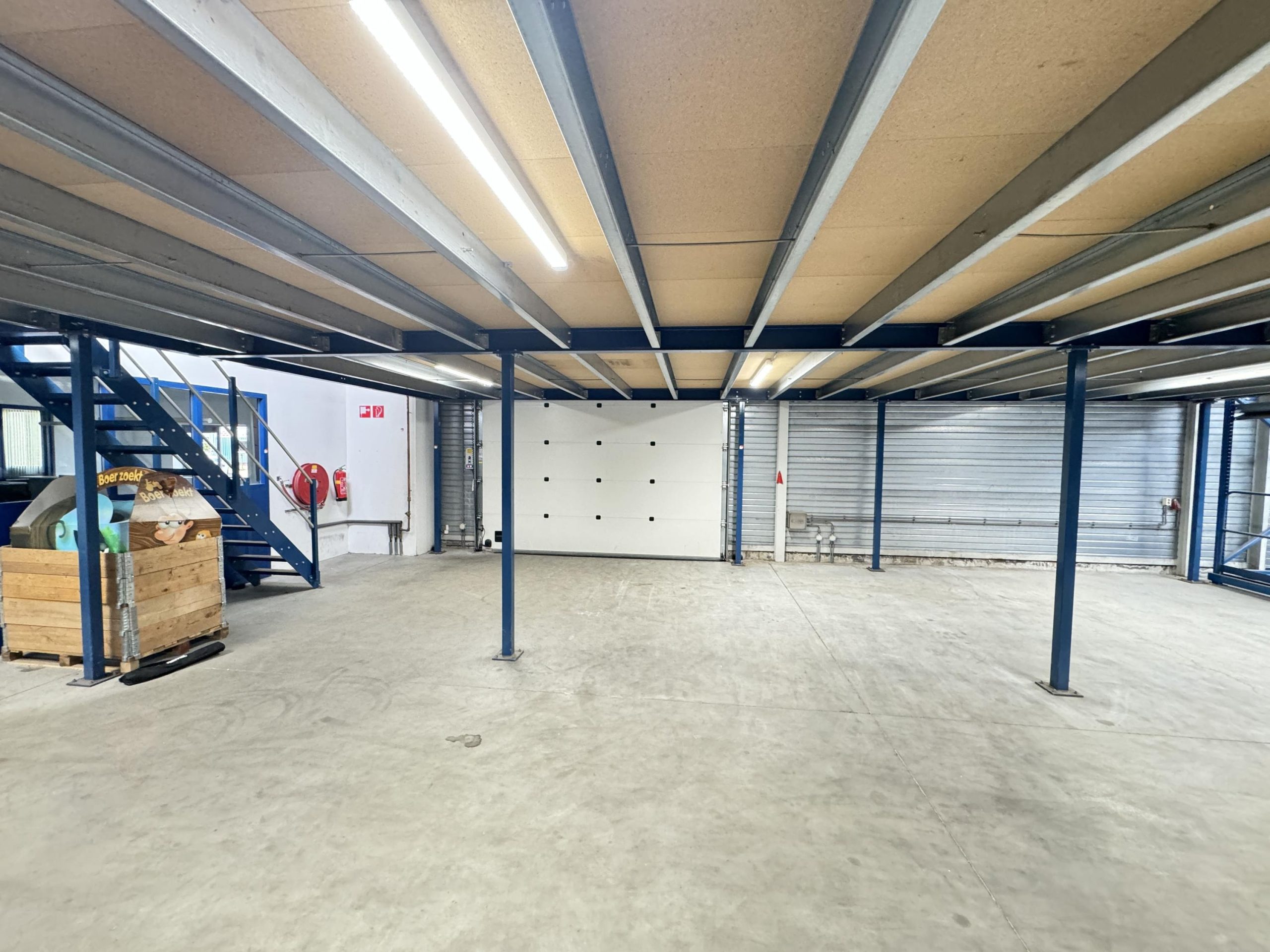 Bedrijfsruimte: Twee overheaddeuren, twee loading docks, gevlinderde betonvloer, energiezuinige lichtstraten die zijn voorzien van sensoren, krachtstroom en brandblussers.