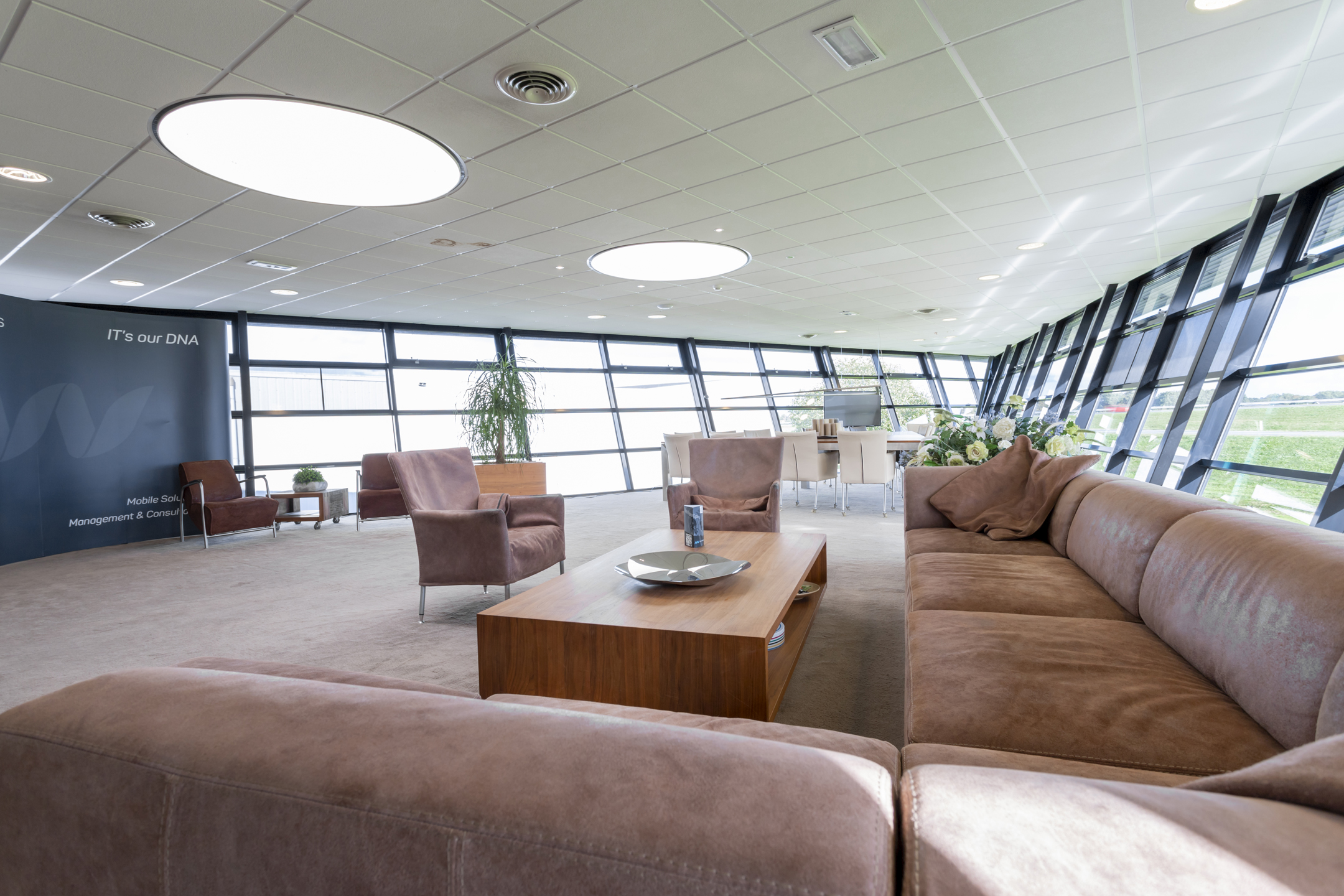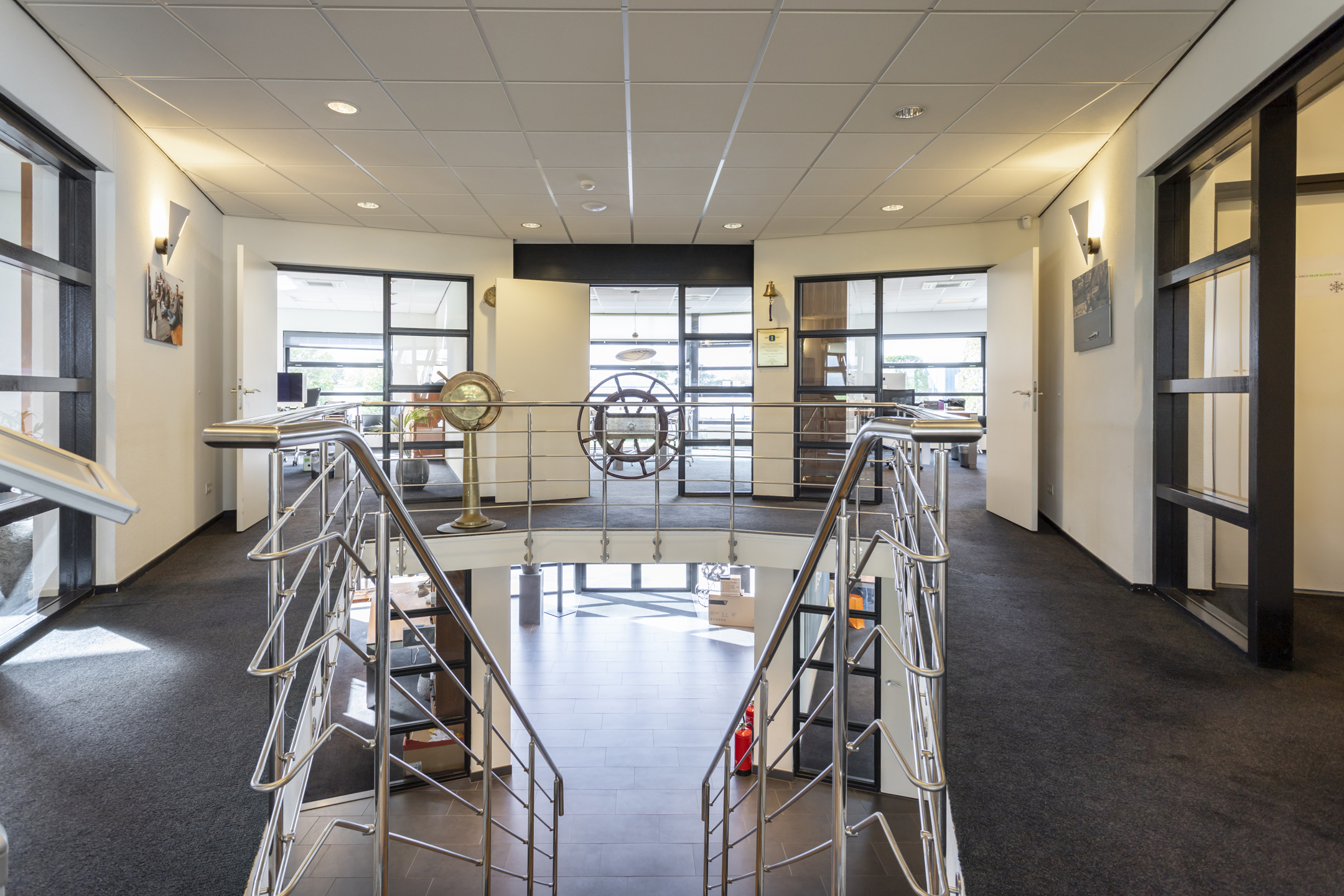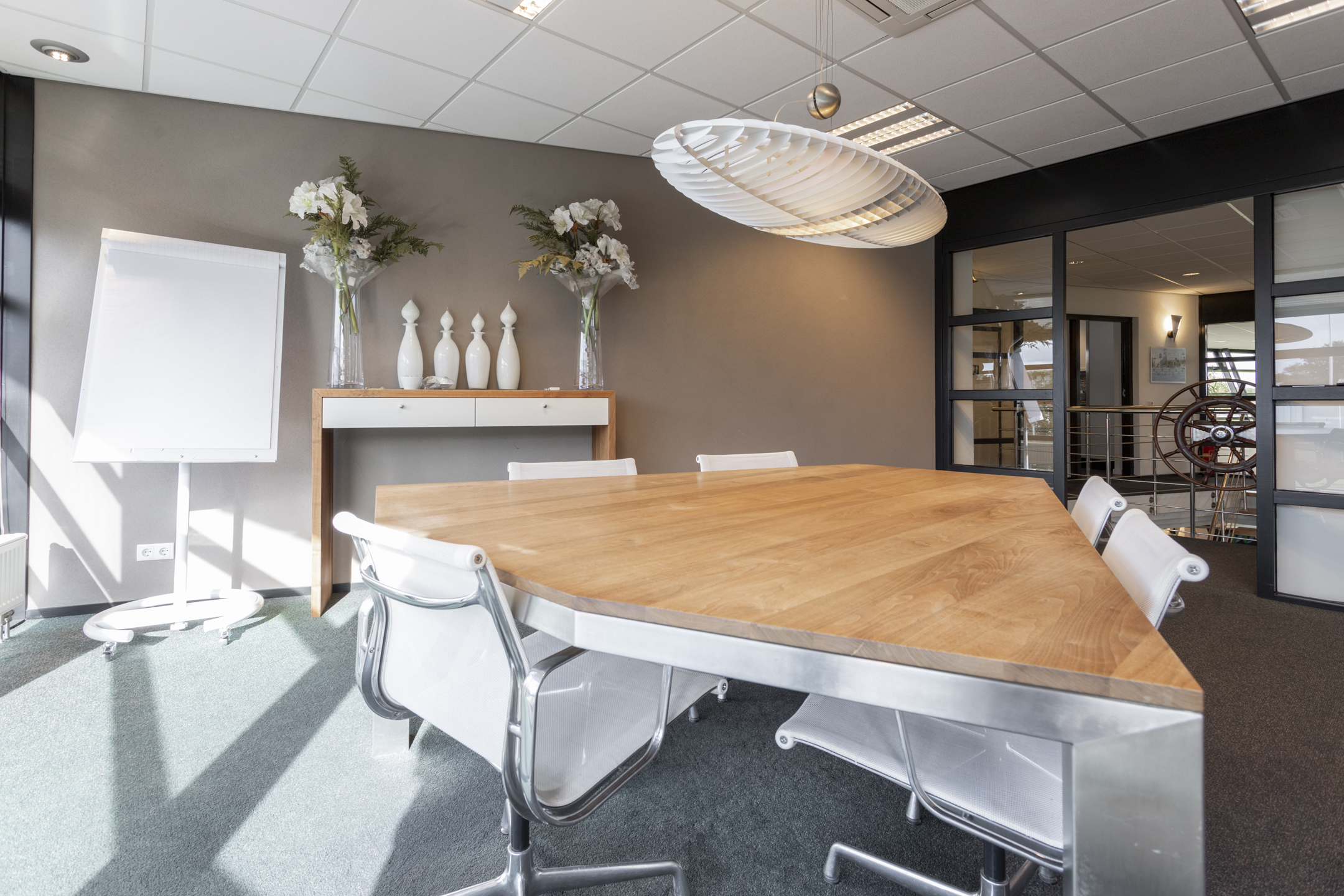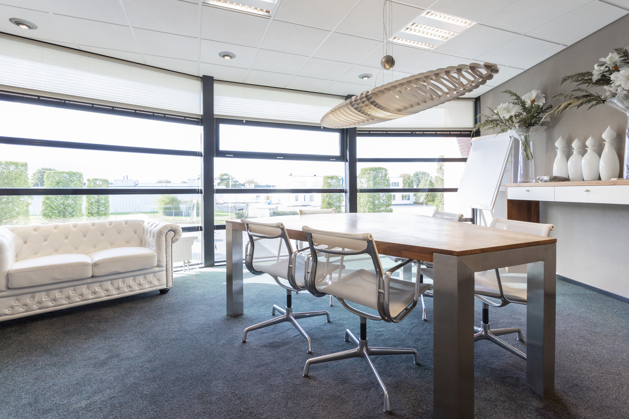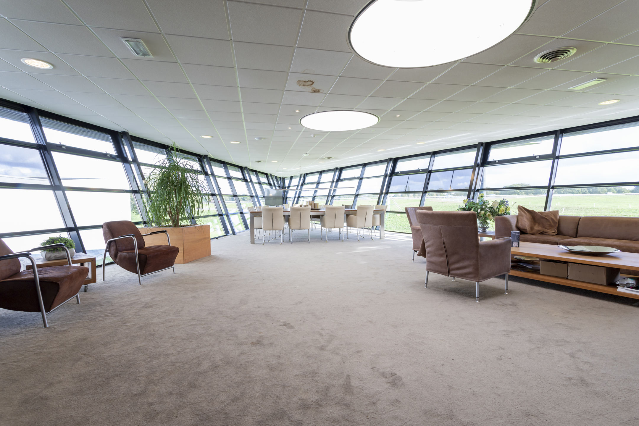 Systeemplafond met spotjes, vloerbedekking, airco, luxe sanitair, luxe pantry, kamerindeling en een unieke vergaderzaal met veel lichtinval.
