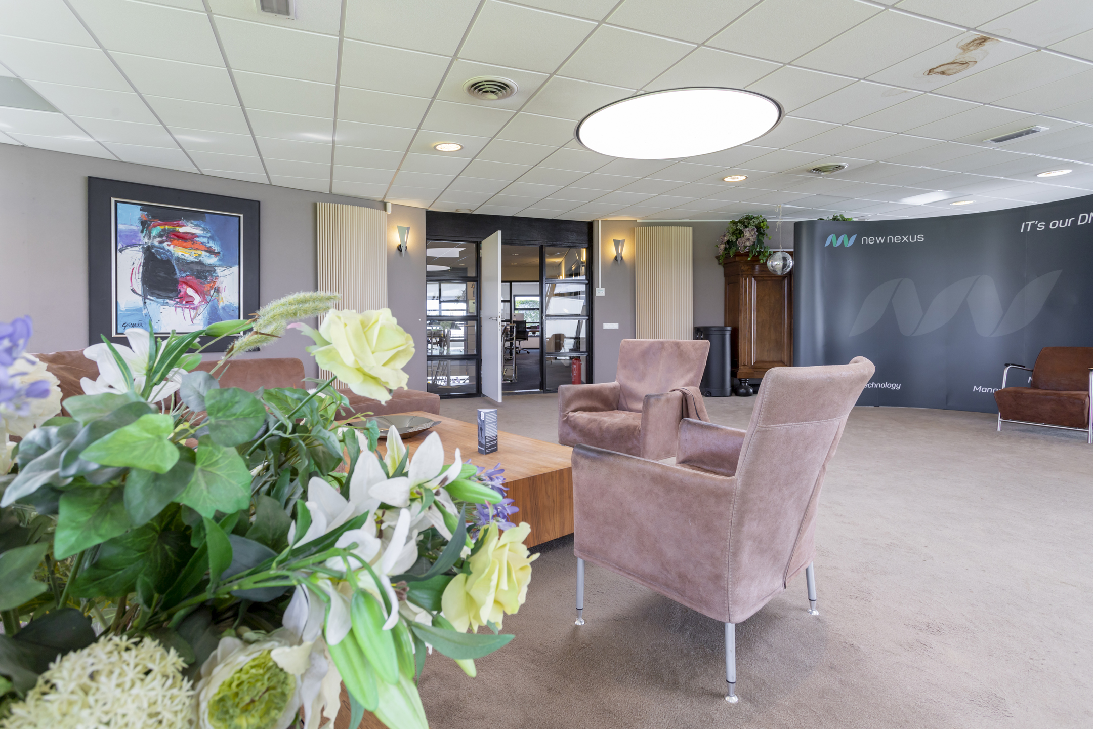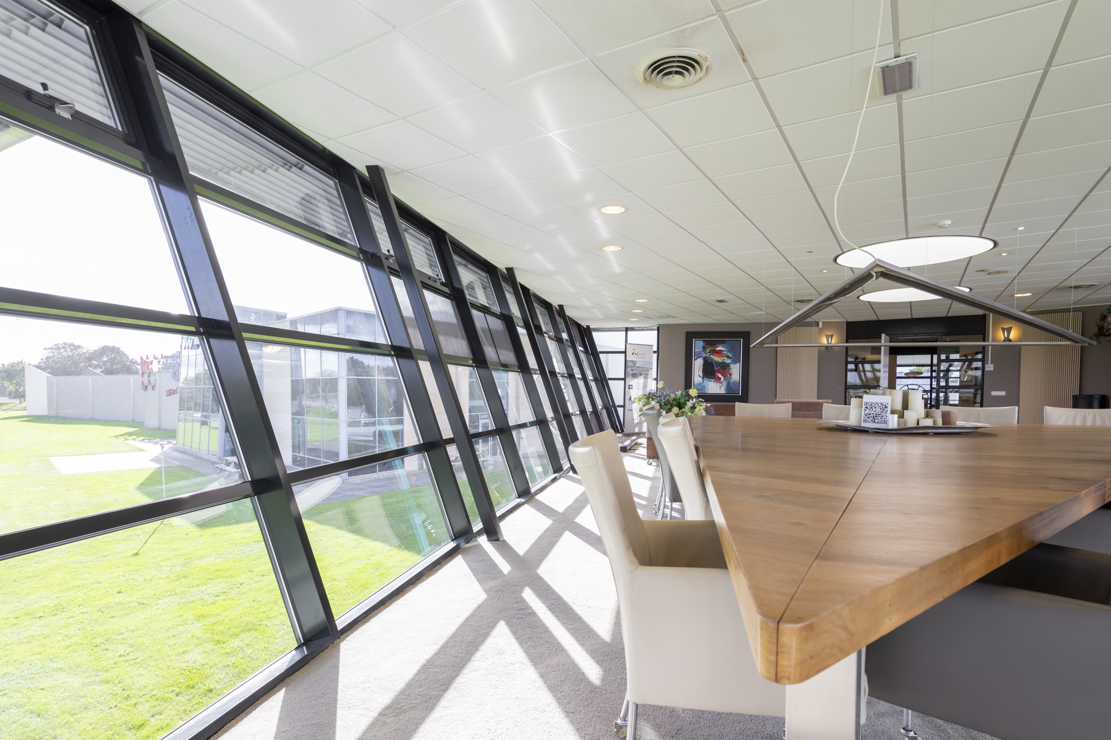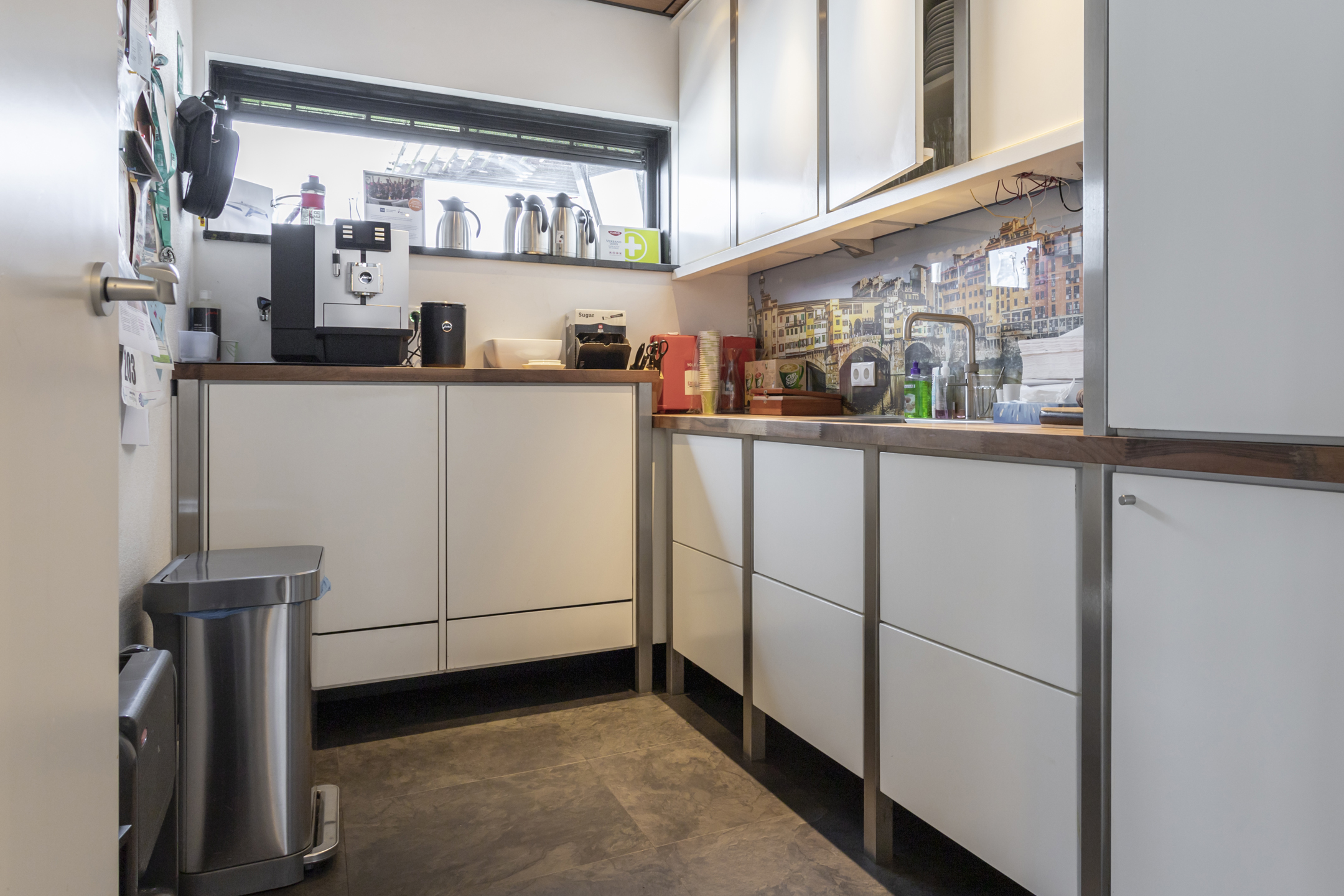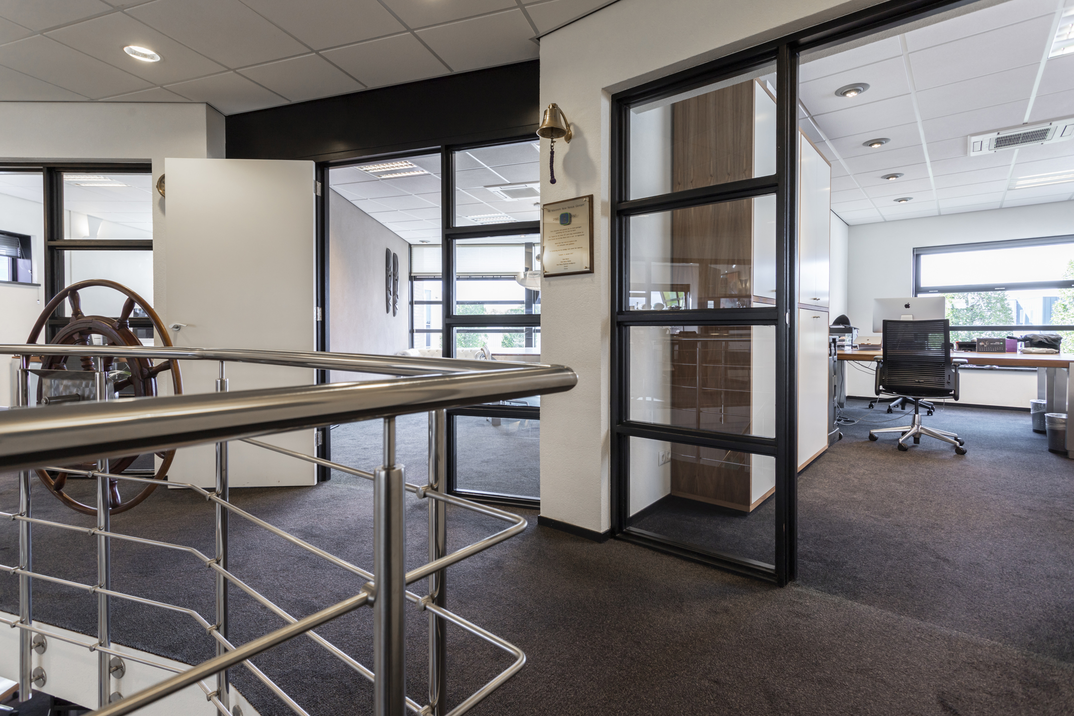 Systeemplafond met spotjes, vloerbedekking, airco, luxe sanitair, luxe pantry, kamerindeling en een unieke vergaderzaal met veel lichtinval.