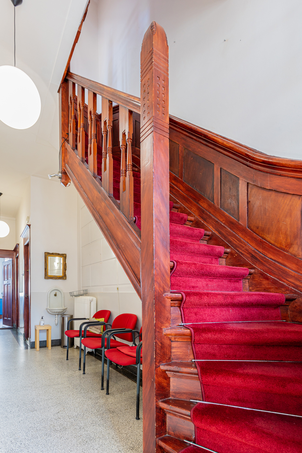 Begane grond: Hal/entree, wachtkamer, toilet, einde van de gang een ruime keuken met buitenplaats, vanuit de gang een trap naar de 1e verdieping met onder andere de kantoor/praktijkruimte van 21 m2 en 6 m2. Vanuit de gang toegang tot gedeeld toilet.
