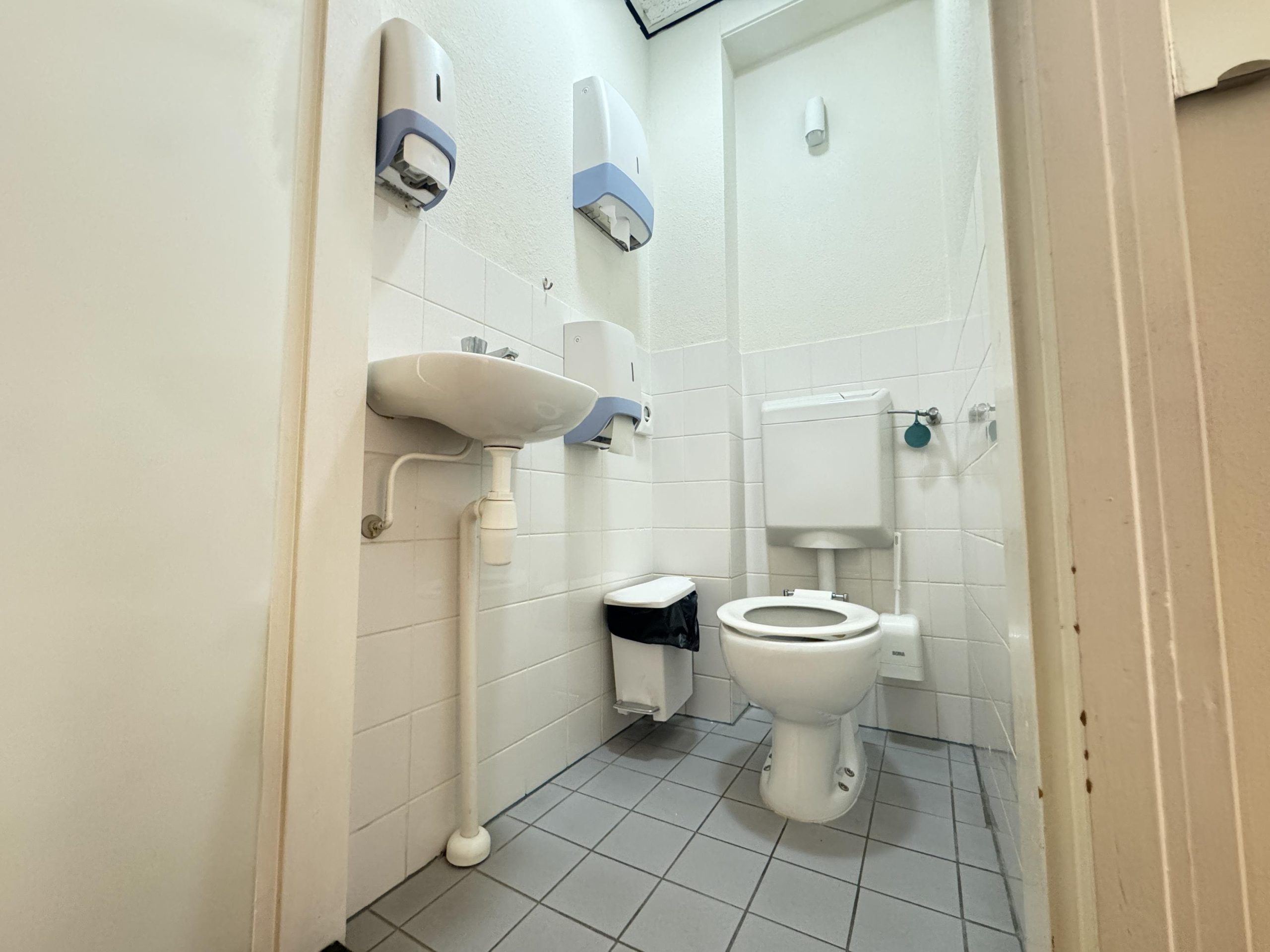 Twee pantry's, toilet met fontein, systeemplafond met inbouwarmaturen en gedeeltelijk tegel- en linoleumvloer.