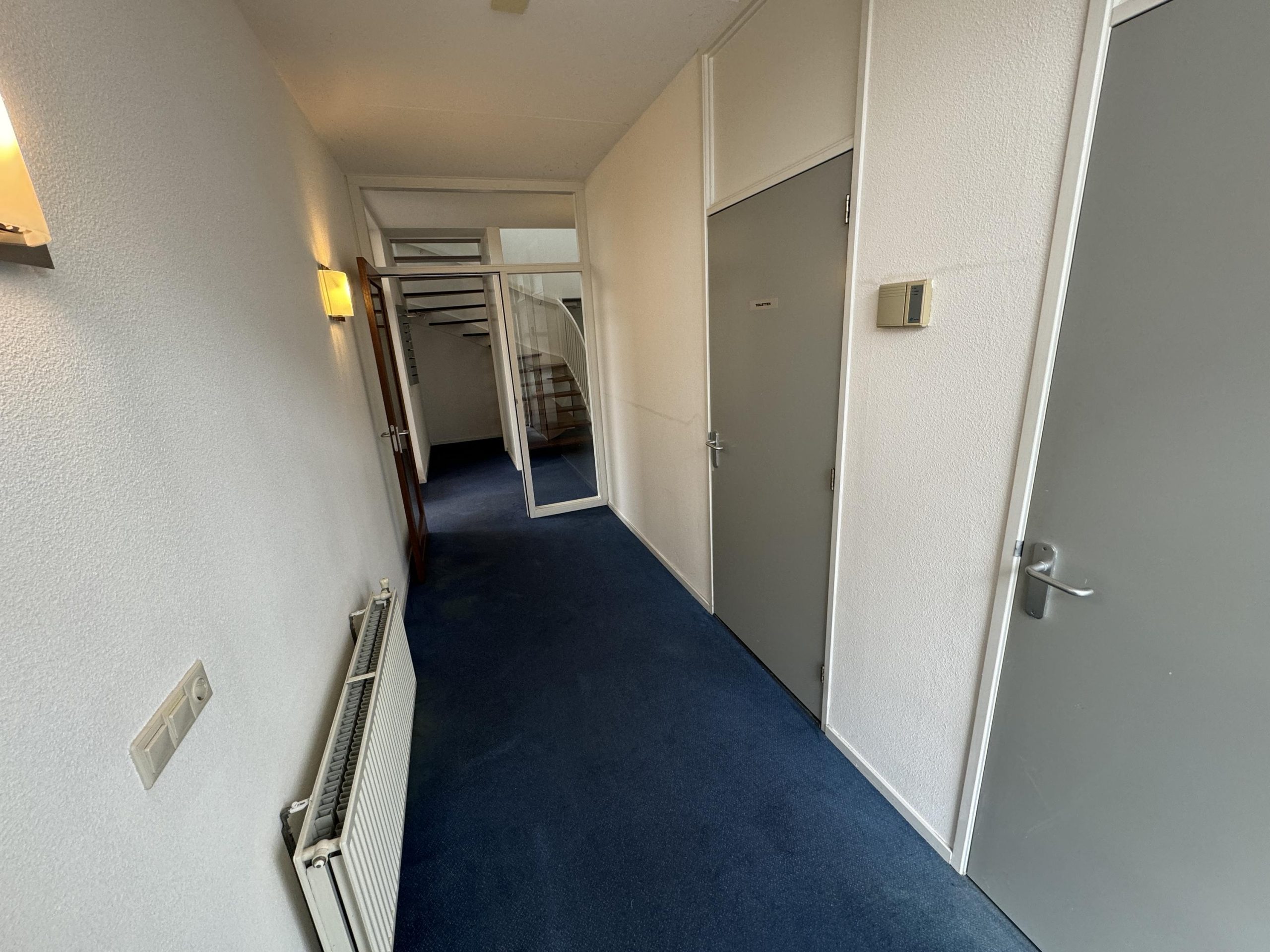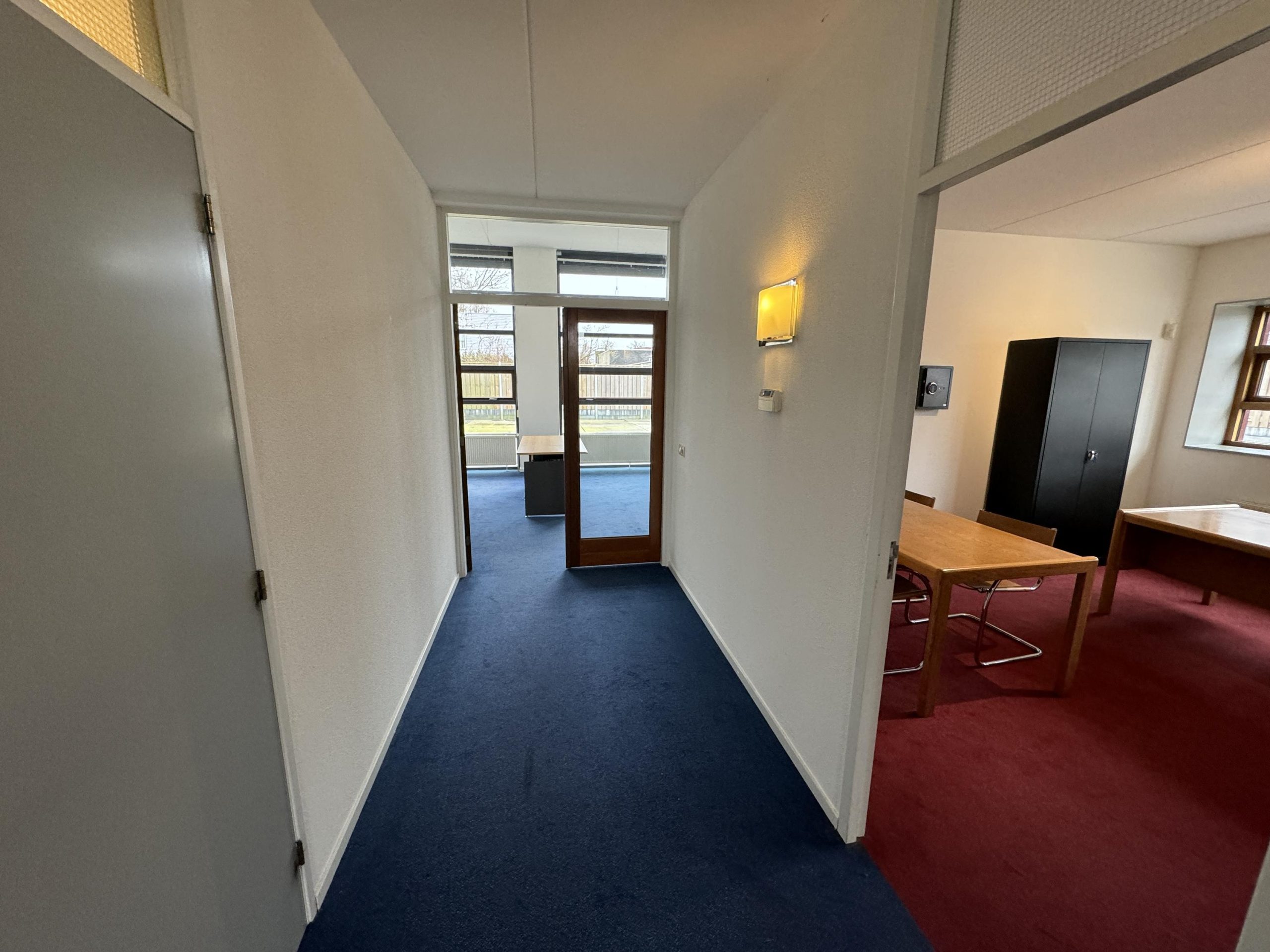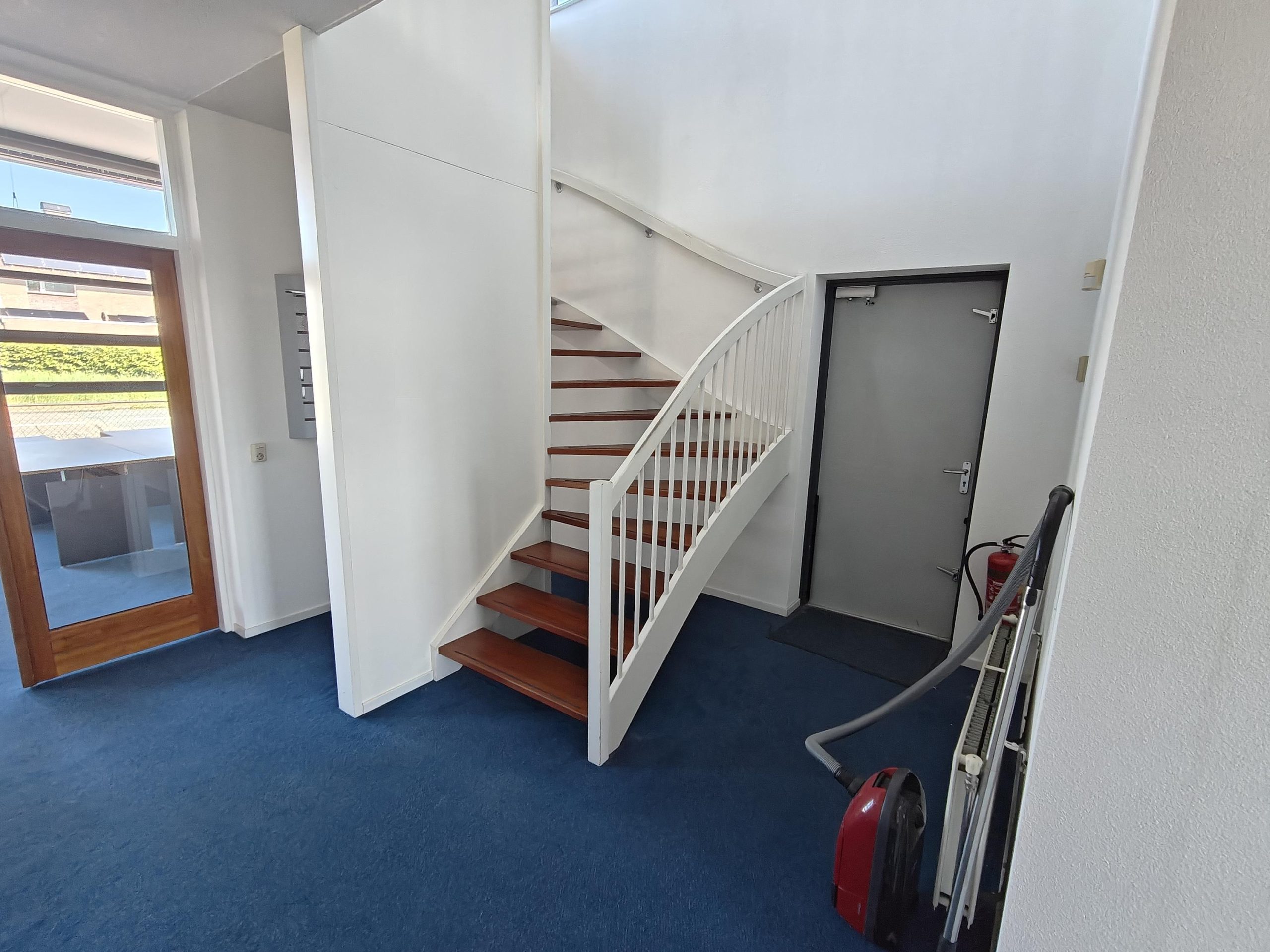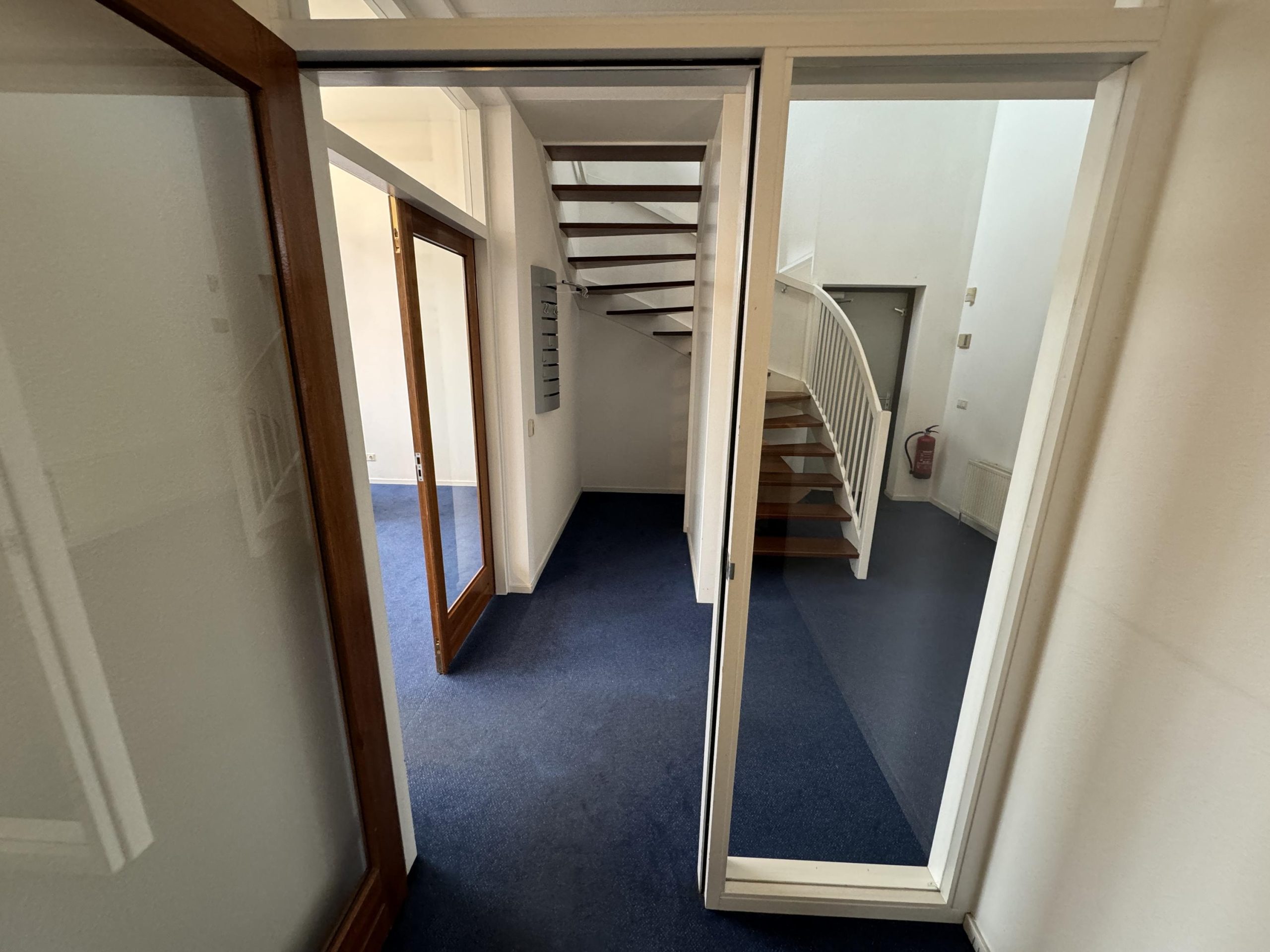 Begane grond: Entreedeur aan de zijkant, vanaf hier zijn 3 kantoorruimten en de toiletten te bereiken. Verder is hier de trap naar de eerste verdieping.