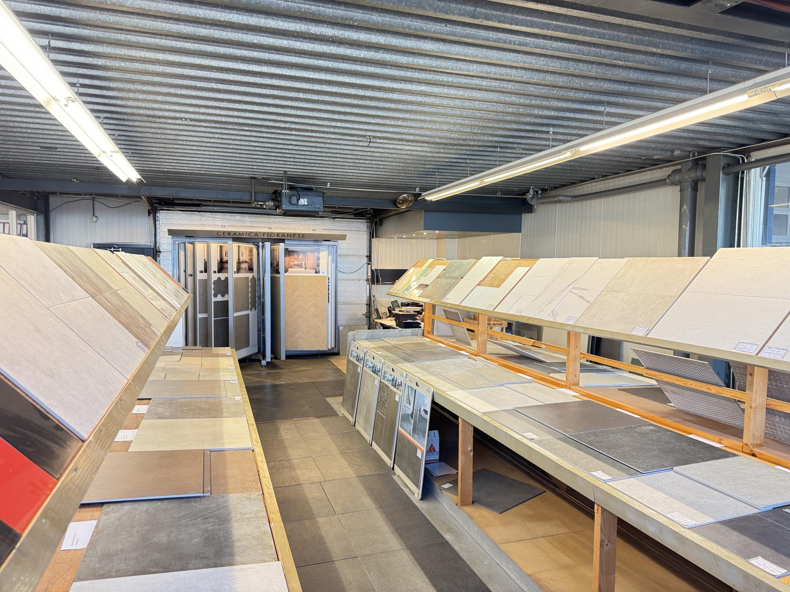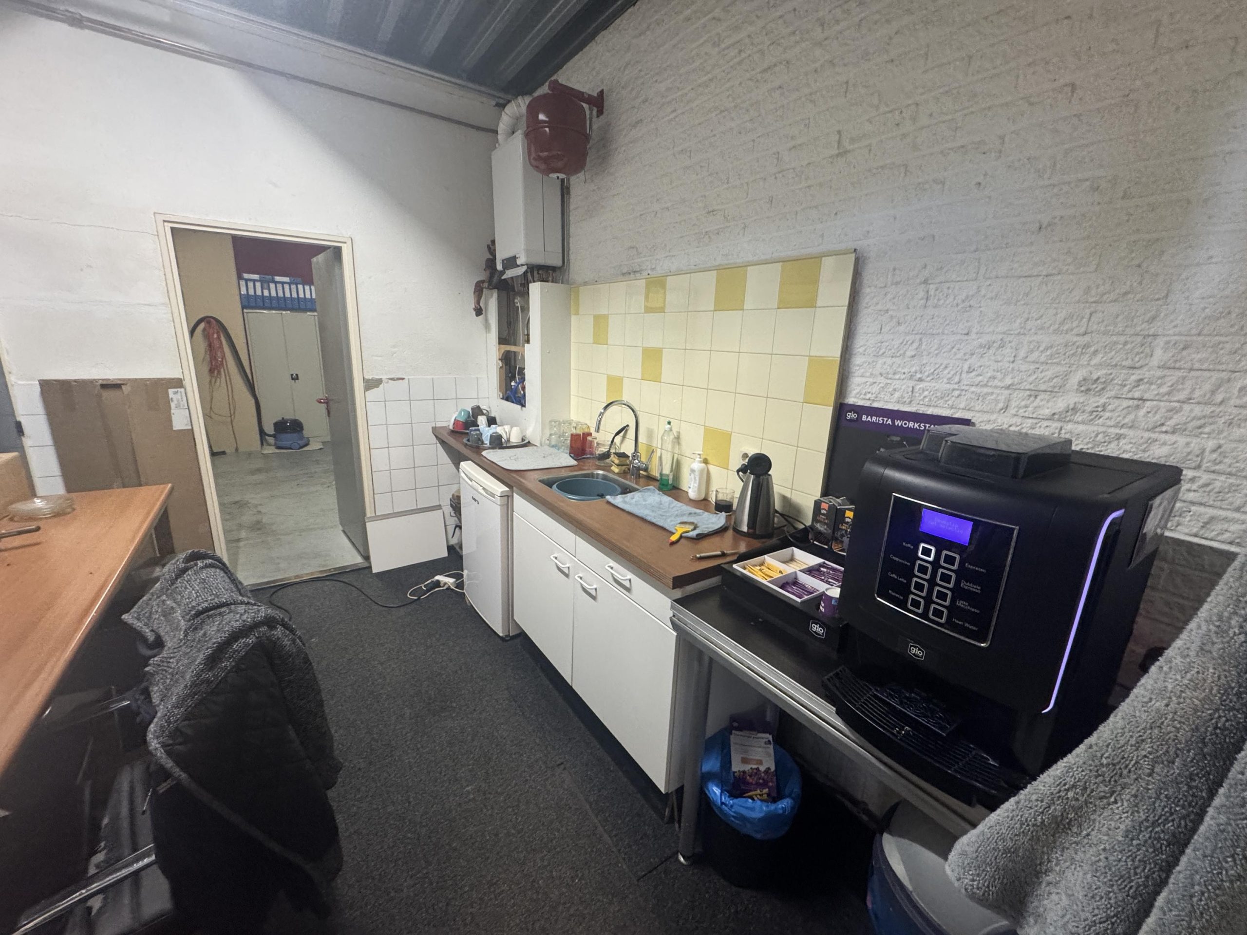 Bedrijfsruimte: overheaddeur, betonvloer en brandblusser