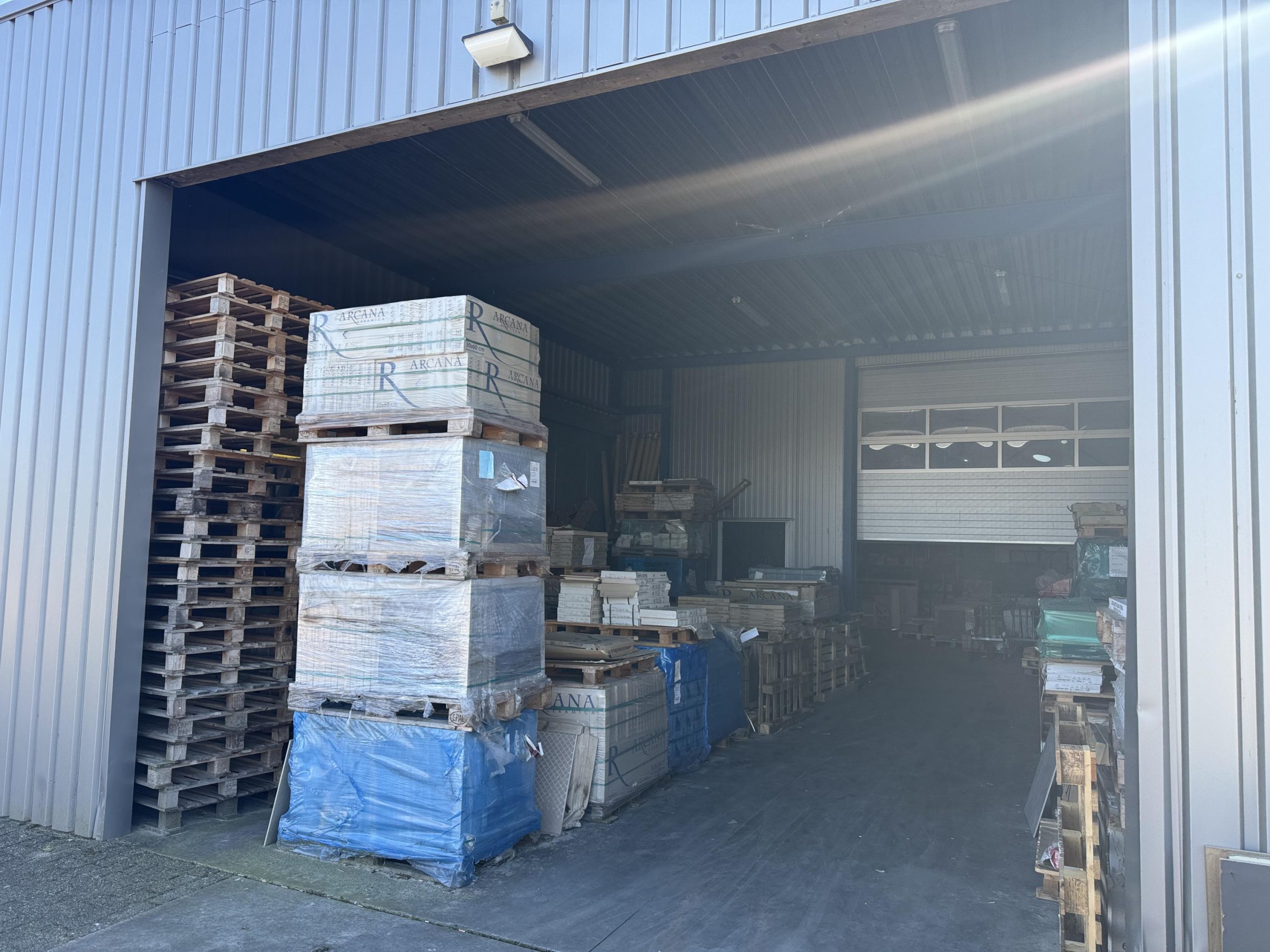 Bedrijfsruimte: overheaddeur, betonvloer en brandblusser