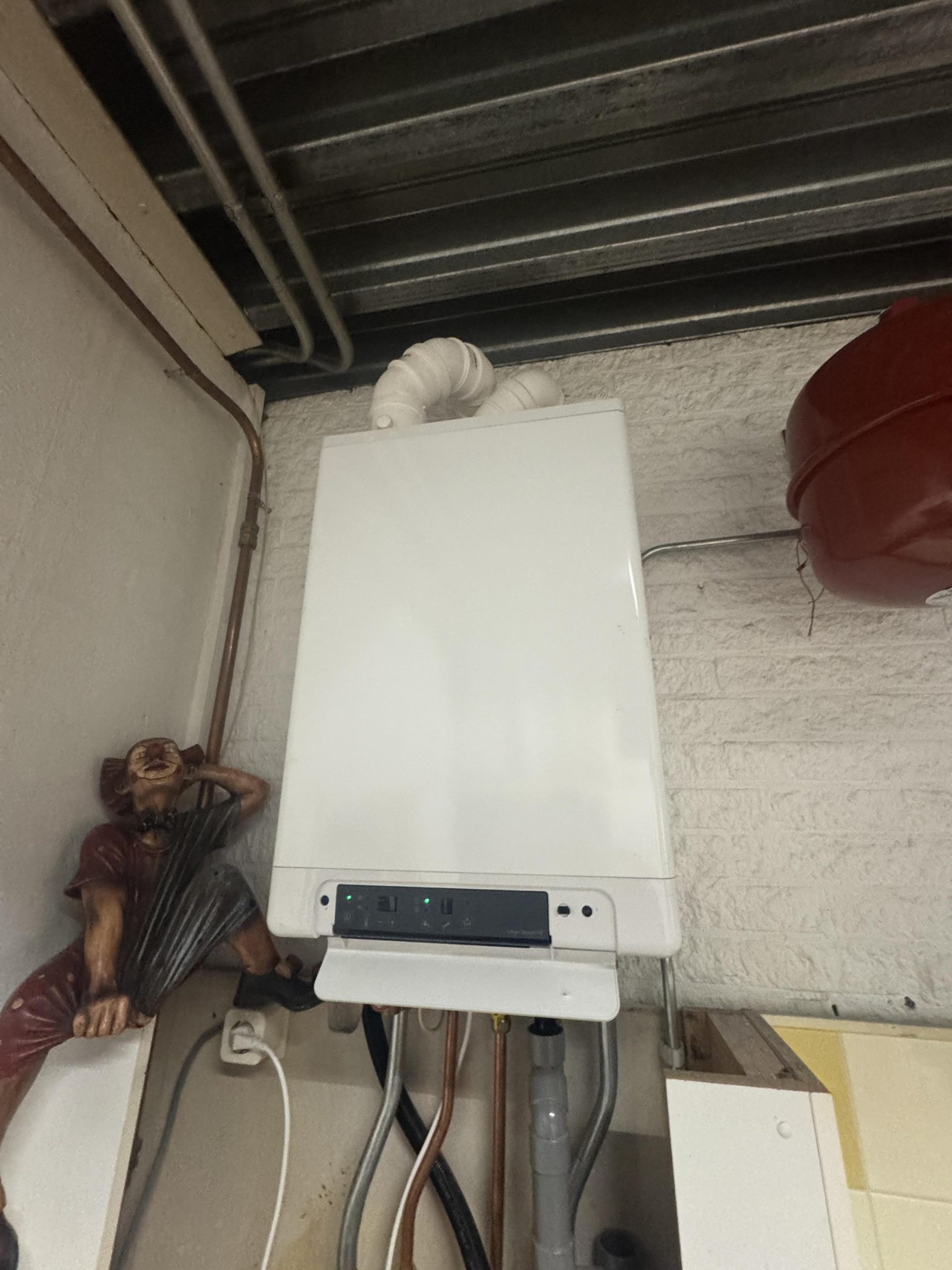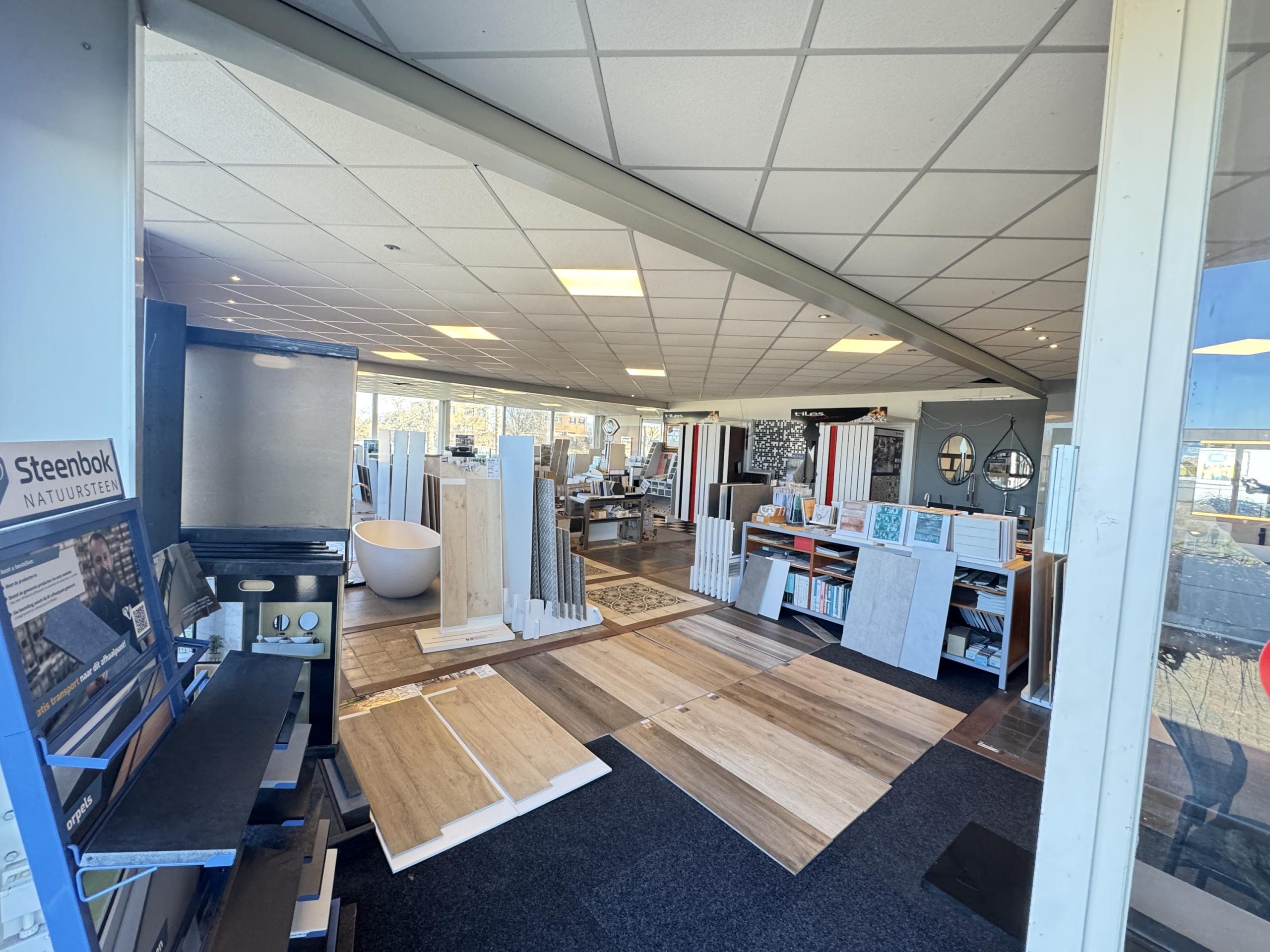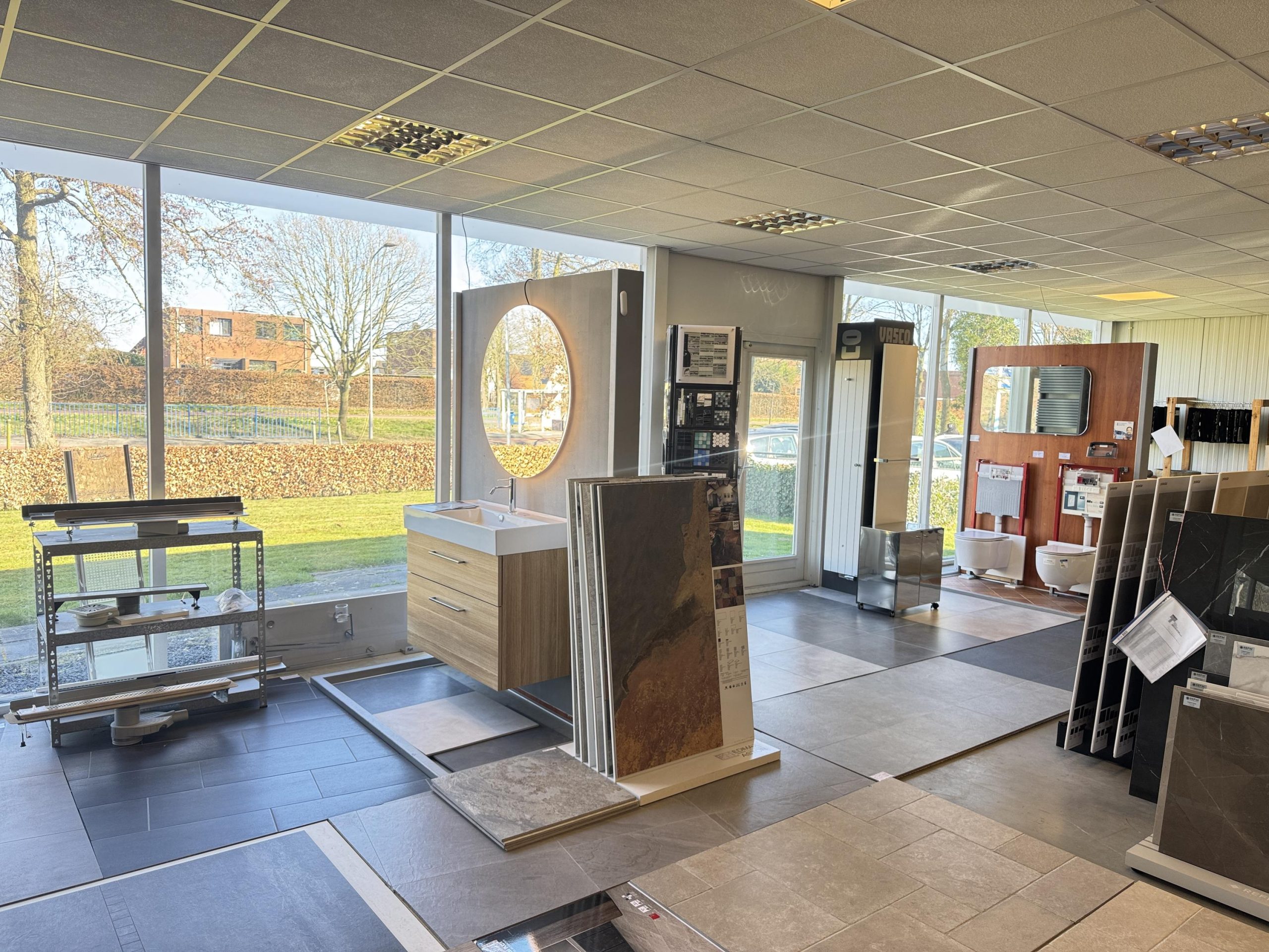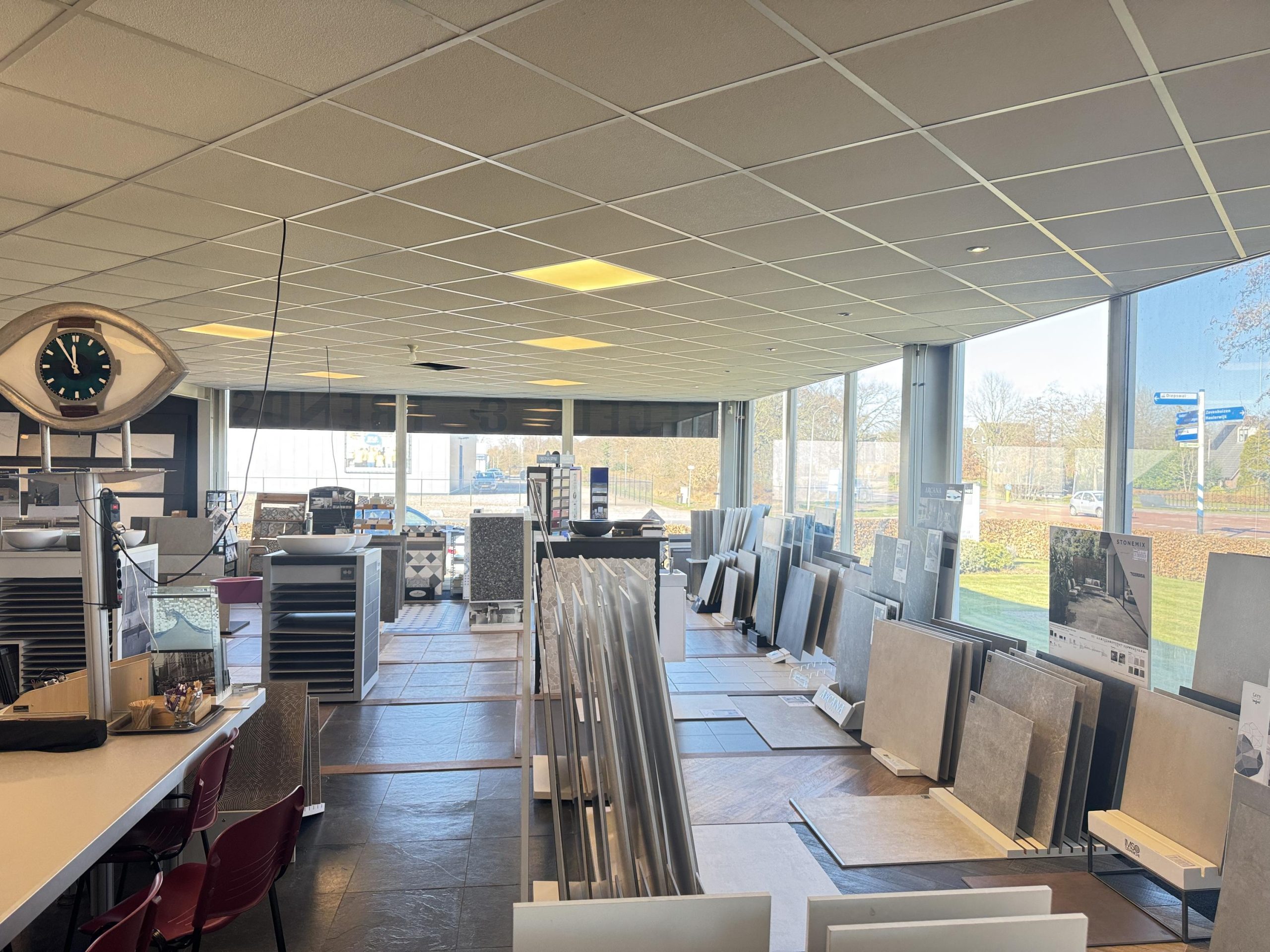 Showroom: systeemplafond met armaturen en spotjes, Cv-ketel met radiatoren, pantry en toilet met fontein