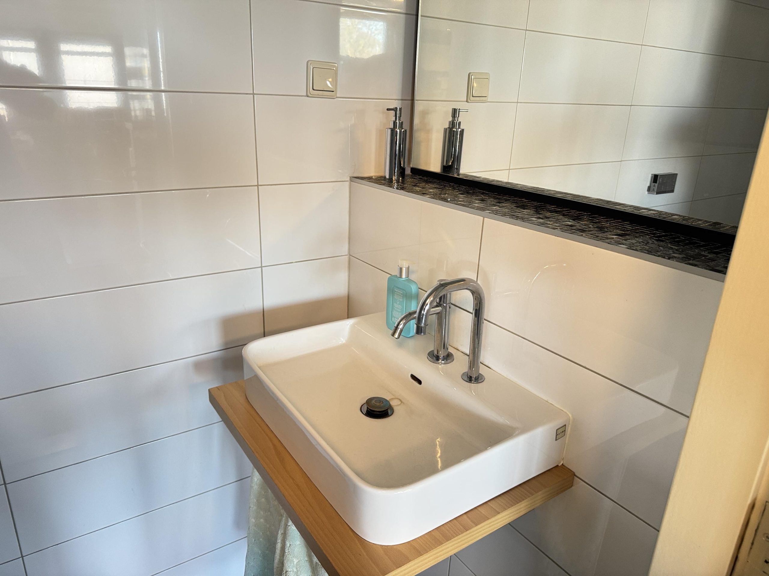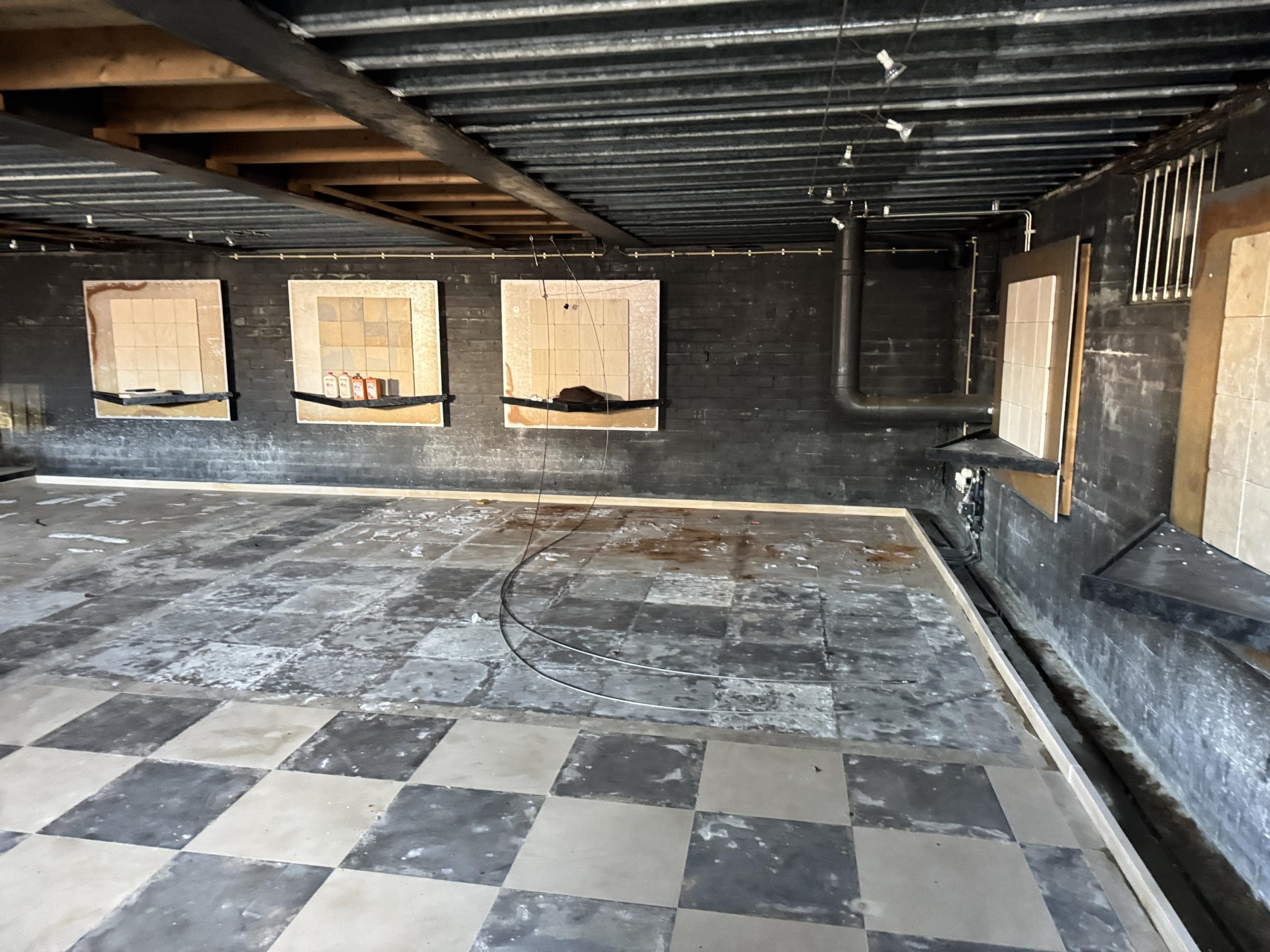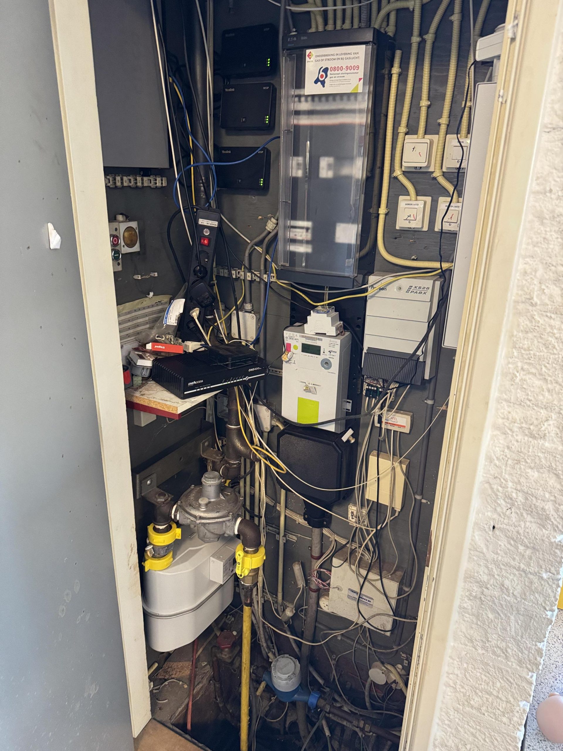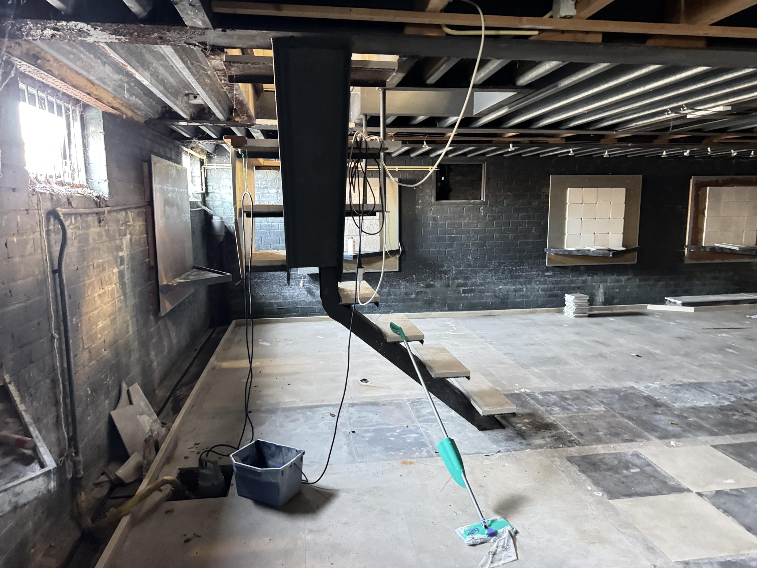 Showroom: systeemplafond met armaturen en spotjes, Cv-ketel met radiatoren, pantry en toilet met fontein