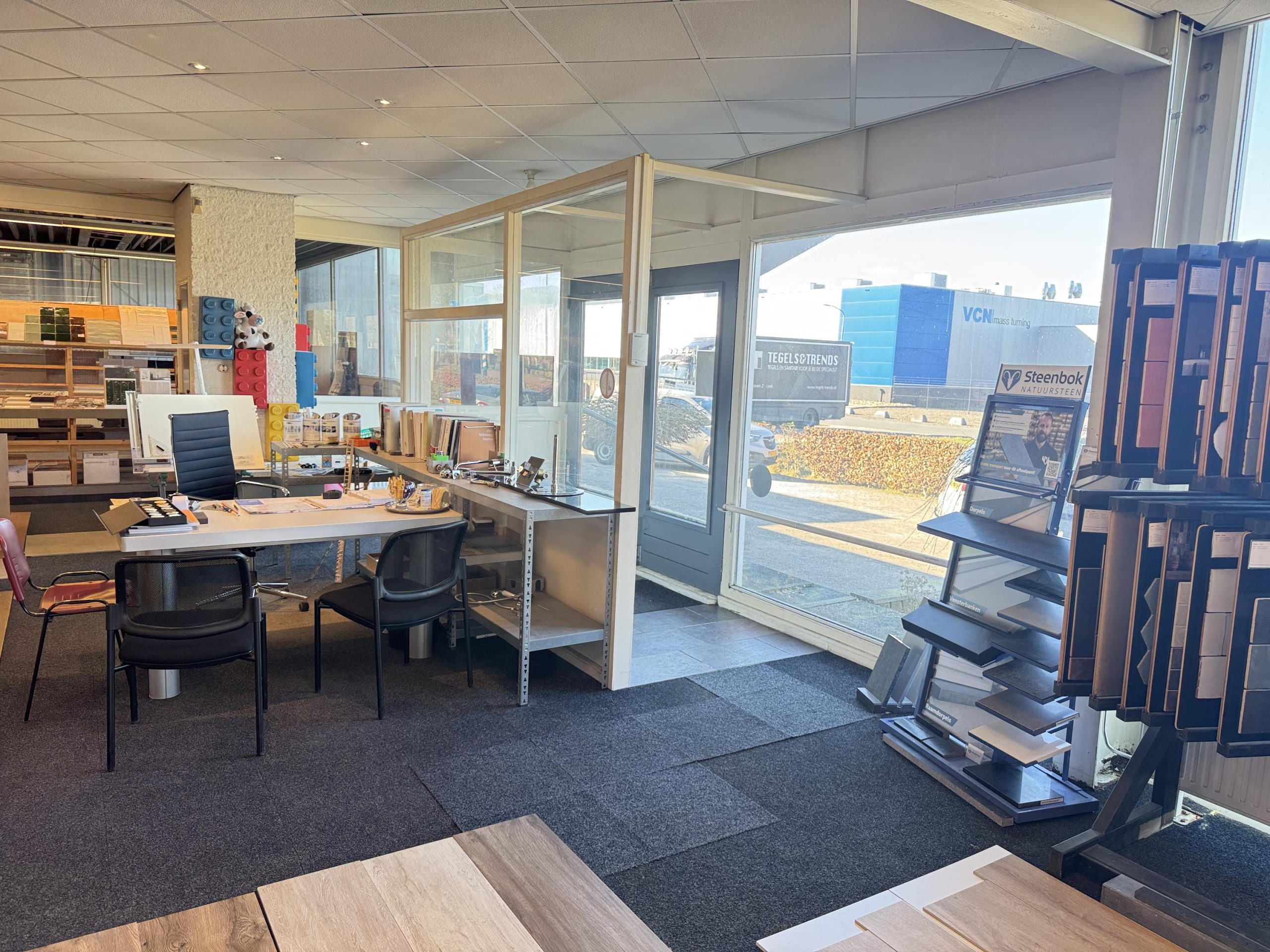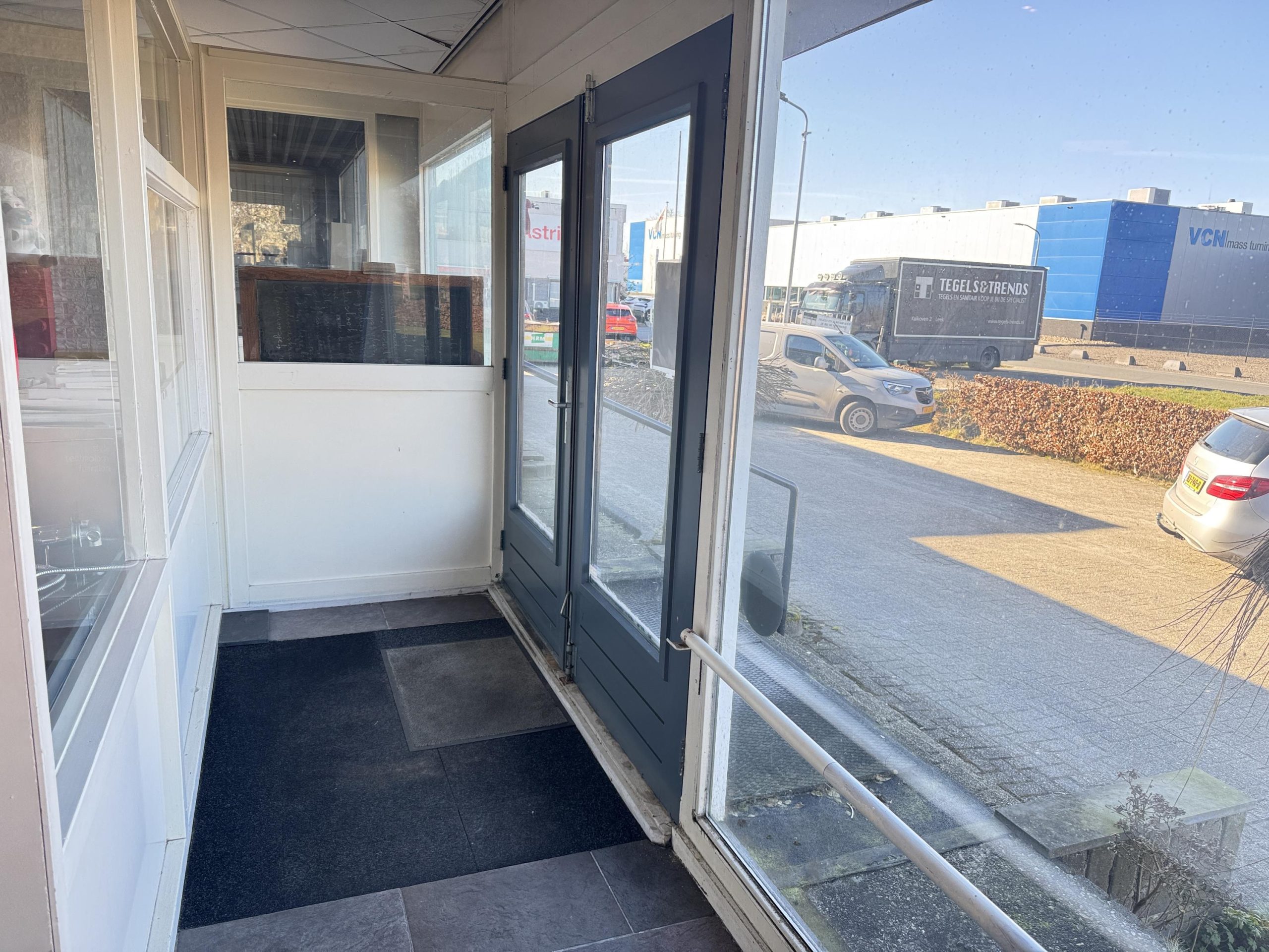 Begane grond: Entreedeur naar de showroom. Vanuit hier is de bedrijfsruimte en buitenopslag te bereiken.
