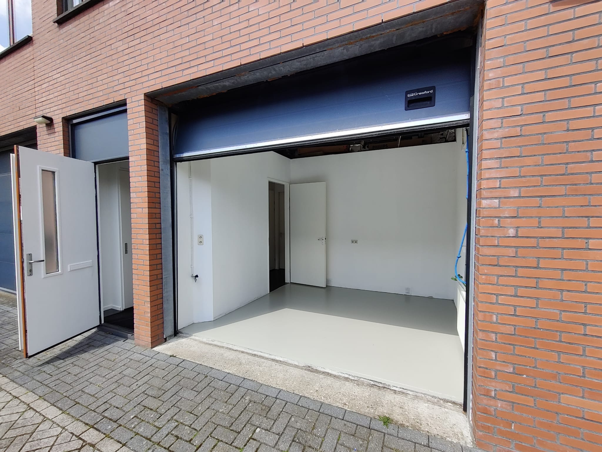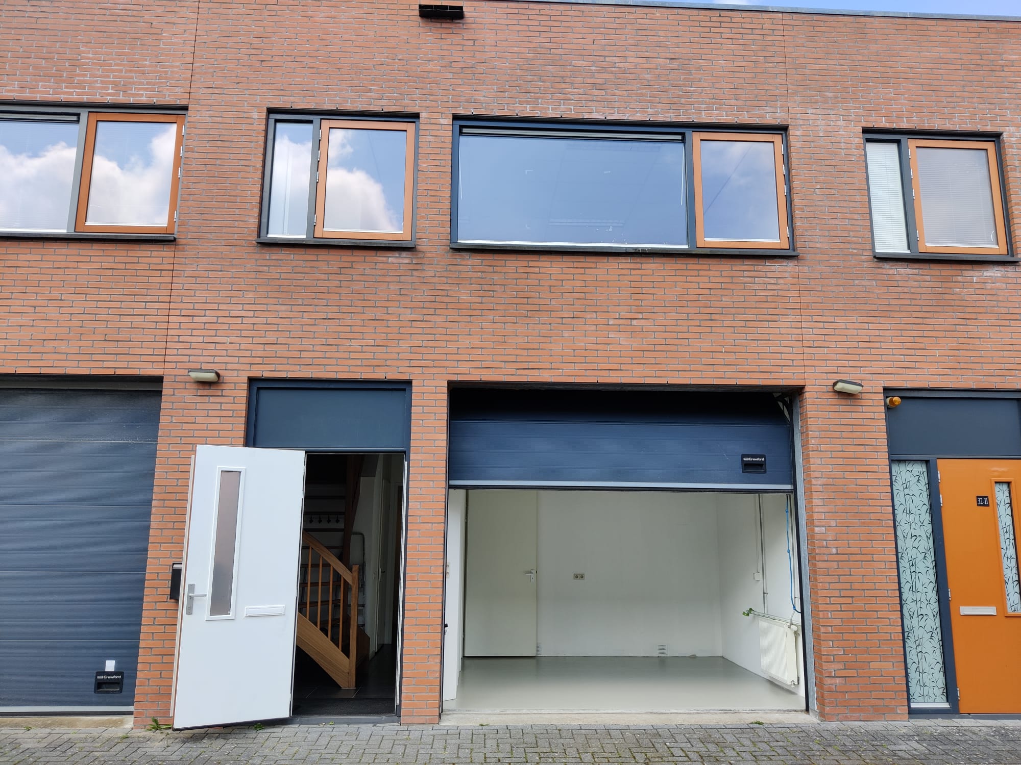Entreedeur naar de hal met toilet en trap naar eerste verdieping, vanuit de hal is de opslagruimte met overheaddeur, de keuken, de bijkeuken en de vergaderruimte te bereiken.