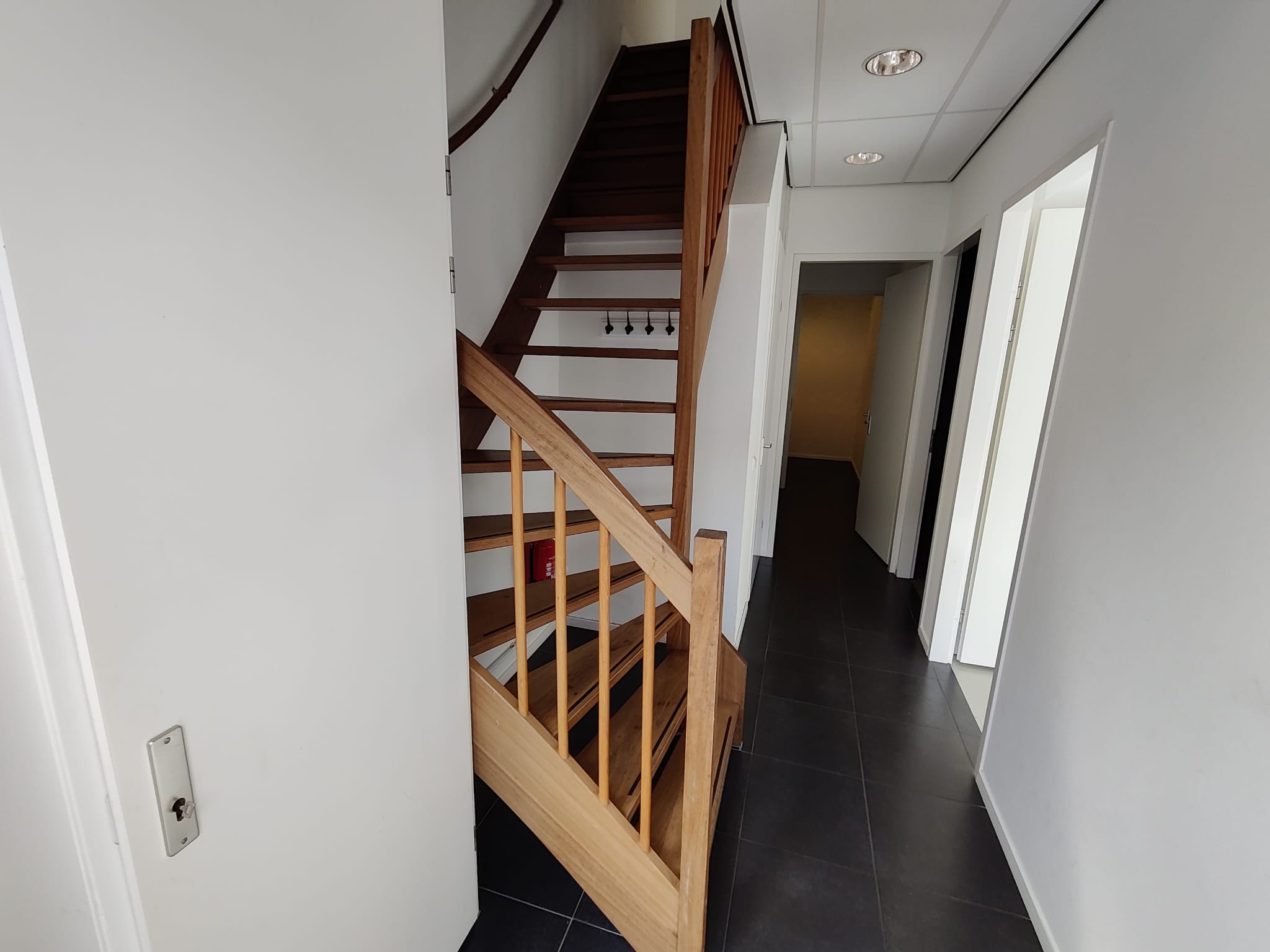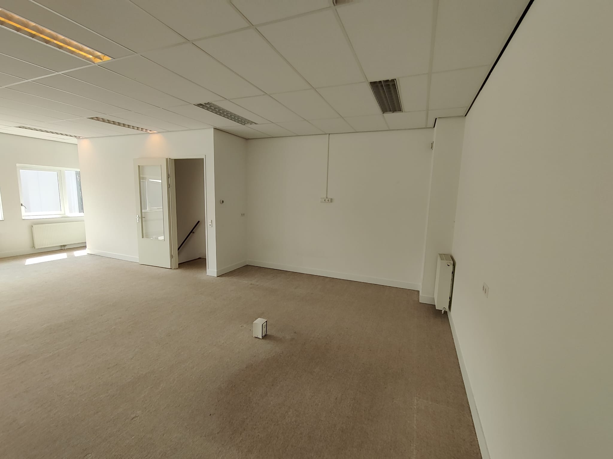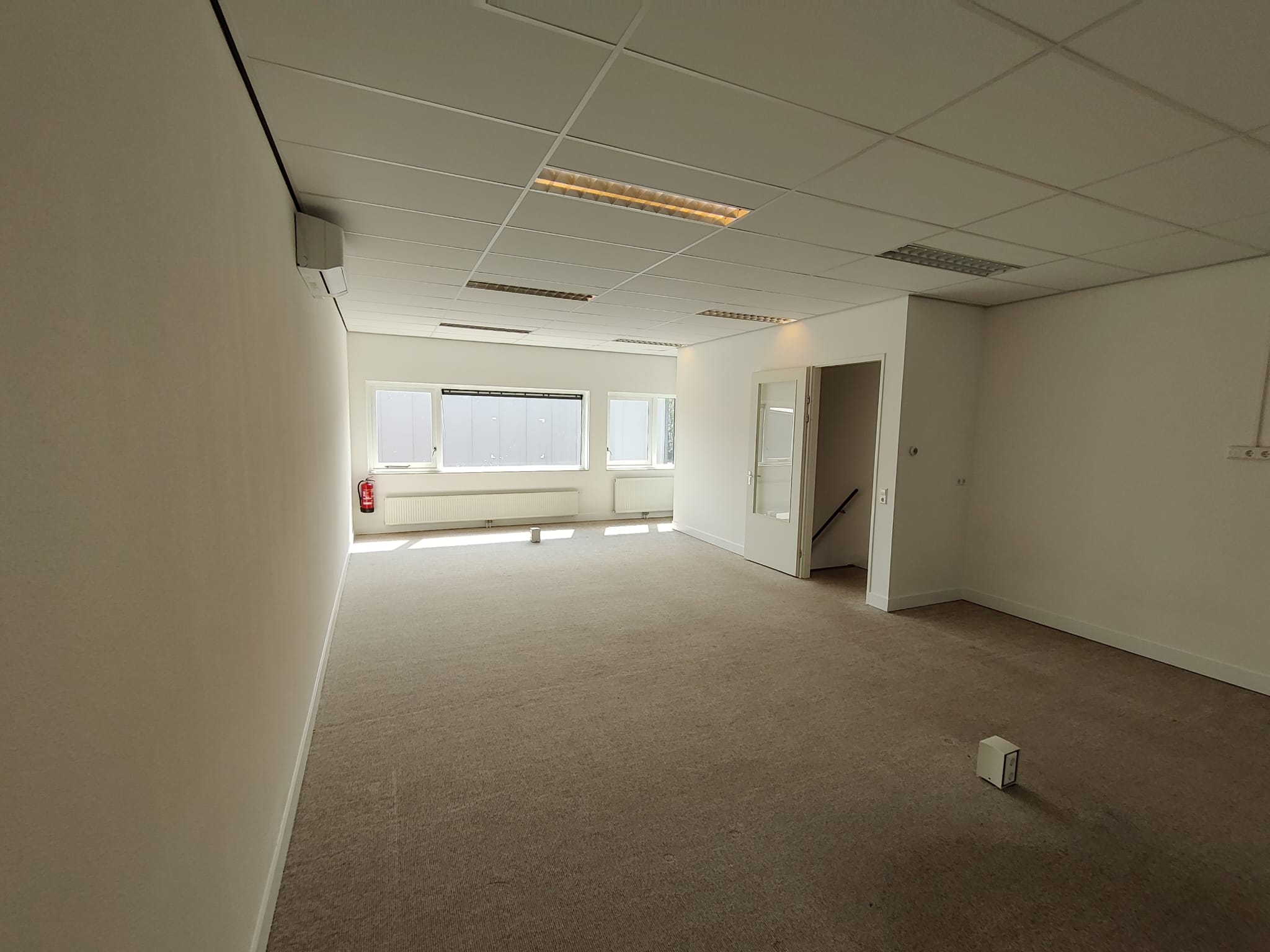 Trap naar een royale kantoorruimte met airco en te openen ramen.