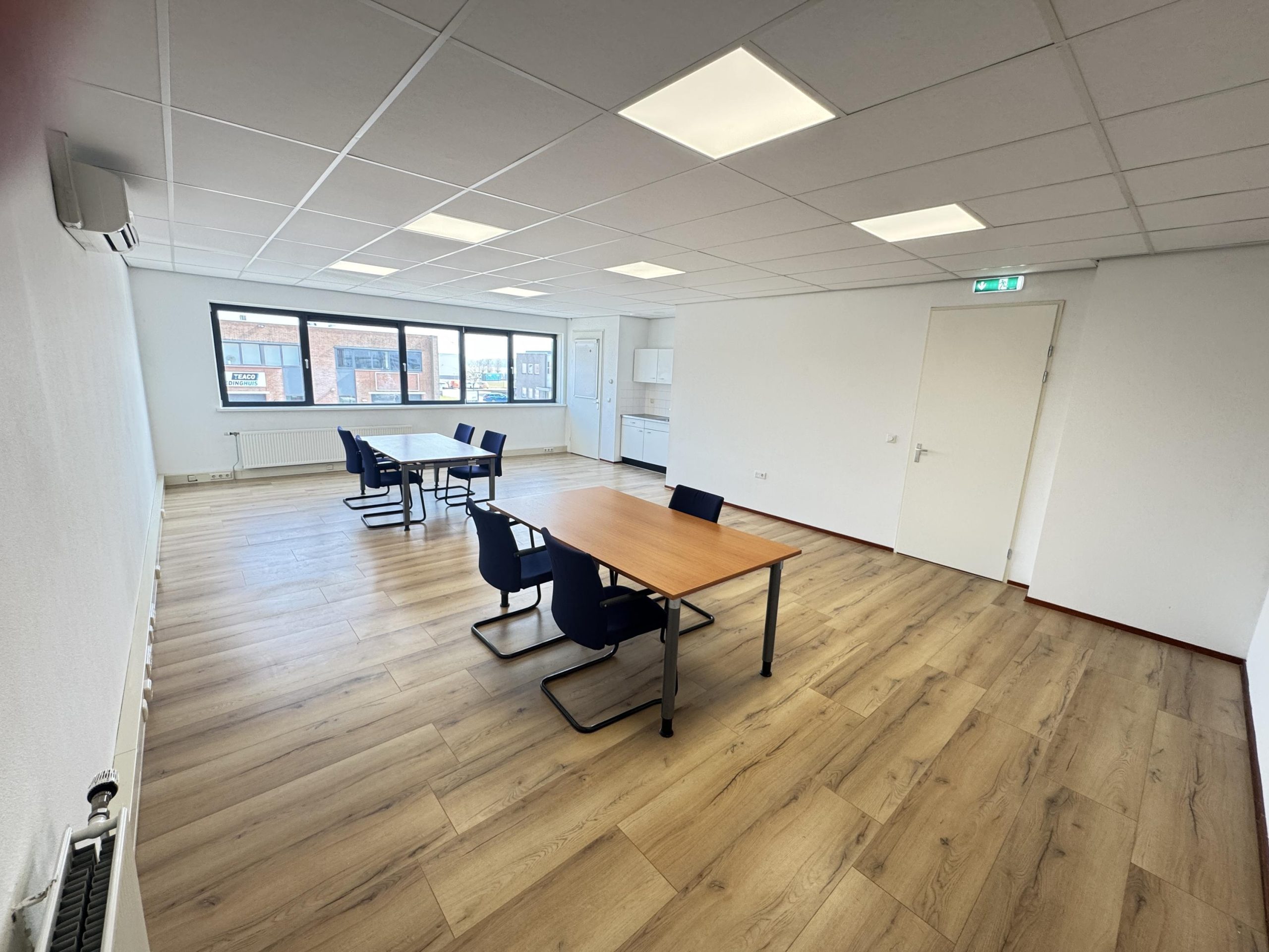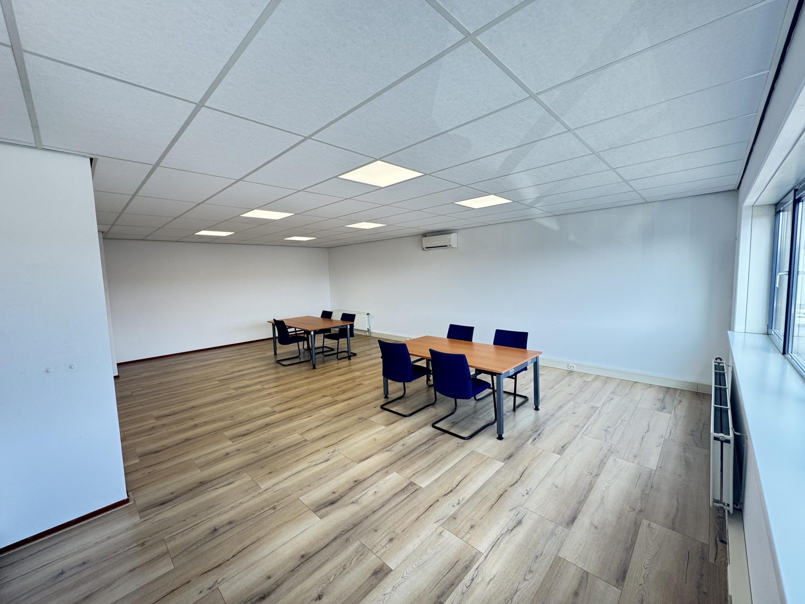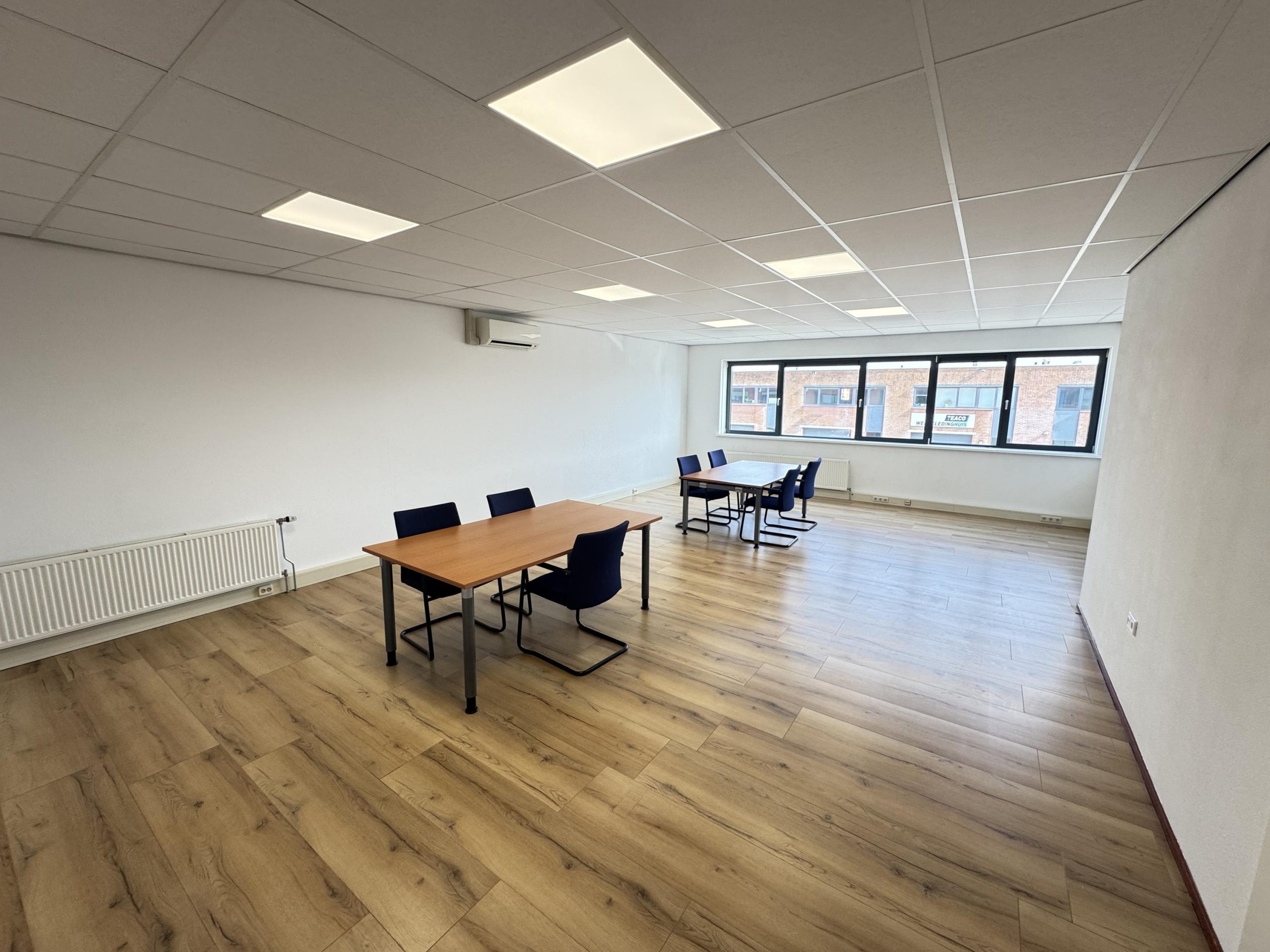 Strak afgewerkte kantoorruimte met een pantry, toilet, airco en te openen ramen.