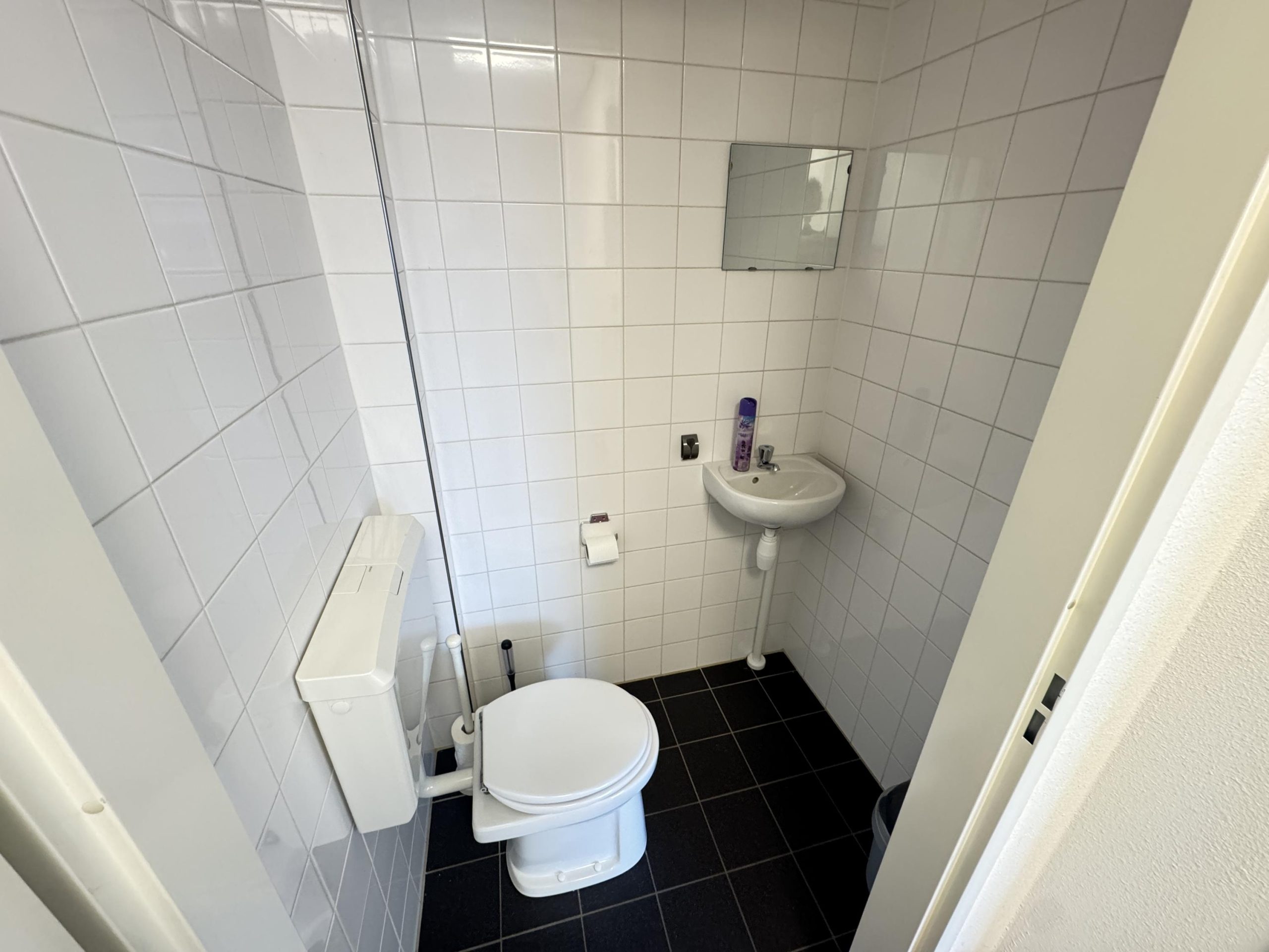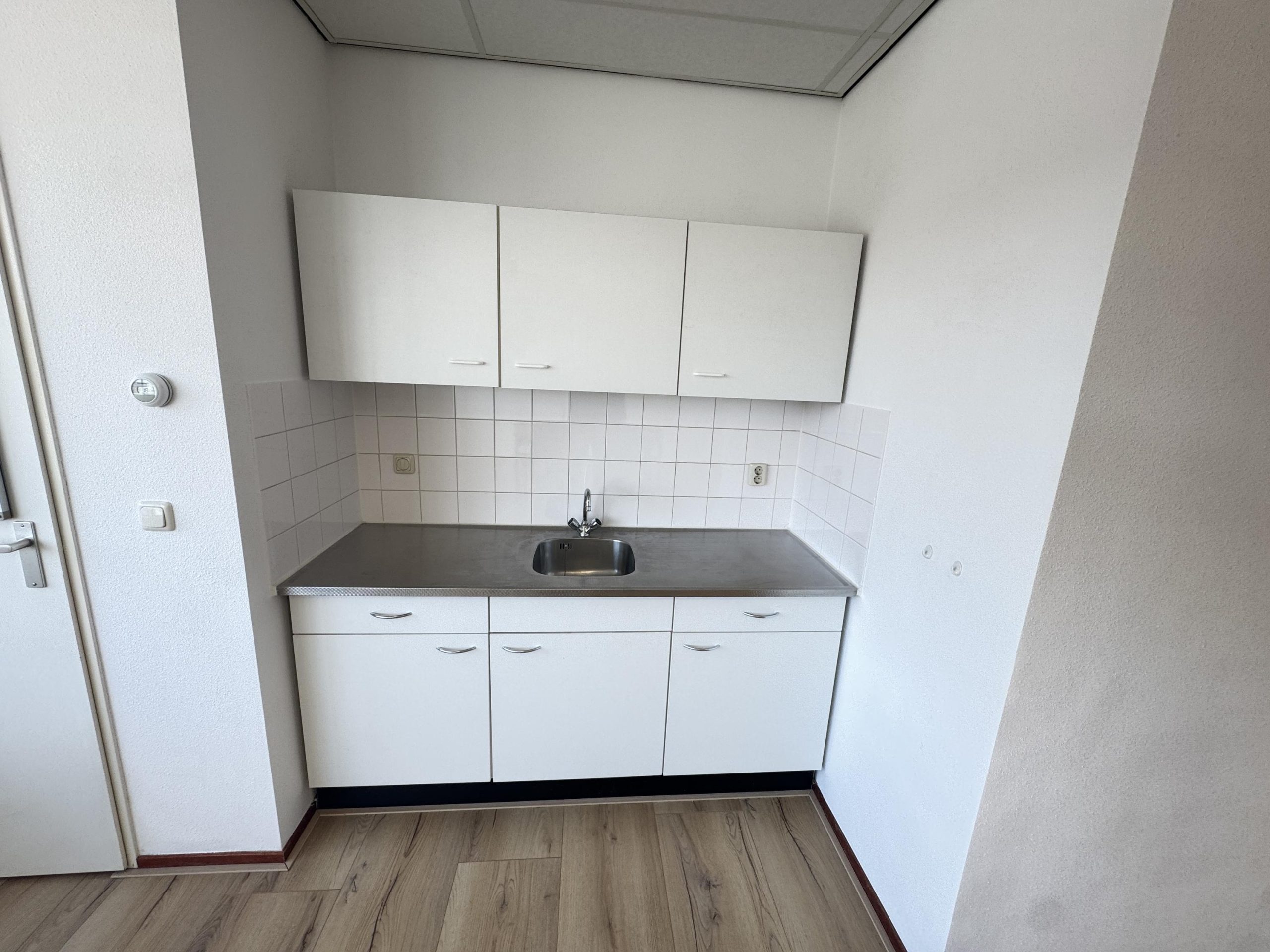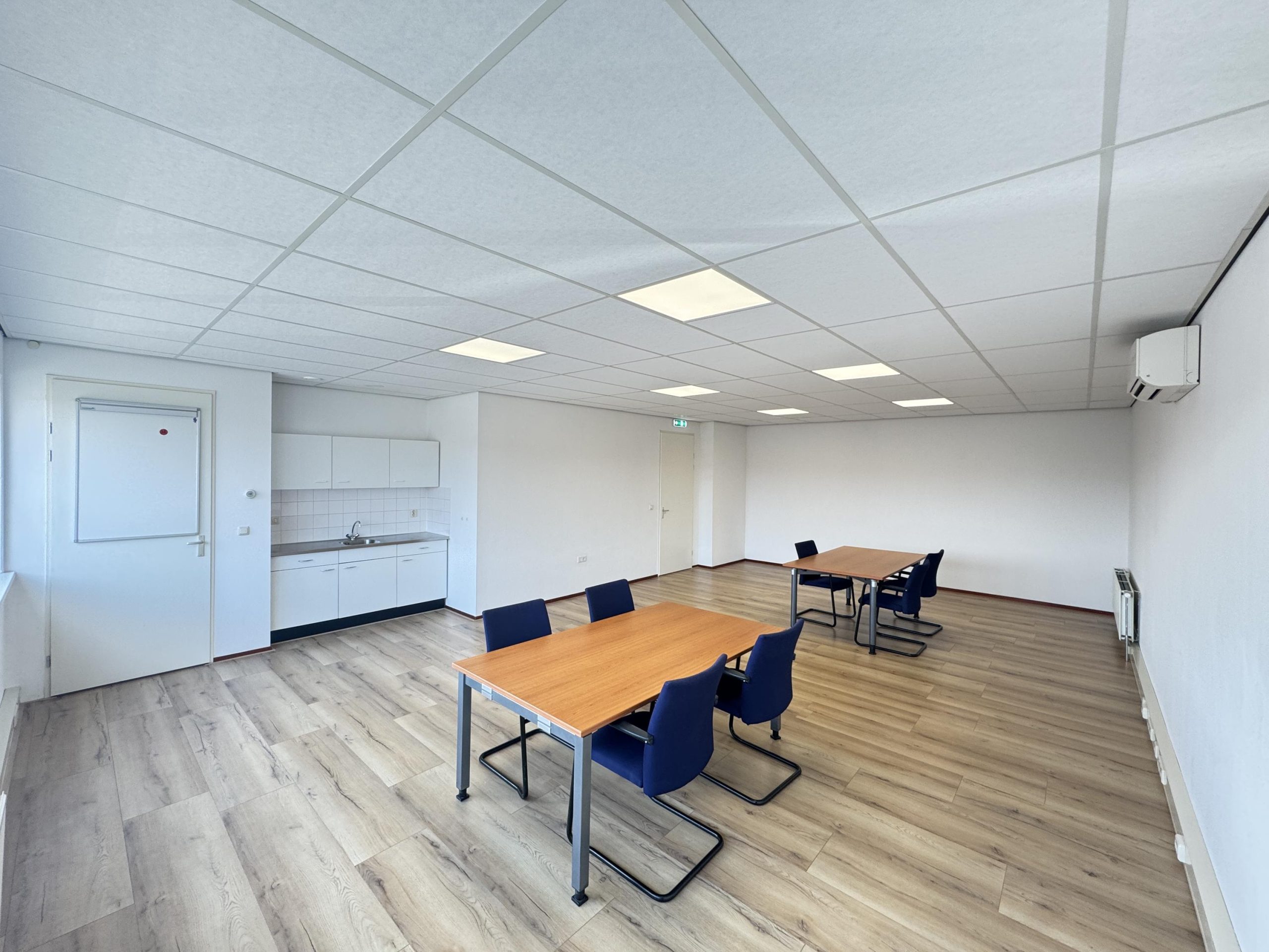 Strak afgewerkte kantoorruimte met een pantry, toilet, airco en te openen ramen.