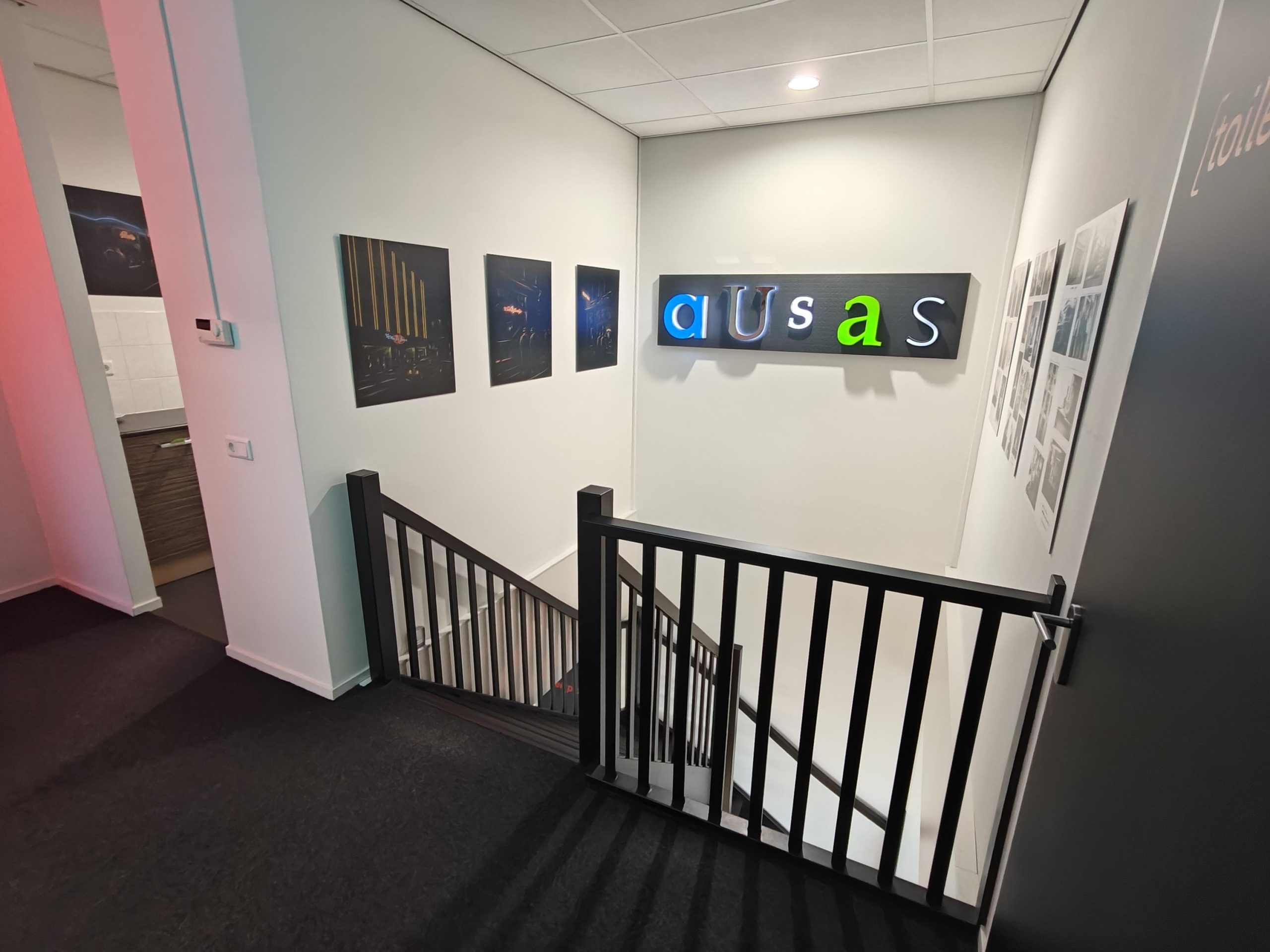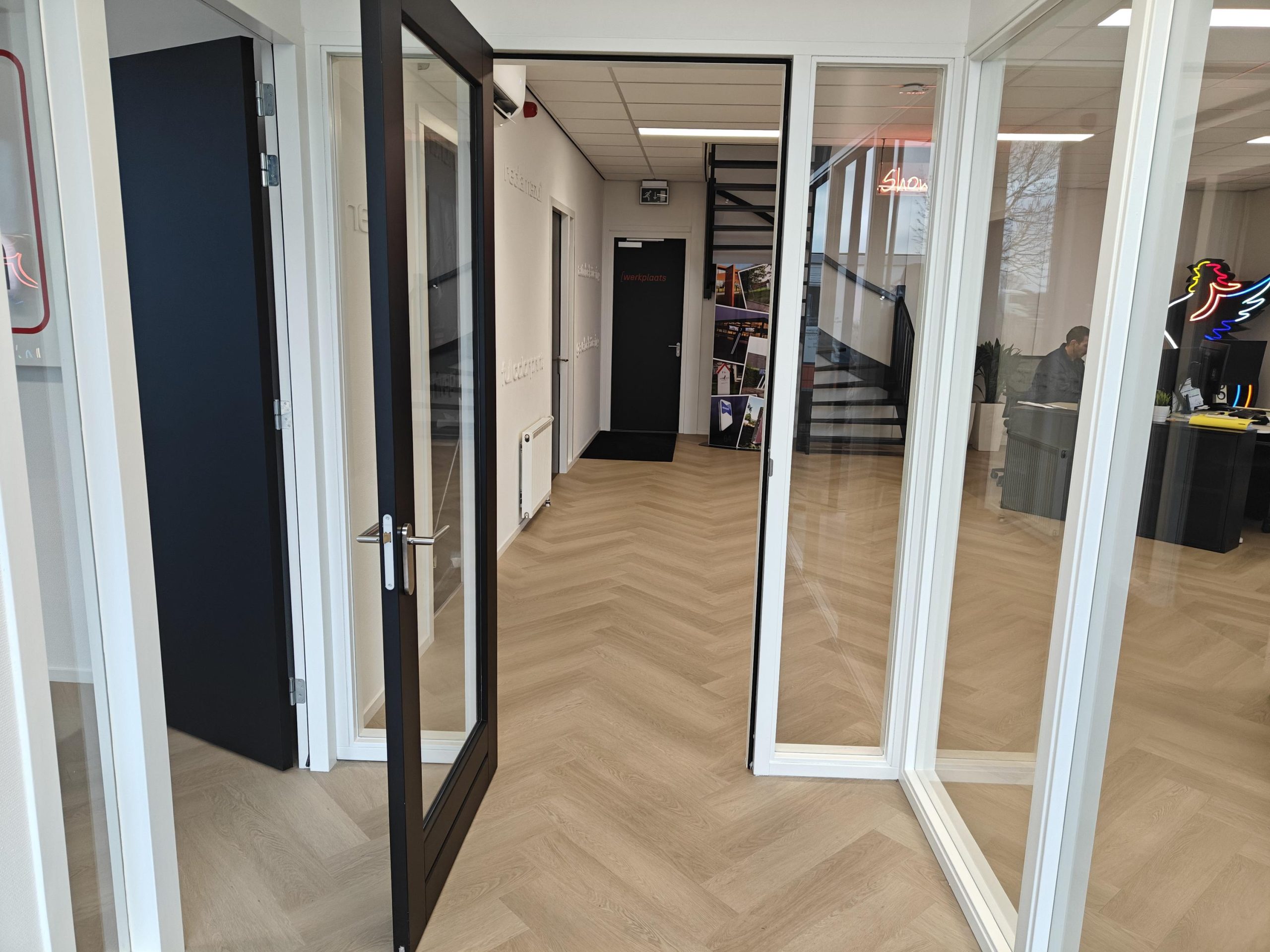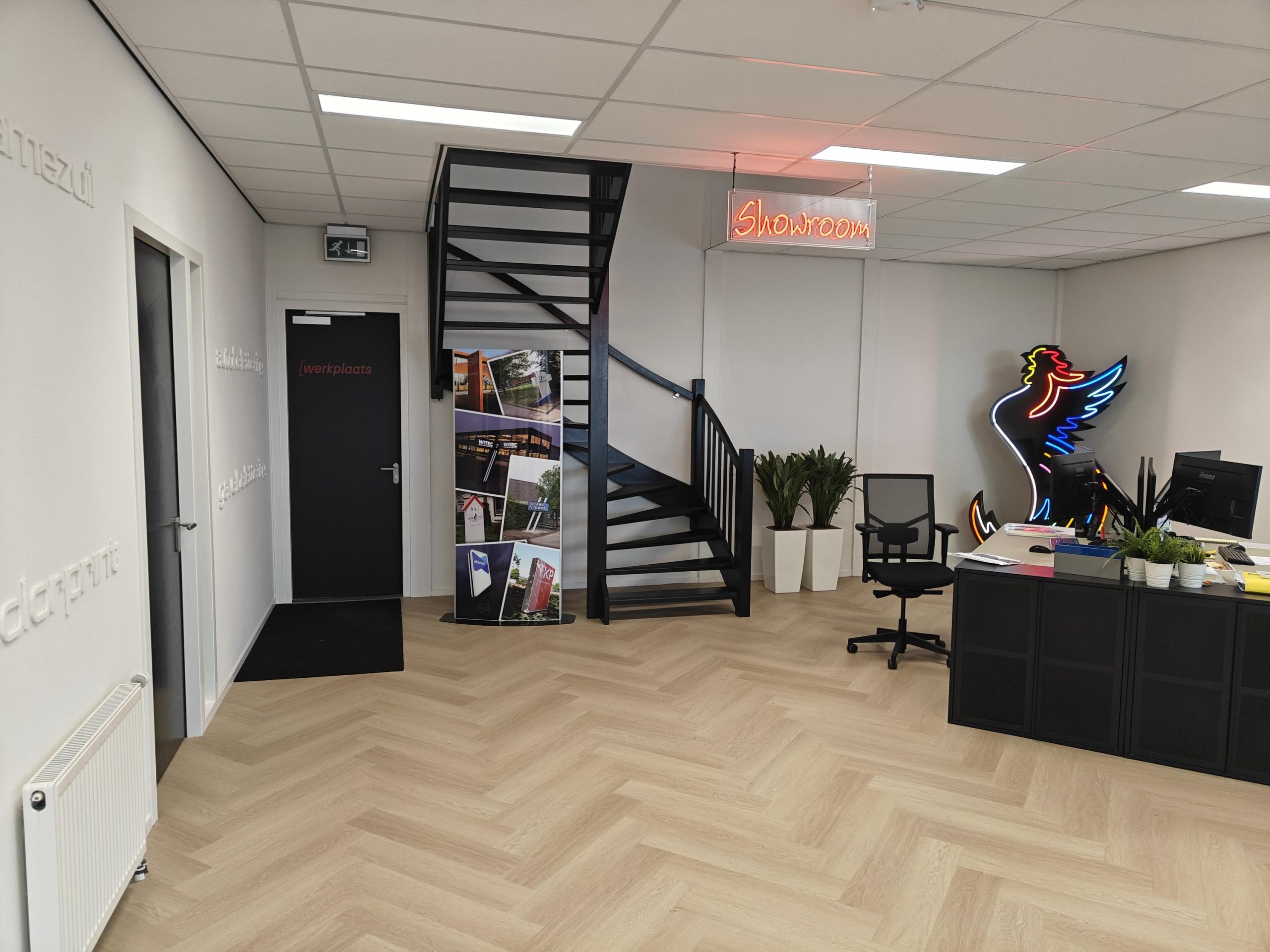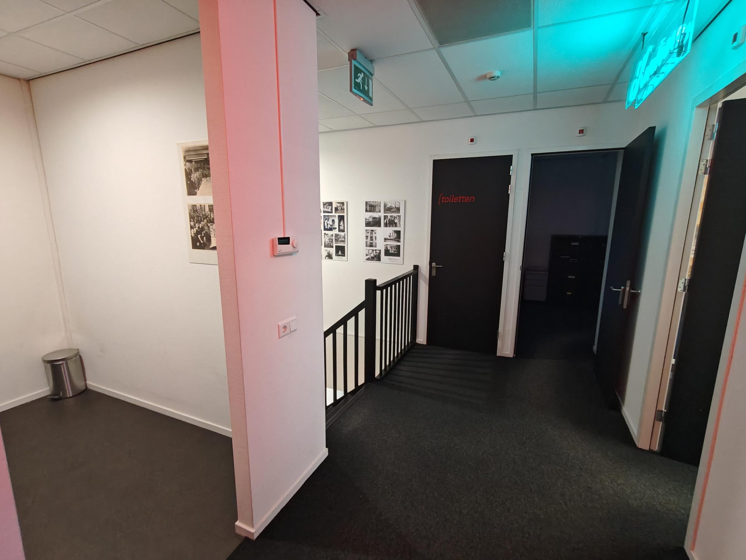 Entree/hal, gedeelde spreekruimte links, via de trap naar de eerste verdieping in het kantoor van Matthijssen Lichtreclame is de eerste verdieping te bereiken met pantry, drie kantoorruimtes, twee toiletten en een berging.