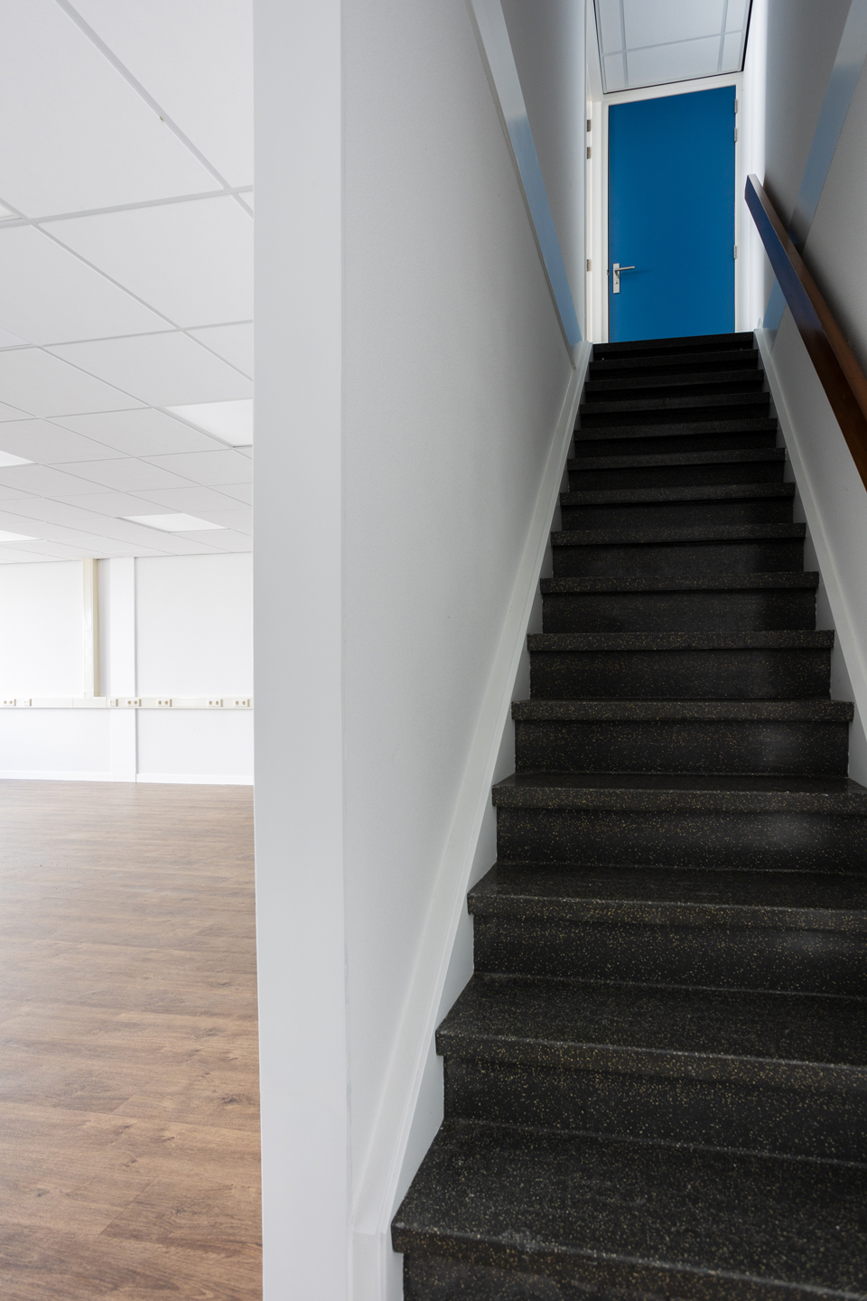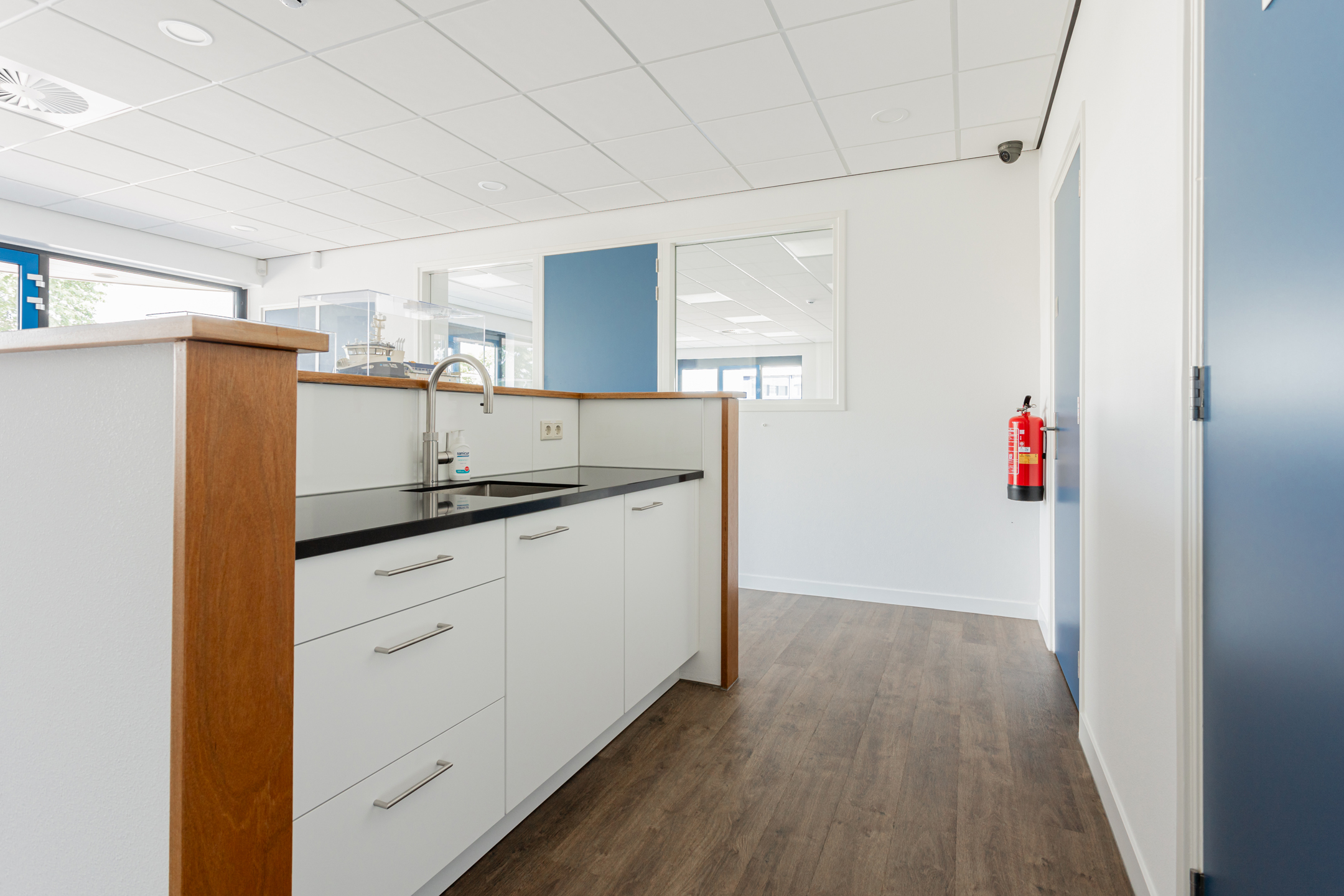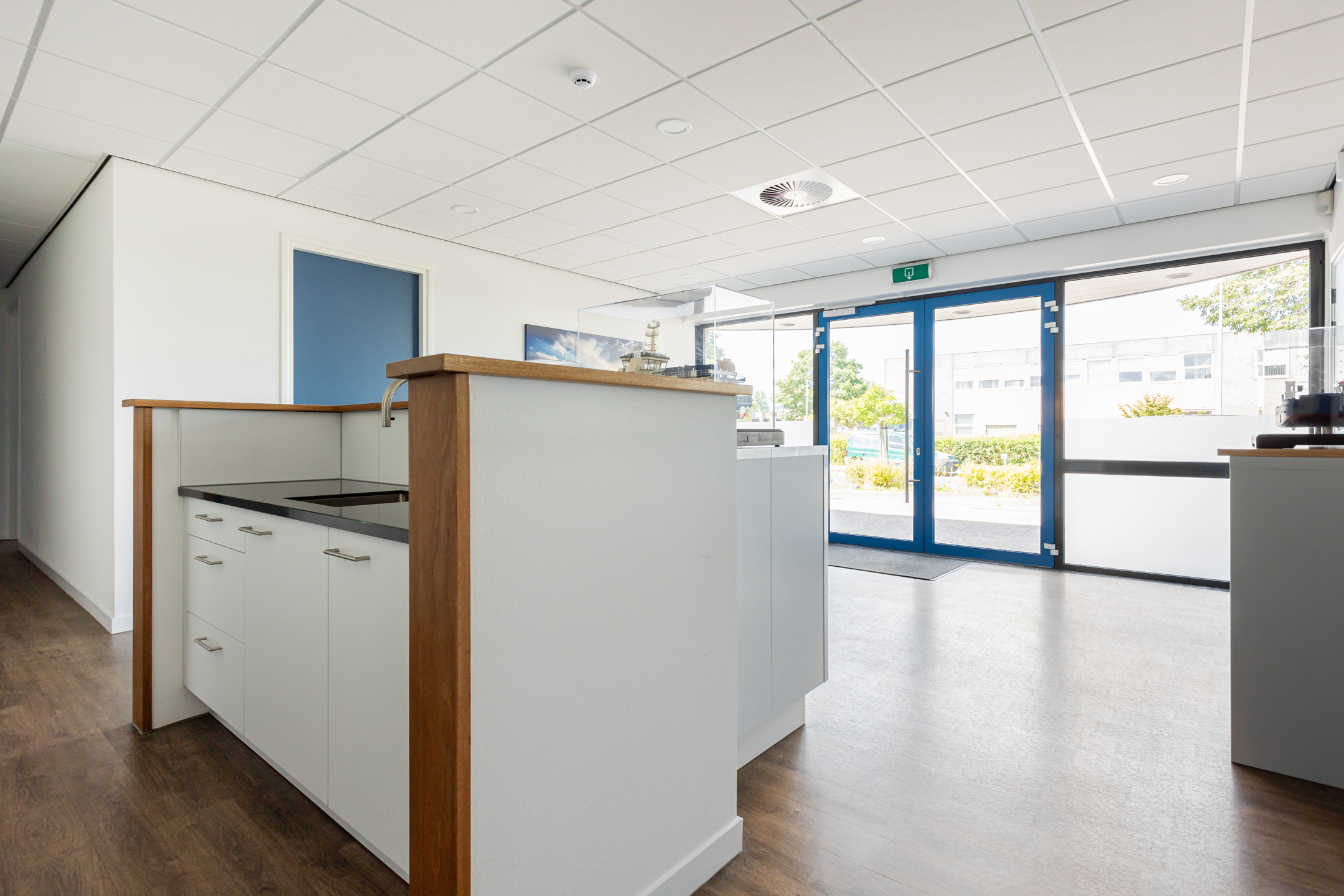 Entree naar de gezamenlijke hal met een pantry. Links van de hal zijn 2 ruime kantoorruimtes aanwezig. Tevens is hier een trap aanwezig naar de eerste verdieping met nog een kantoorruimte.