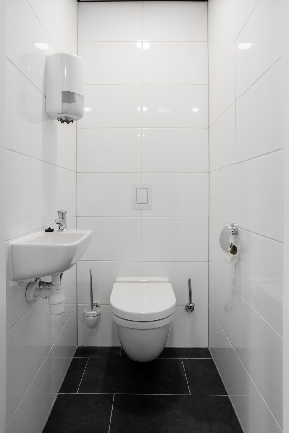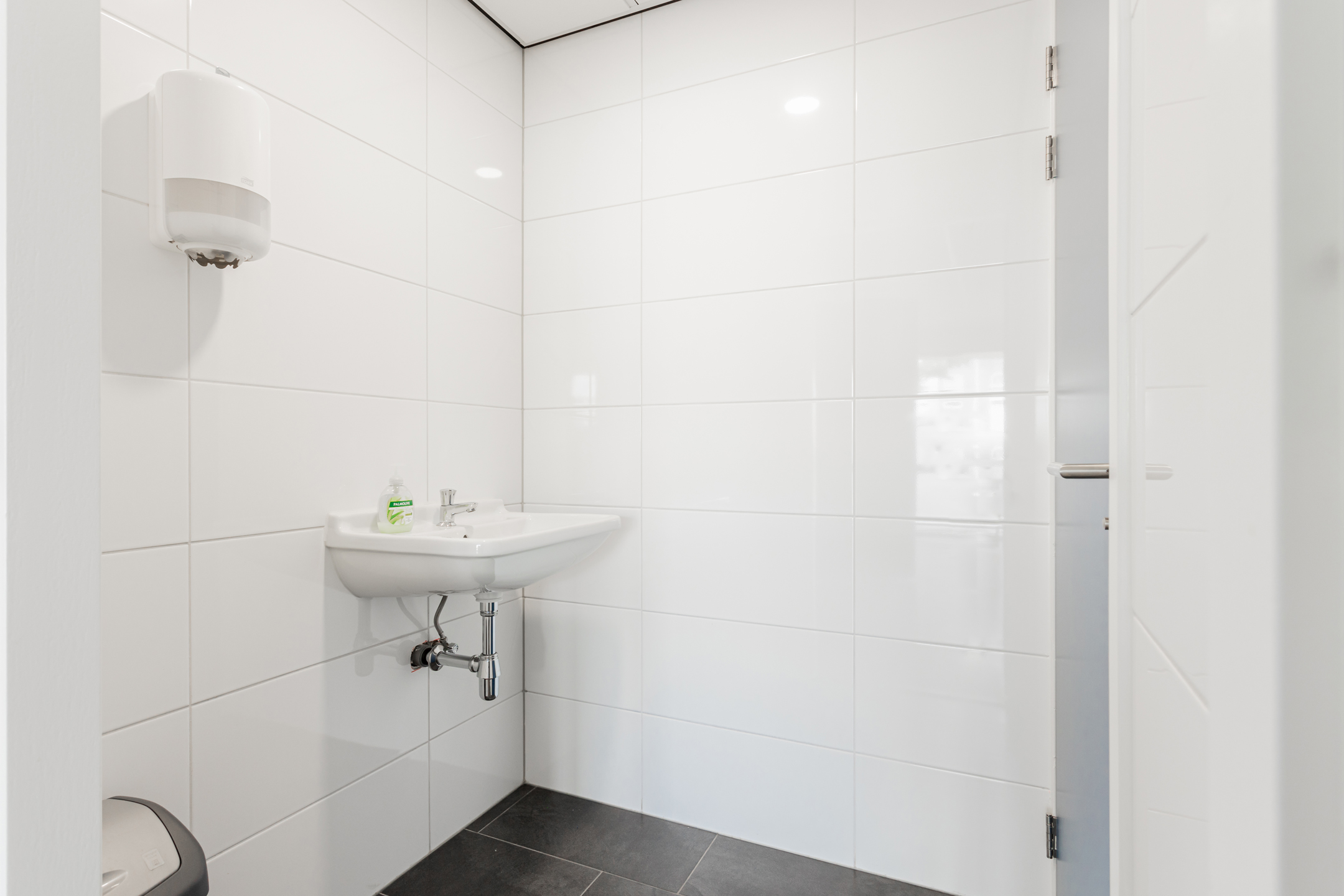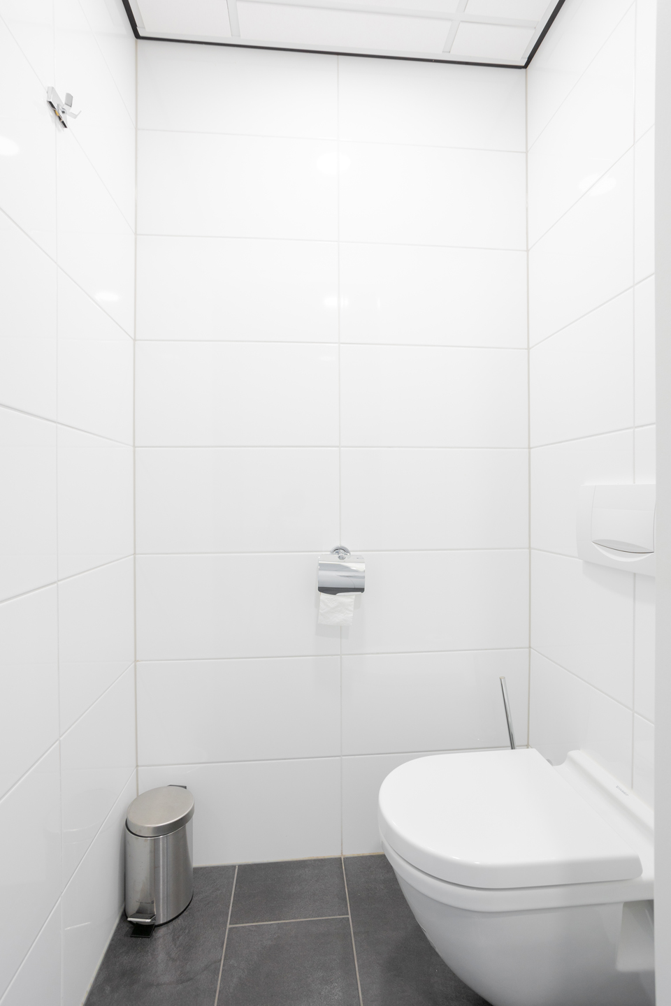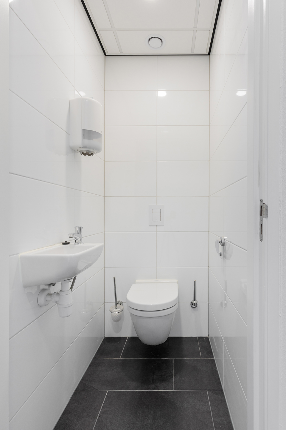 Systeemplafond met spotjes, pvc vloer, radiatoren, meerdere pantry's en meerdere toiletten met fontein.