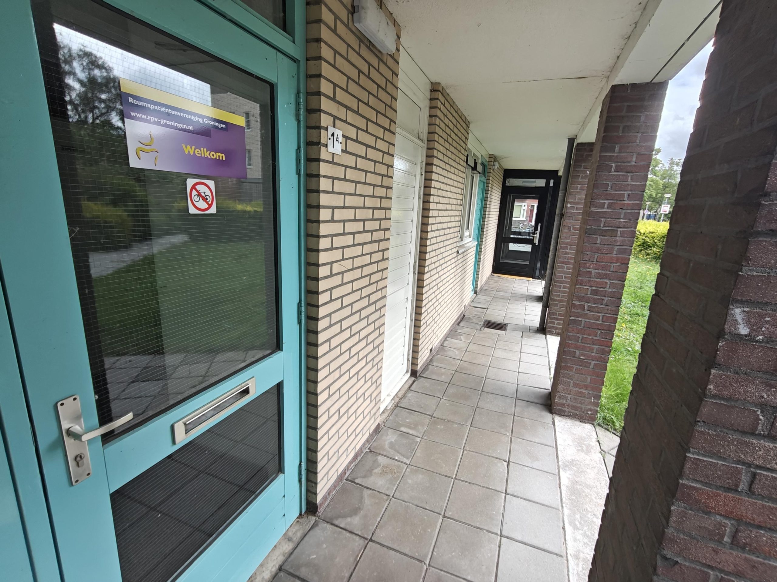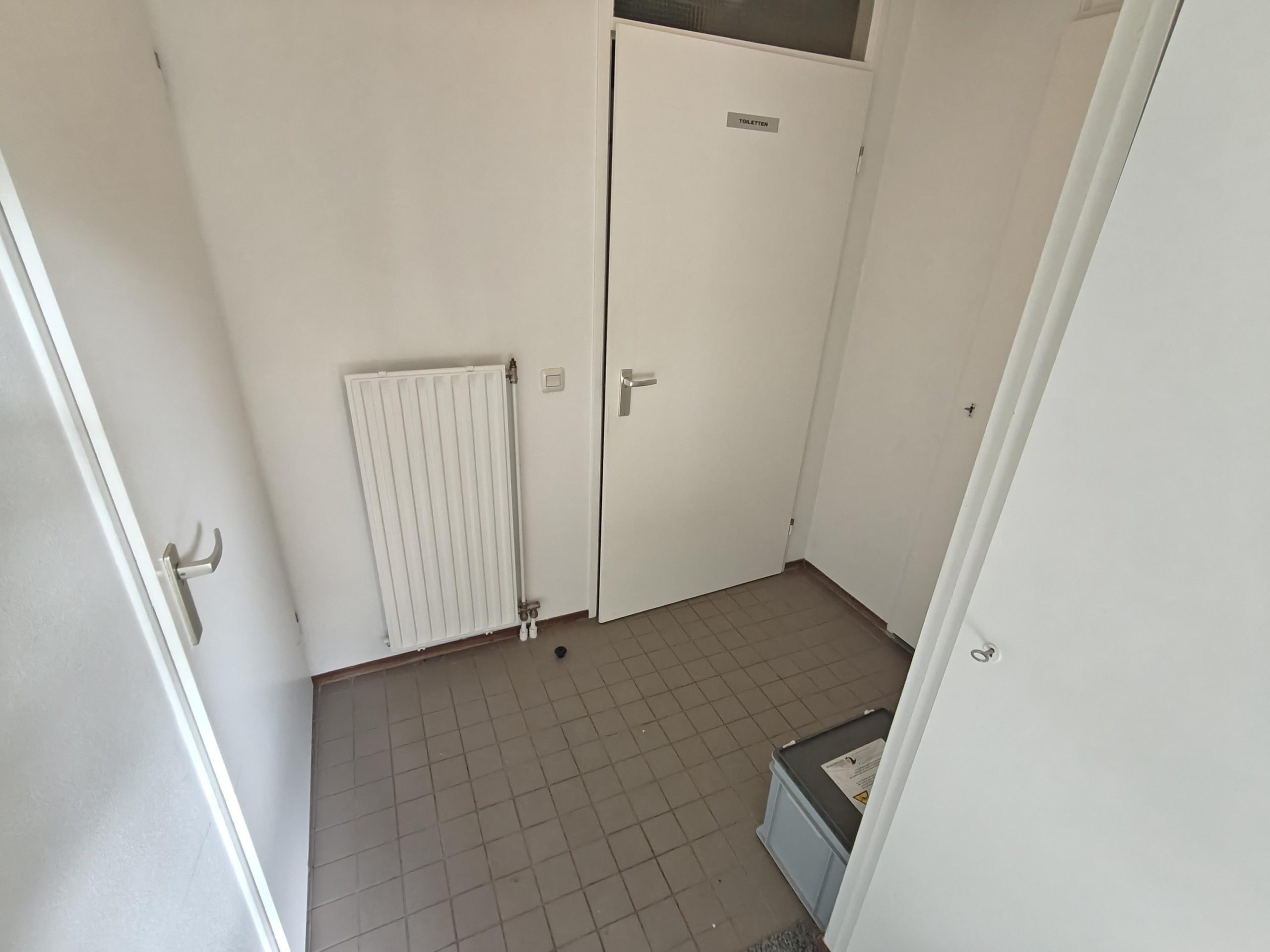 Entreedeur naar de hal, vanuit de hal zijn de twee toiletten en de royale kantoor/praktijkruimte te bereiken.