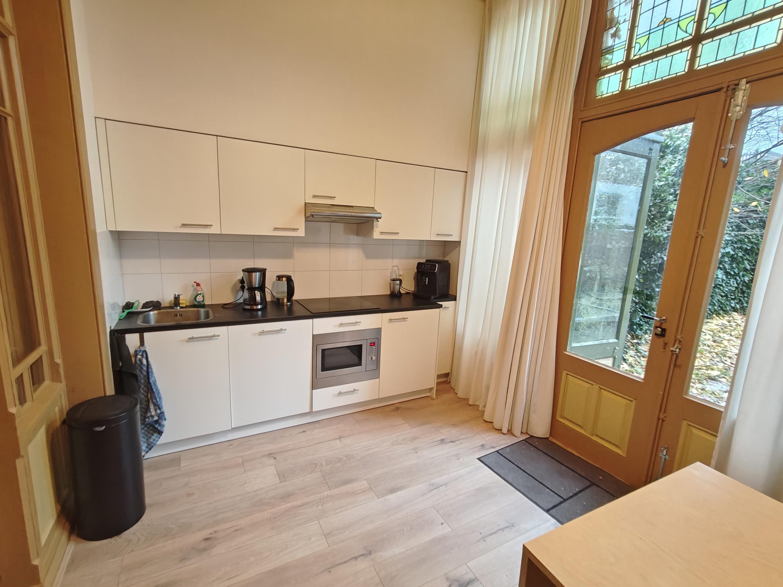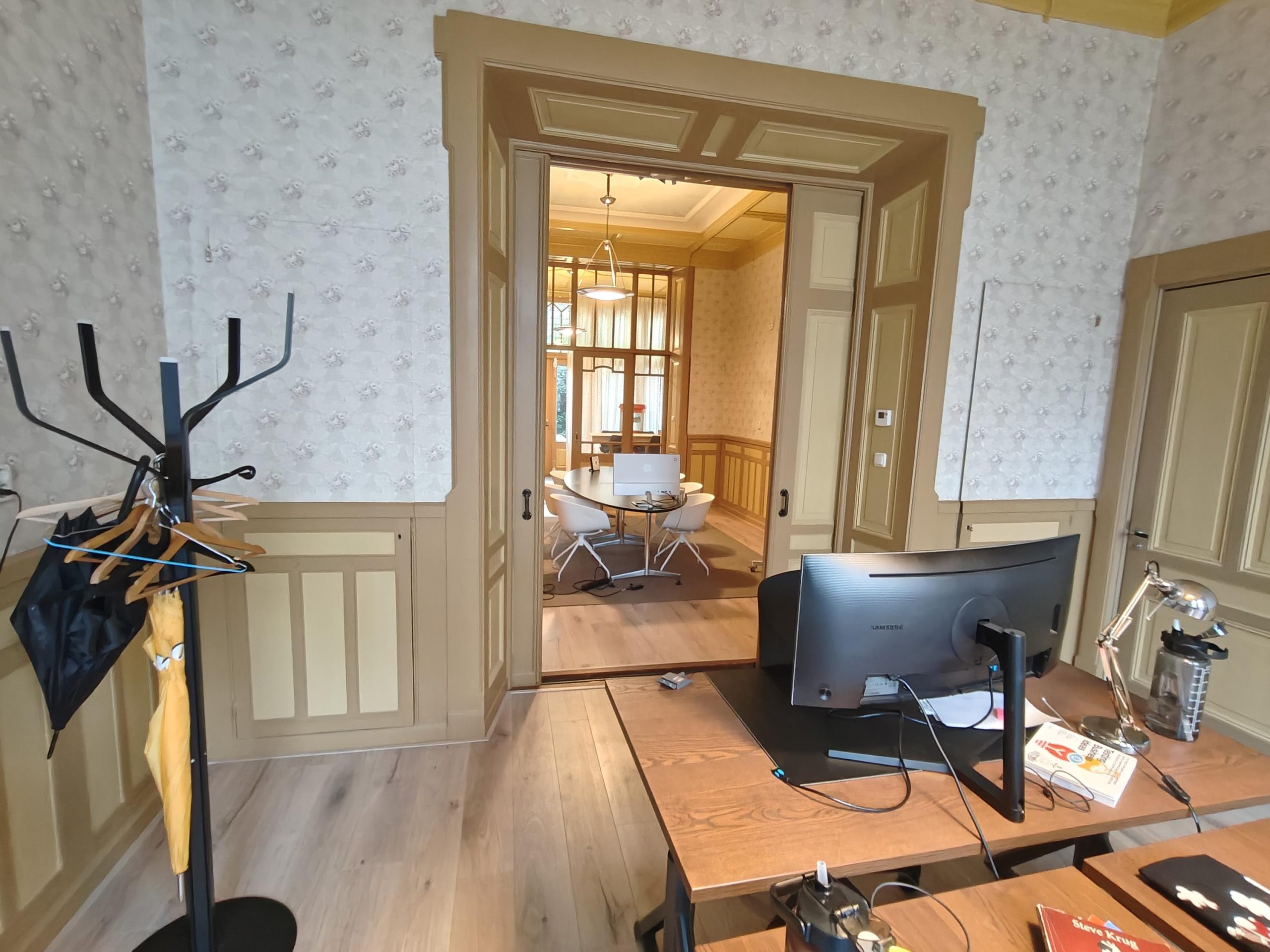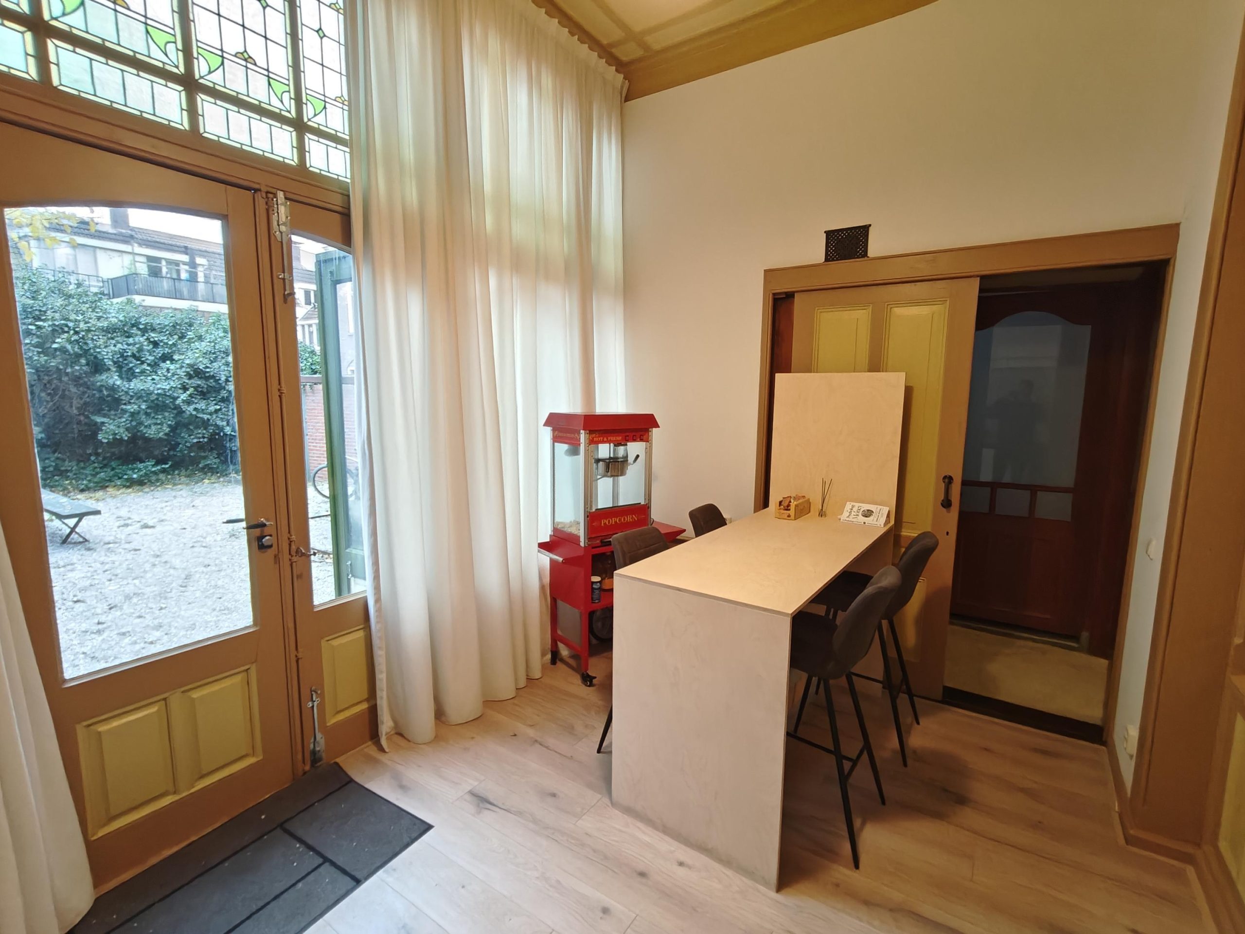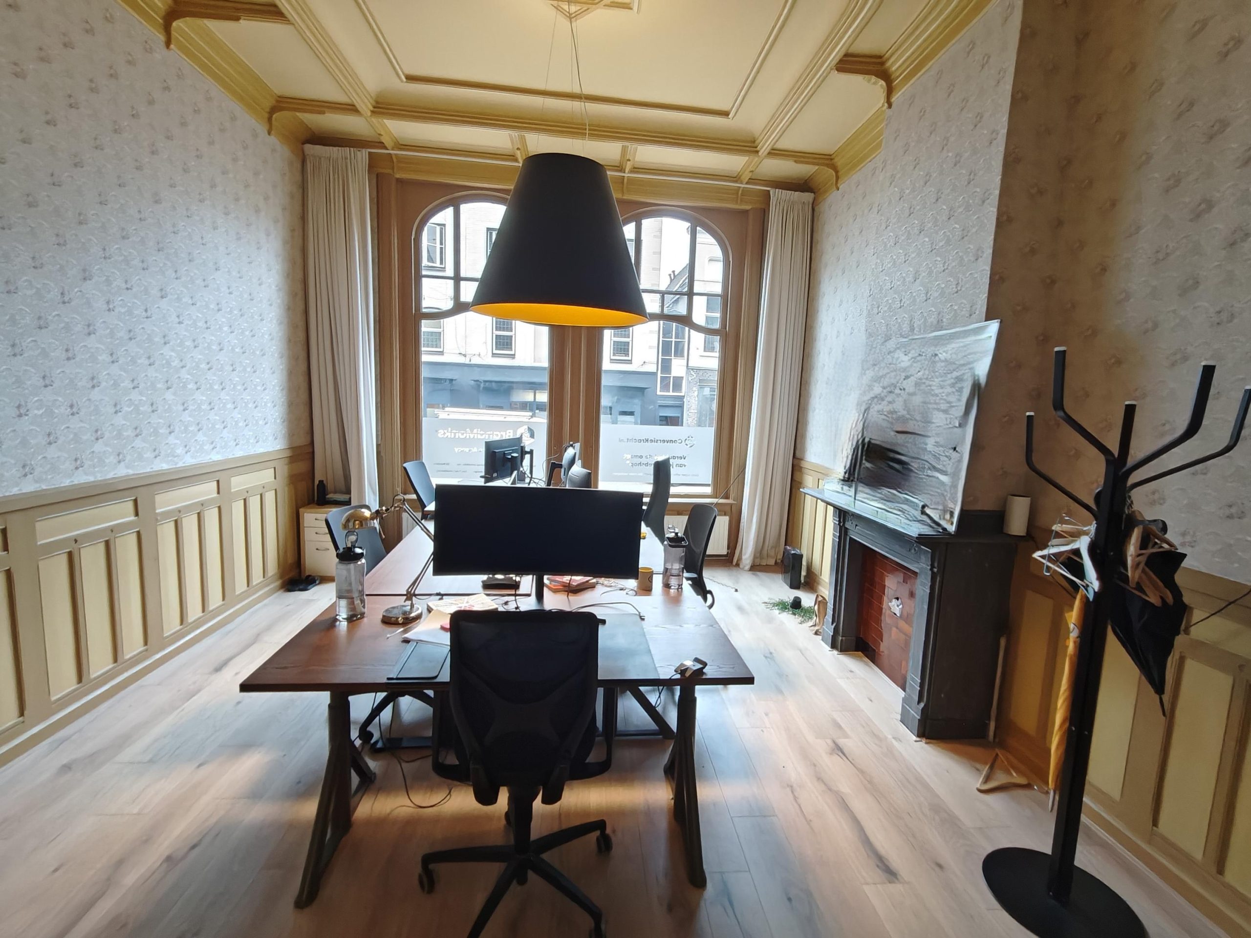 Cv-ketel met radiatoren, elektra, keuken, schuifdeuren tussen beide kantoorruimtes, openslaande tuindeuren, stadstuin, 1 parkeerplaats (tegen betaling) en originele elementen aan het pand.