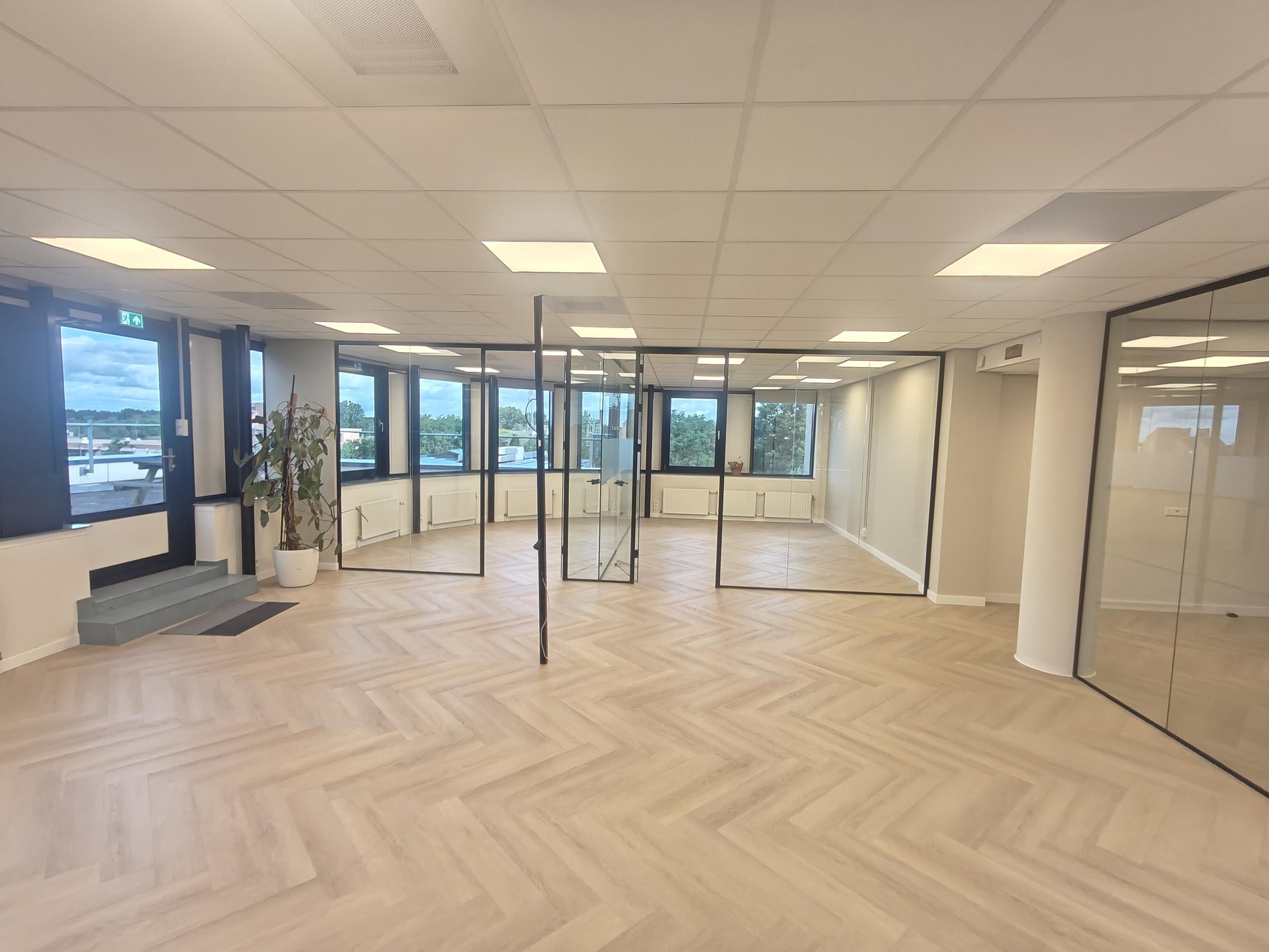 Visgraatvloer, systeemplafond met LED-panelen, kamerindeling, cv-ketel met radiatoren, lift, kabelgoten met voldoende stroompunten, (brand)alarm, trappenhuis, pantry en een gedeelde toiletgroep.