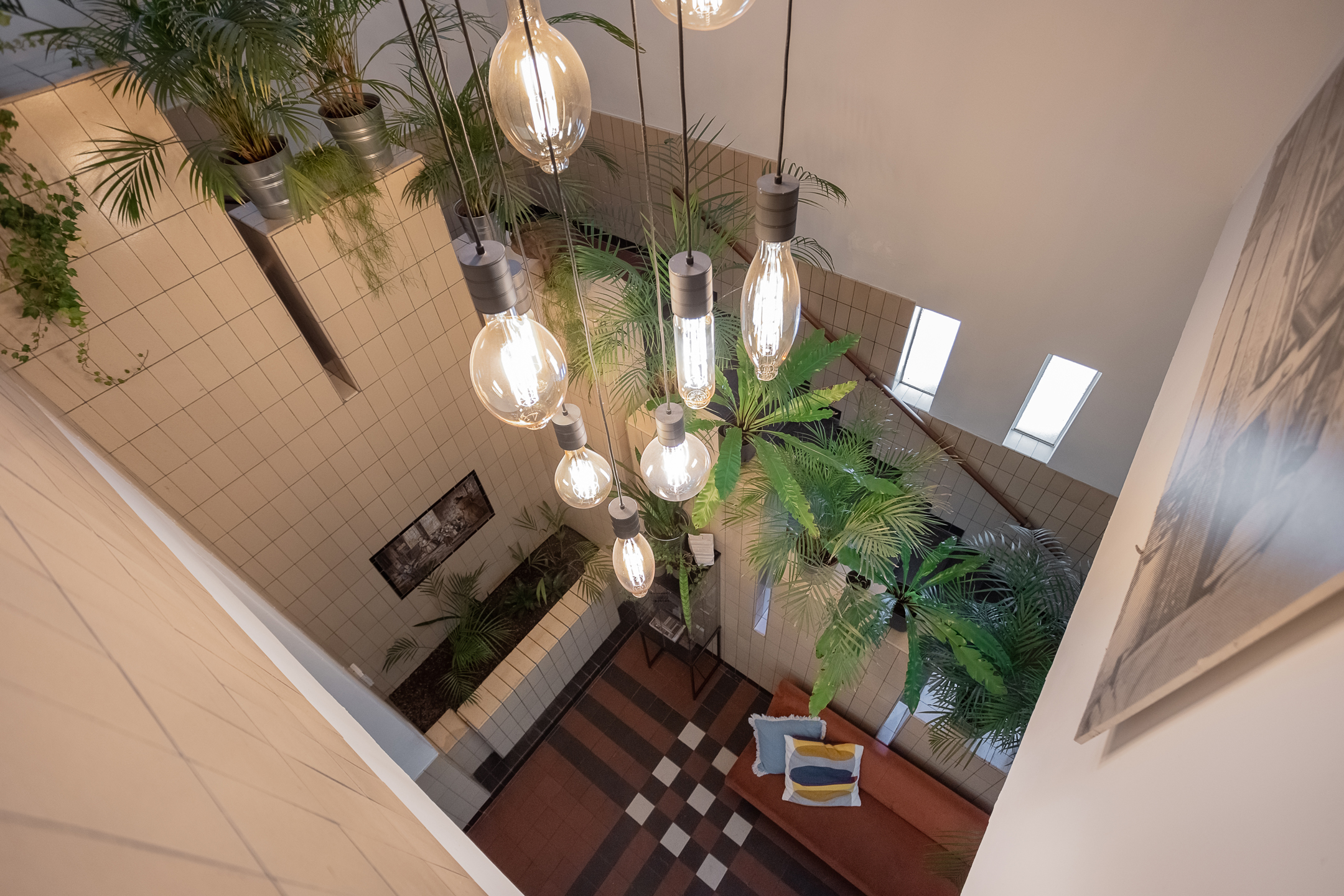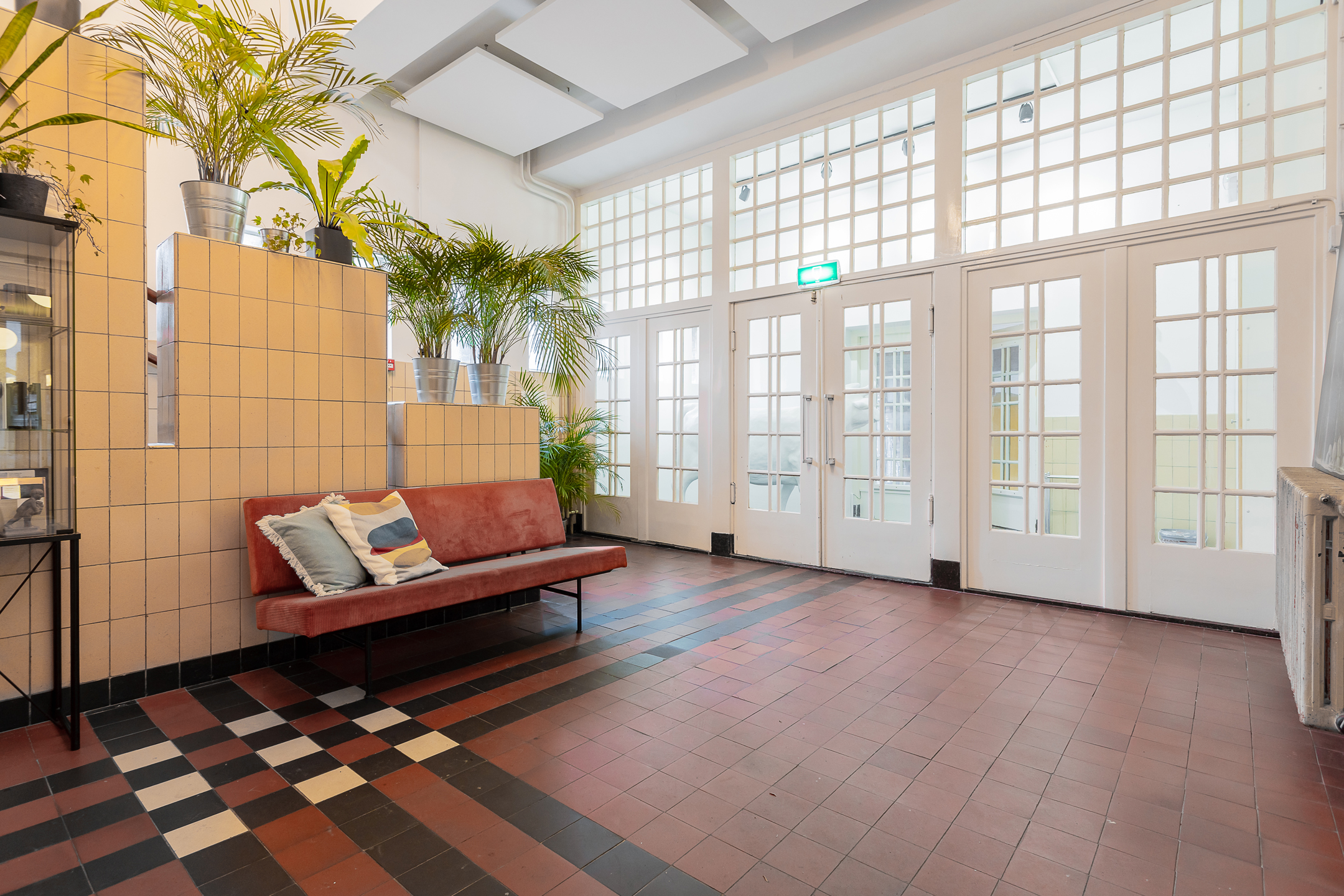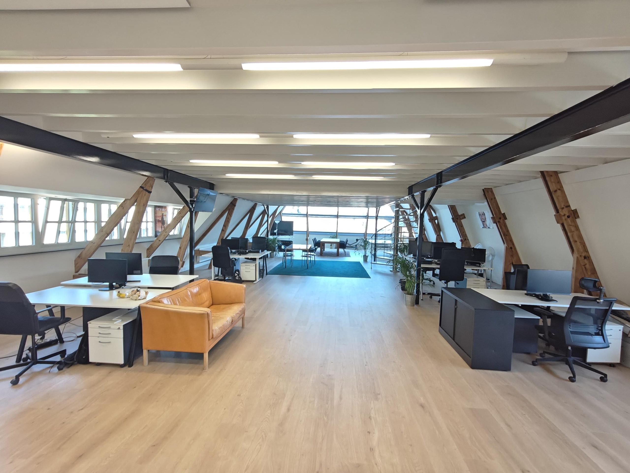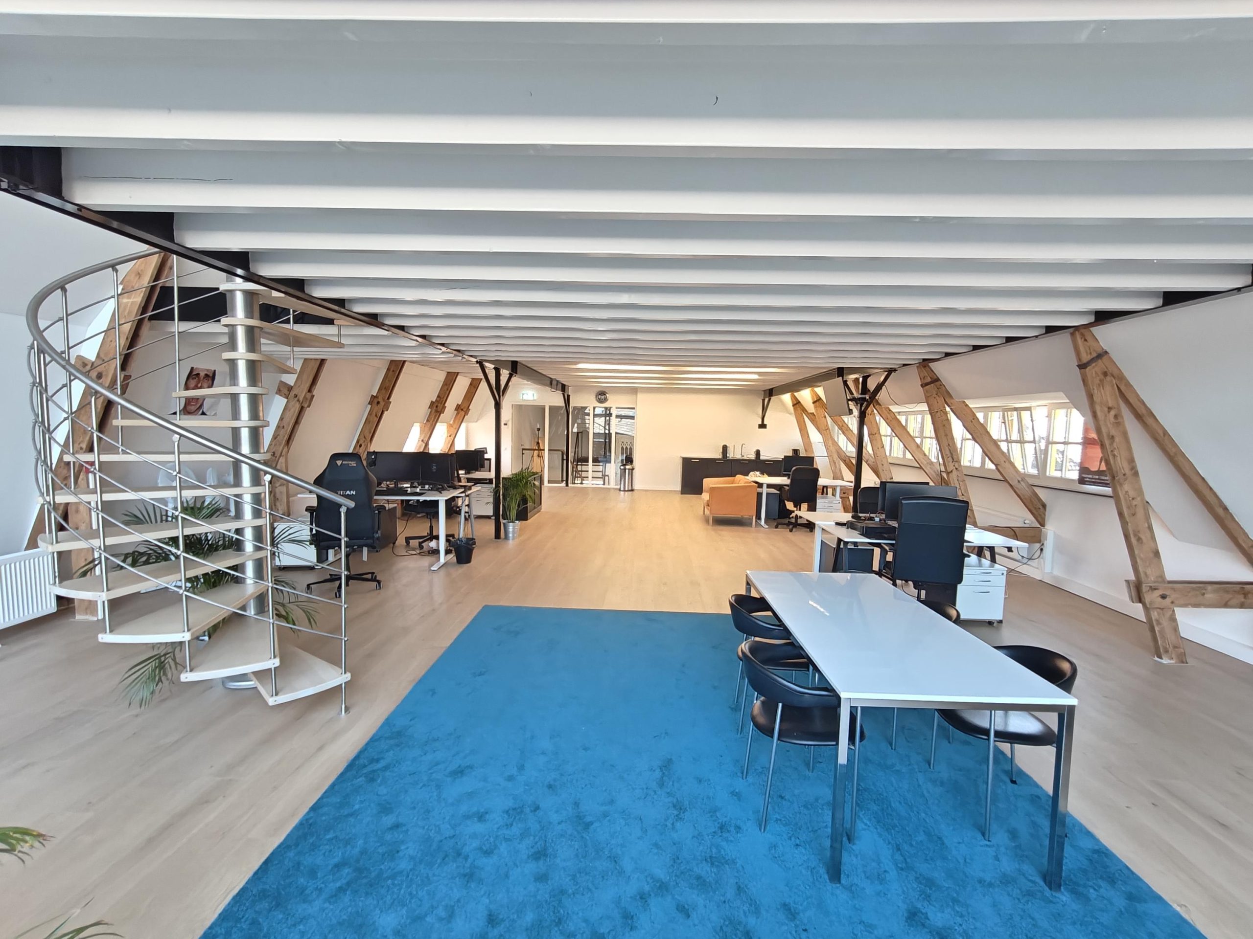 2e verdieping: Gemeenschappelijke overloop met toegang tot de ruime kantoorruimte, toiletten en de vergaderruimte.