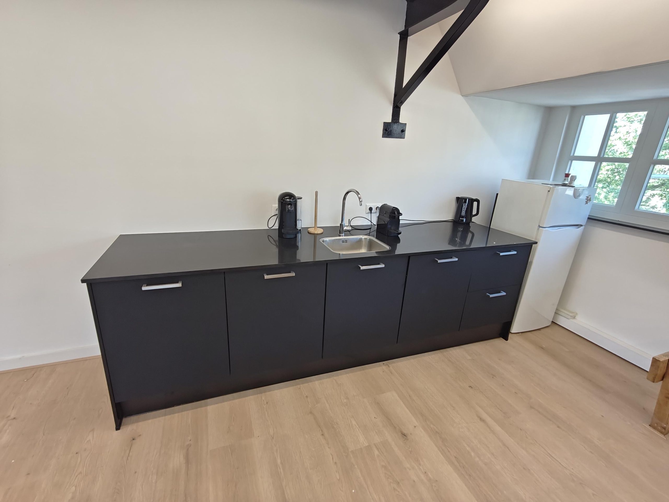 Mooie vloer, Cv-ketel met radiatoren, Coax en ADSL kabels voor internet, kabelgoten, pantry en toilet met urinoir.