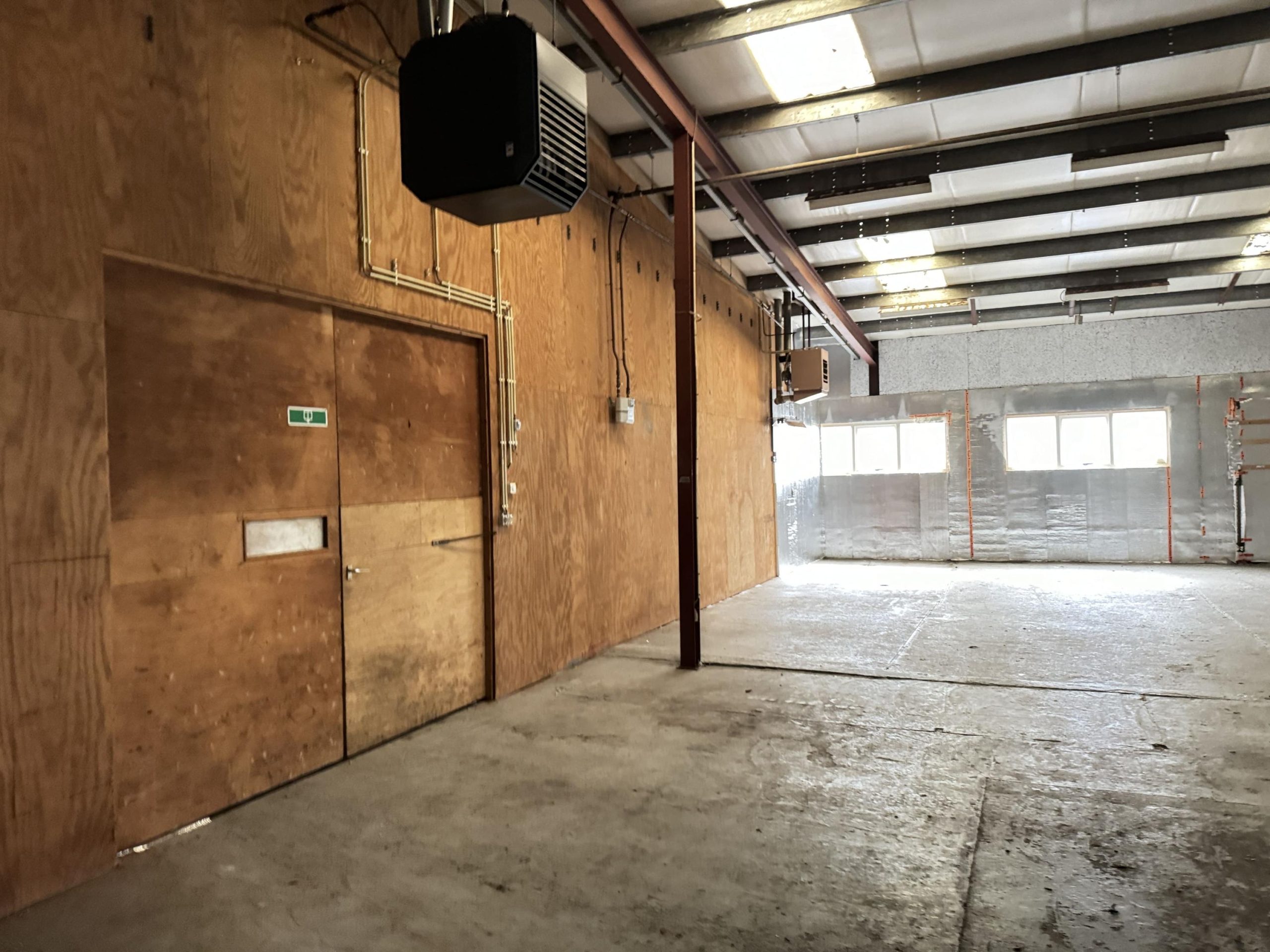 Bedrijfsruimte: meerdere overheaddeuren, heaters, betonvloer, 42 zonnepanelen en tl-verlichting.