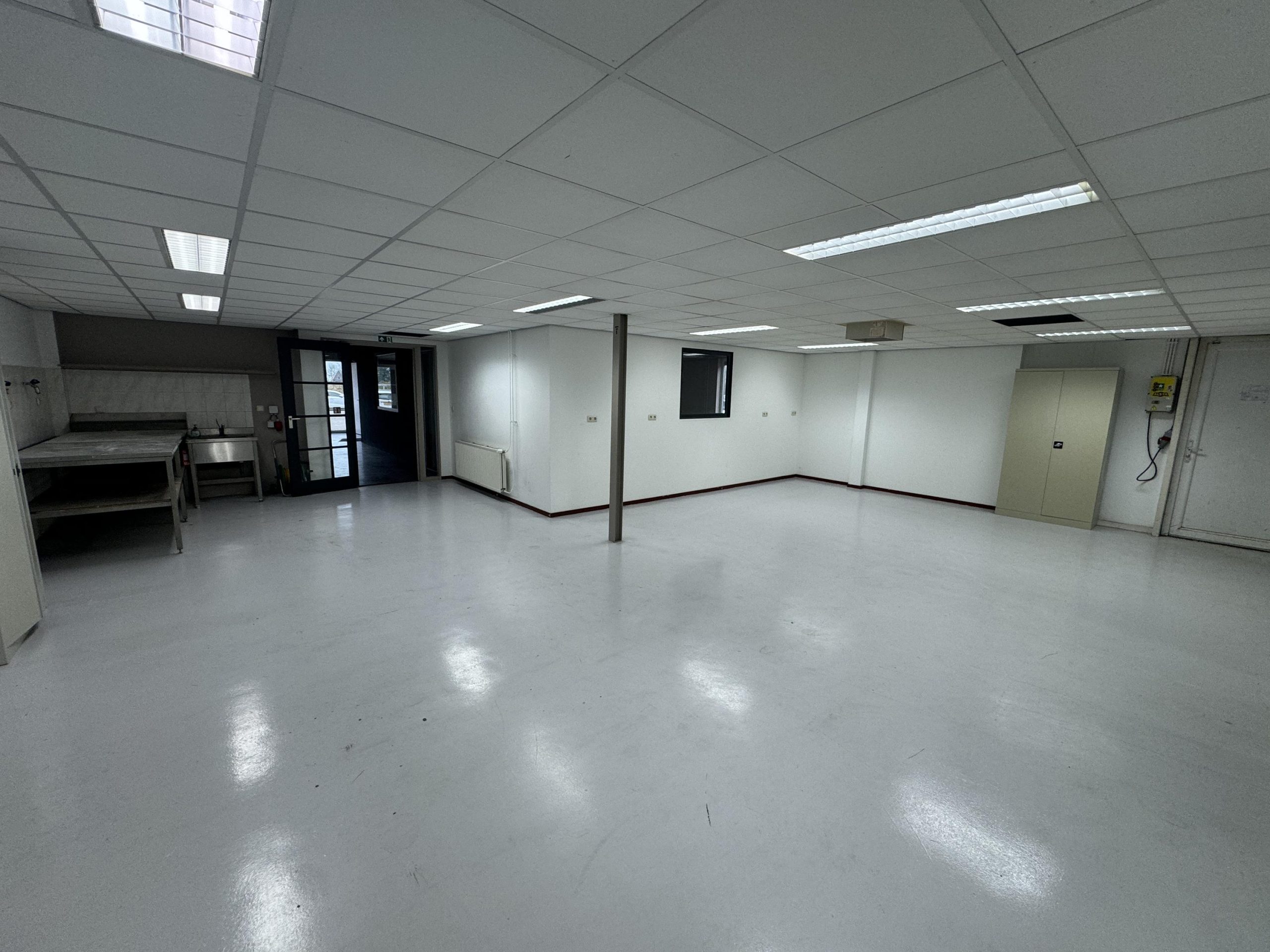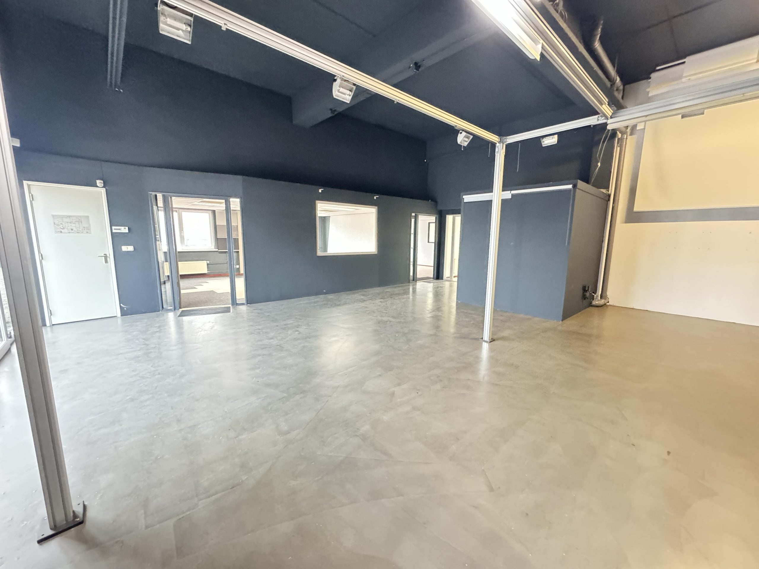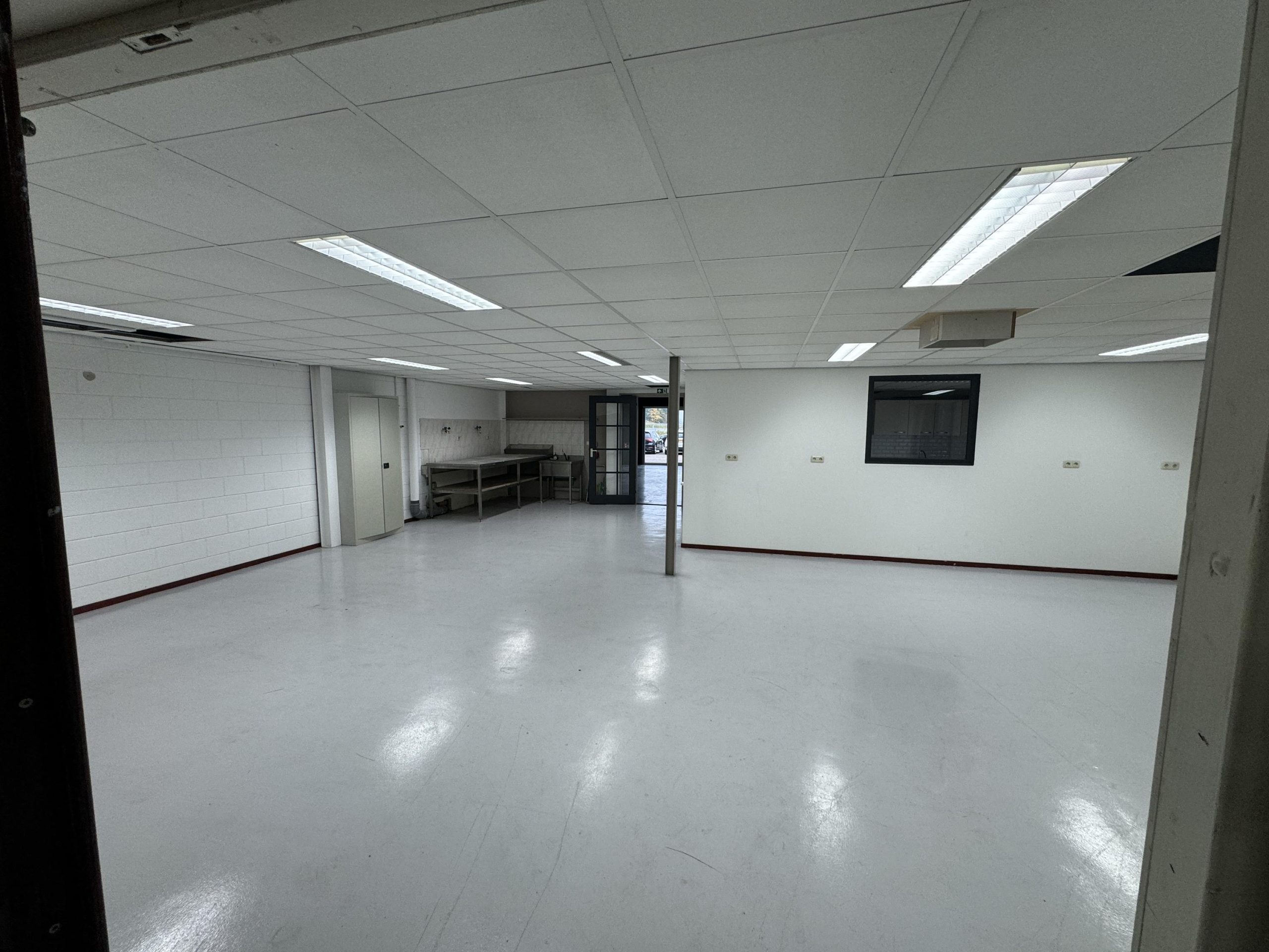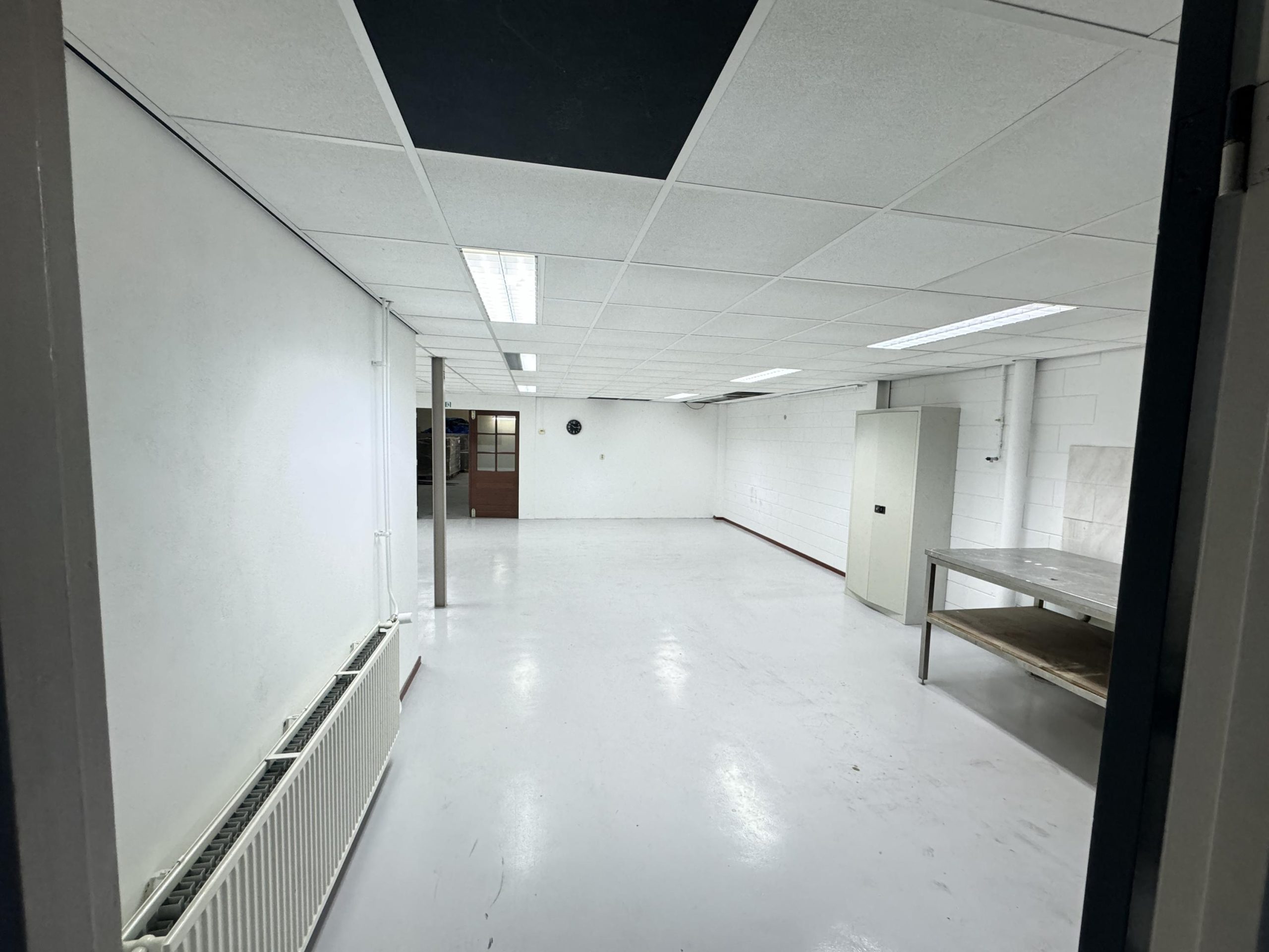 Overheaddeur, krachtstroom, systeemplafond met armaturen, vloerbedekking (gedeeltelijk), Cv-ketel met radiatoren, pantry en toiletten met fontein.