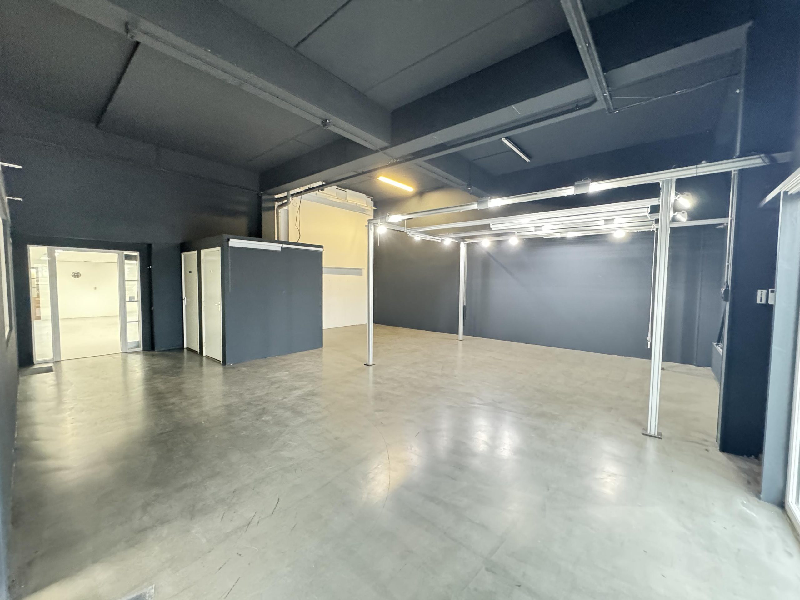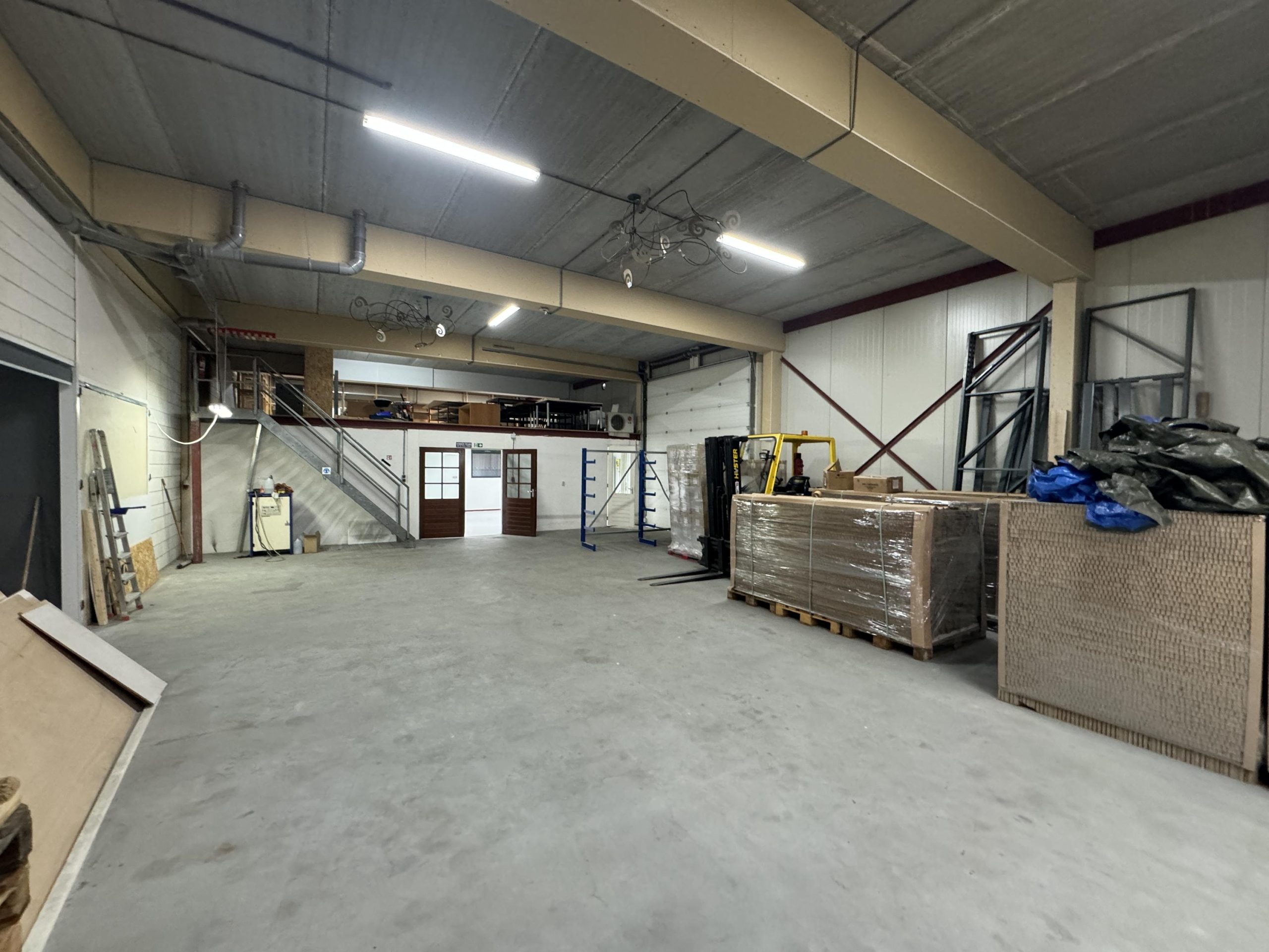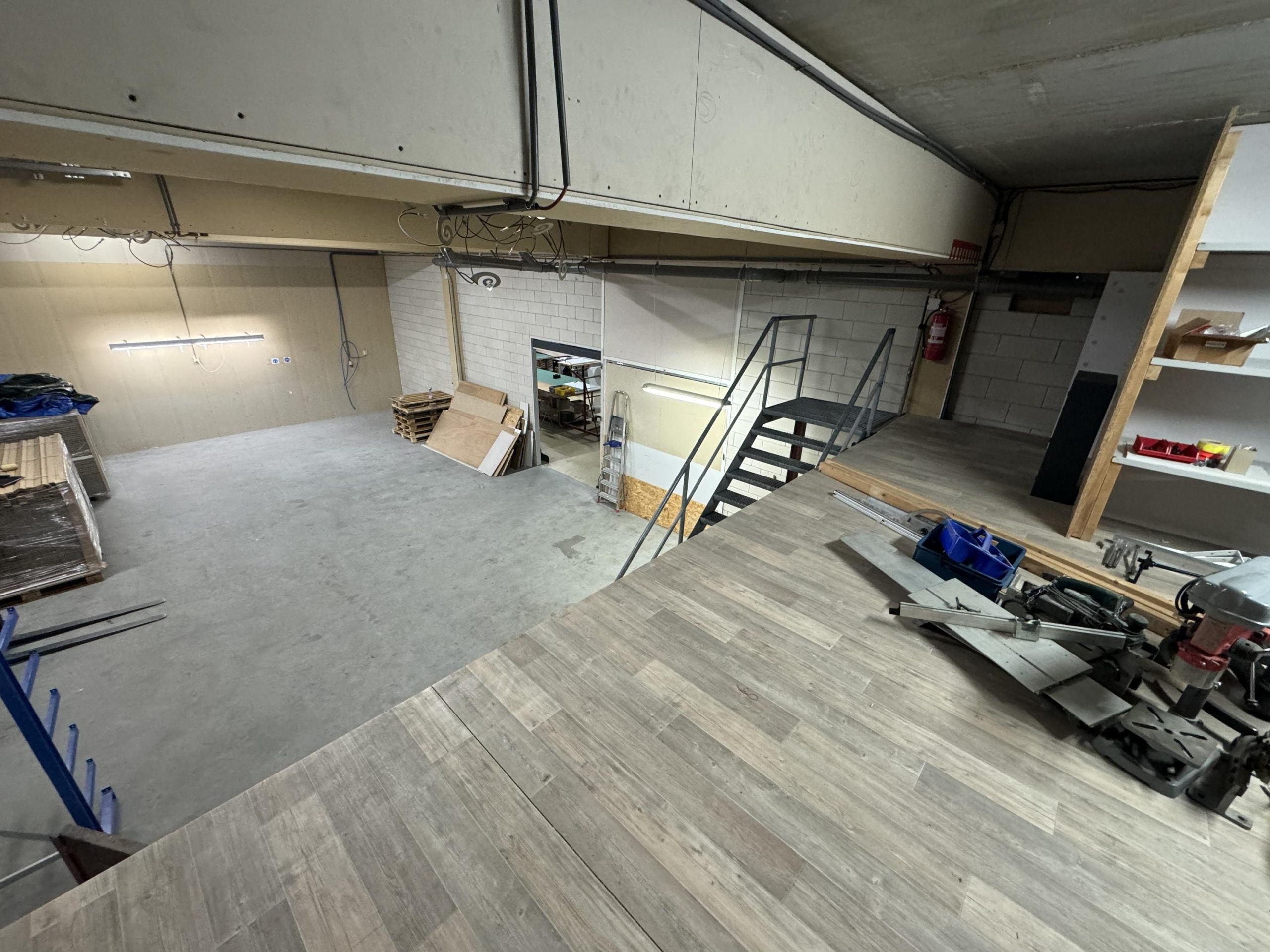 Overheaddeur, krachtstroom, systeemplafond met armaturen, vloerbedekking (gedeeltelijk), Cv-ketel met radiatoren, pantry en toiletten met fontein.